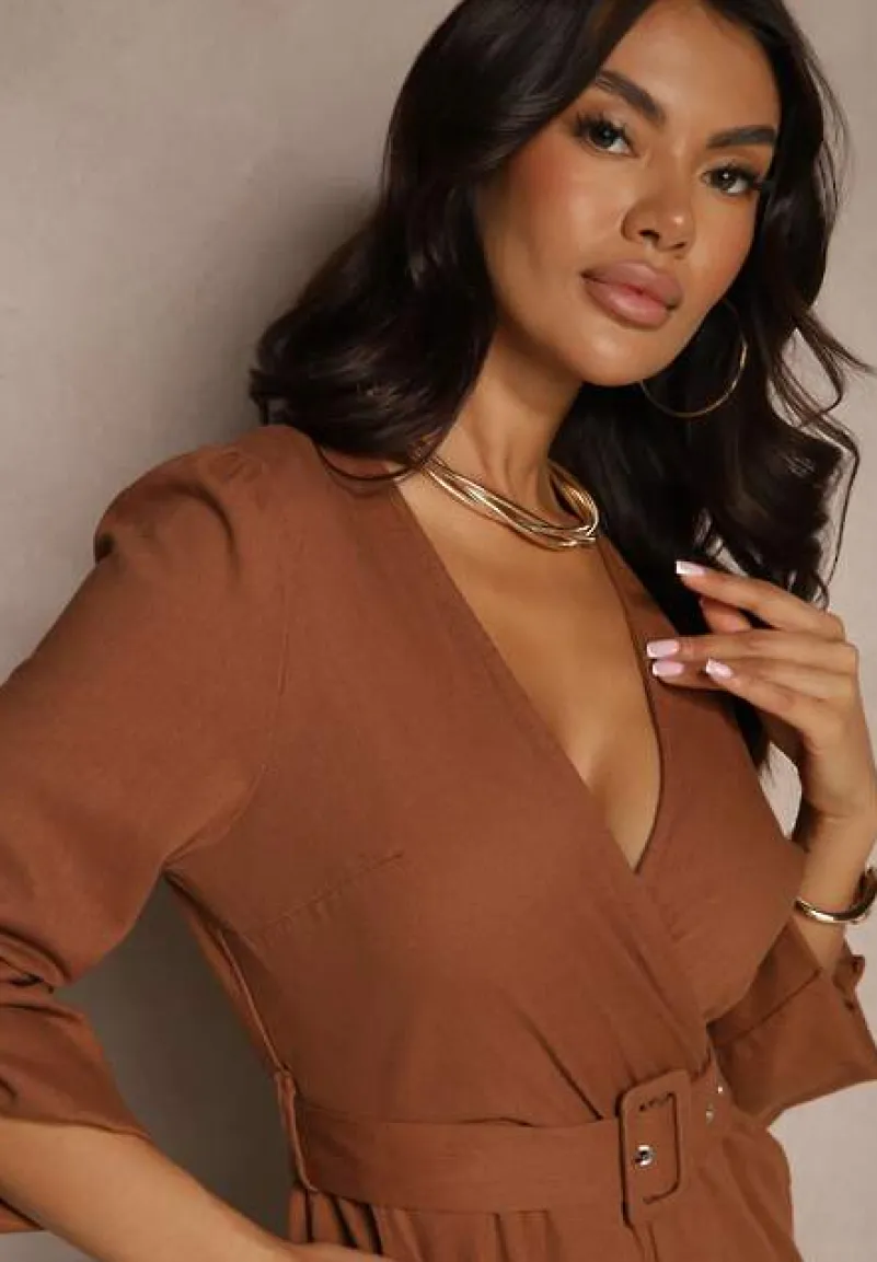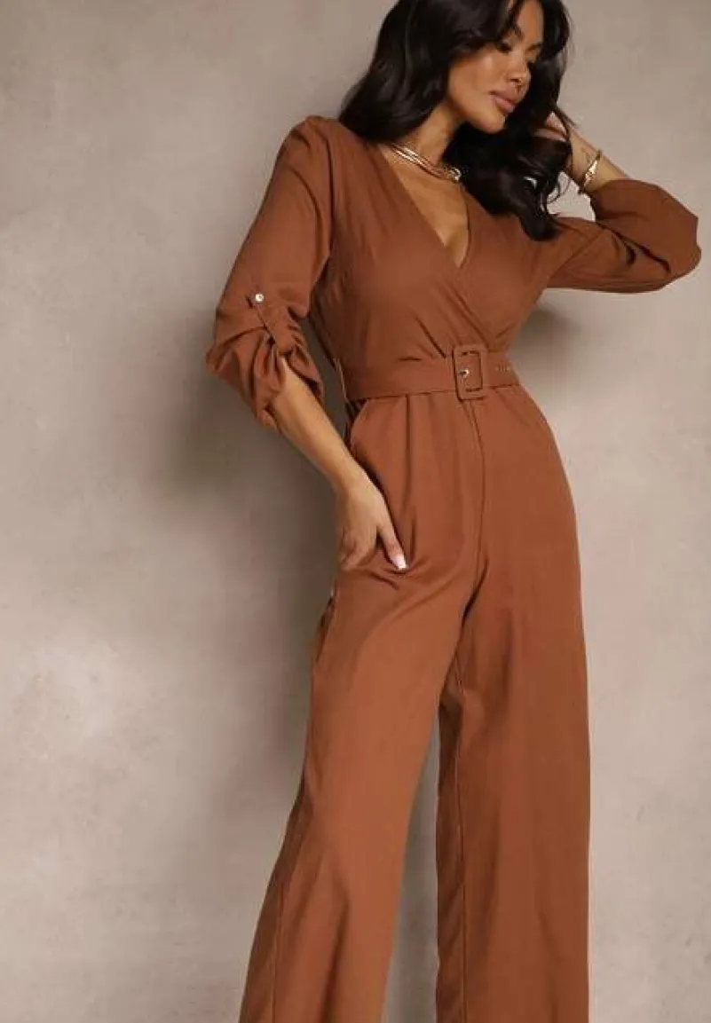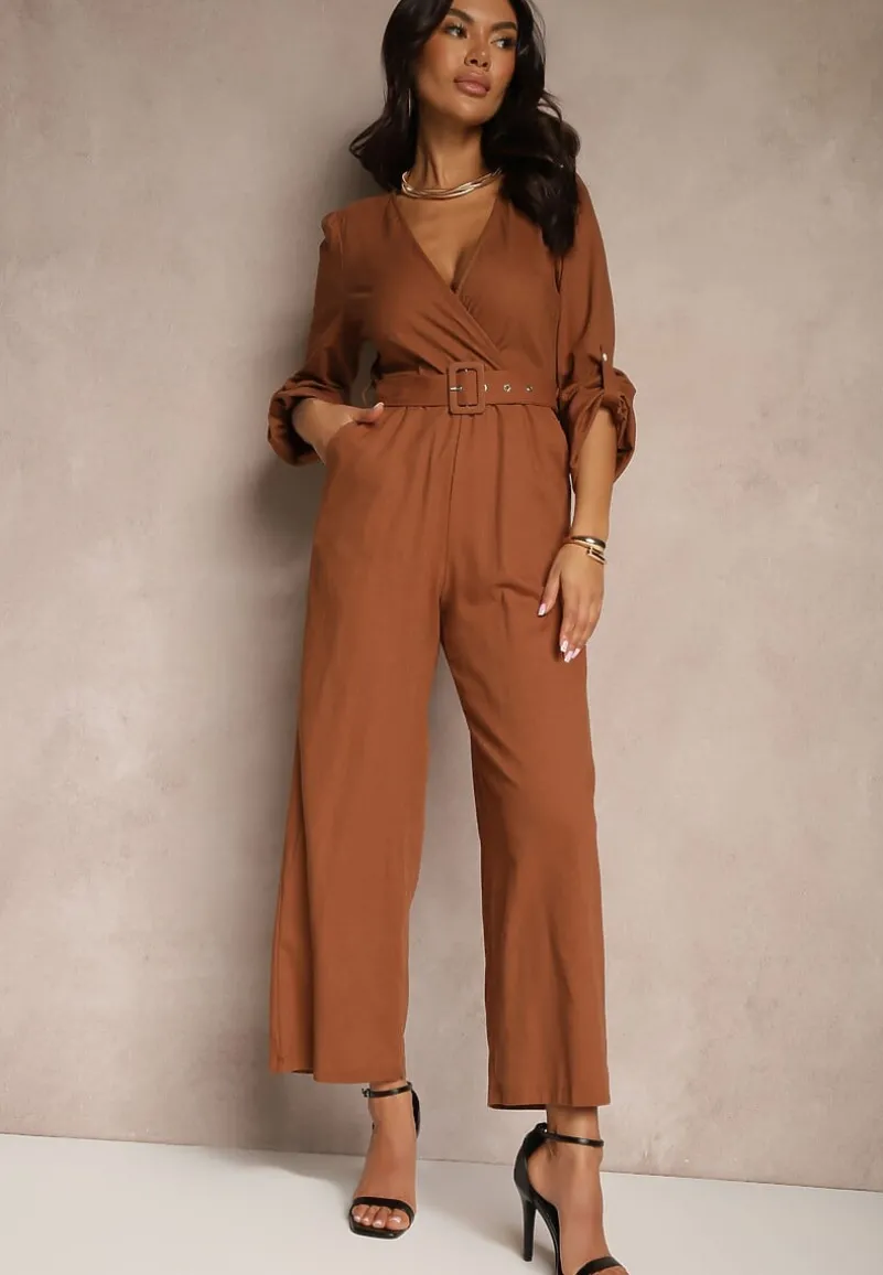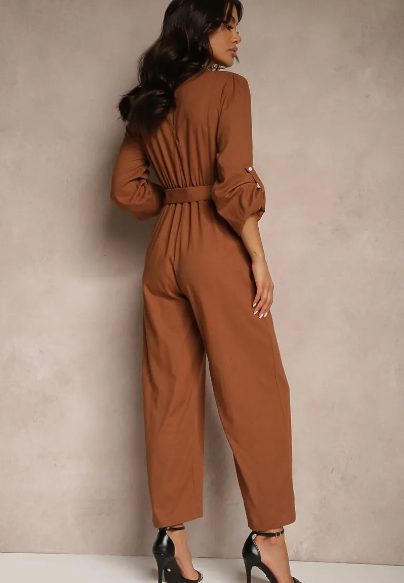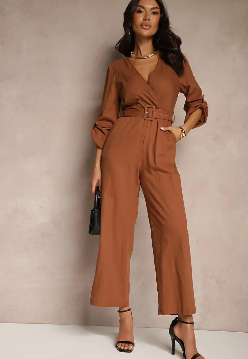 Brązowy Kopertowy Kombinezon z Bawełny z Dodatkowym Paskiem i Gumką w Talii Rinnarela