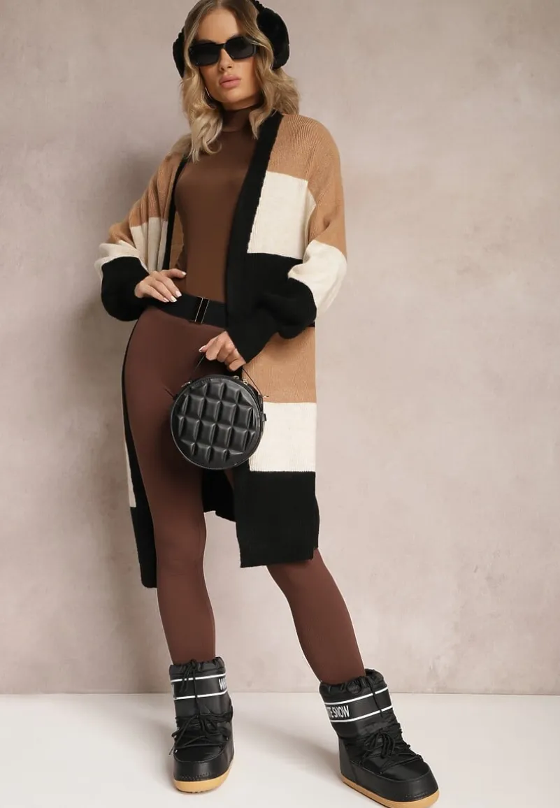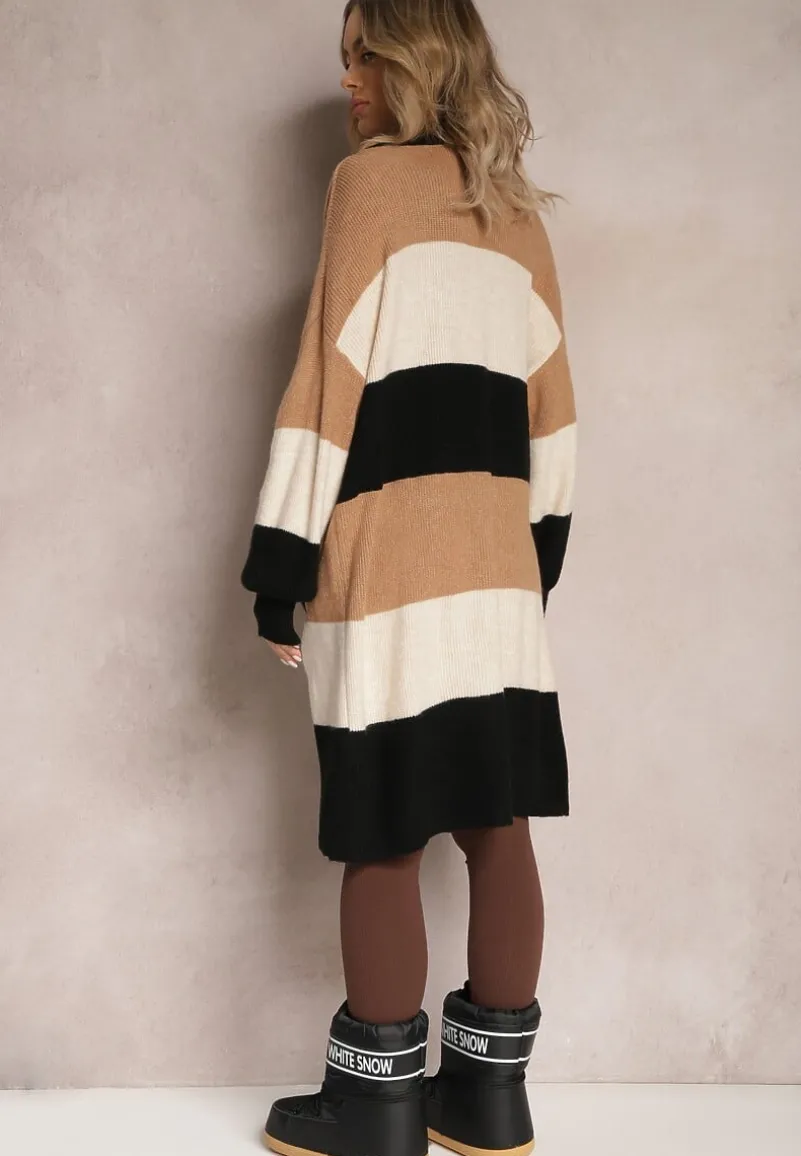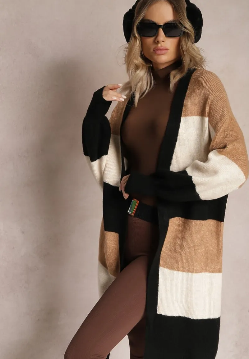 Kardigan Blikoze o niezapinanym, luźnym fasonie. Wykonany z dzianiny w paski. Długie rękawy wykończone elastycznym ściągaczem.