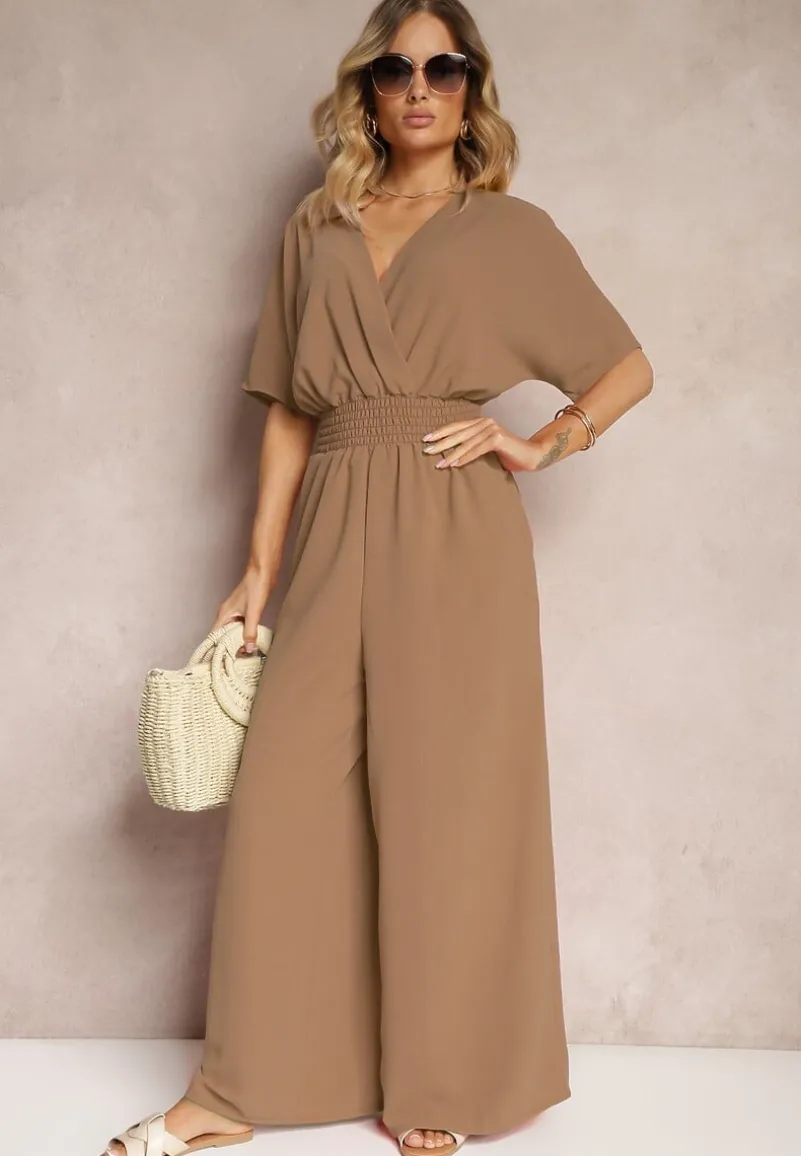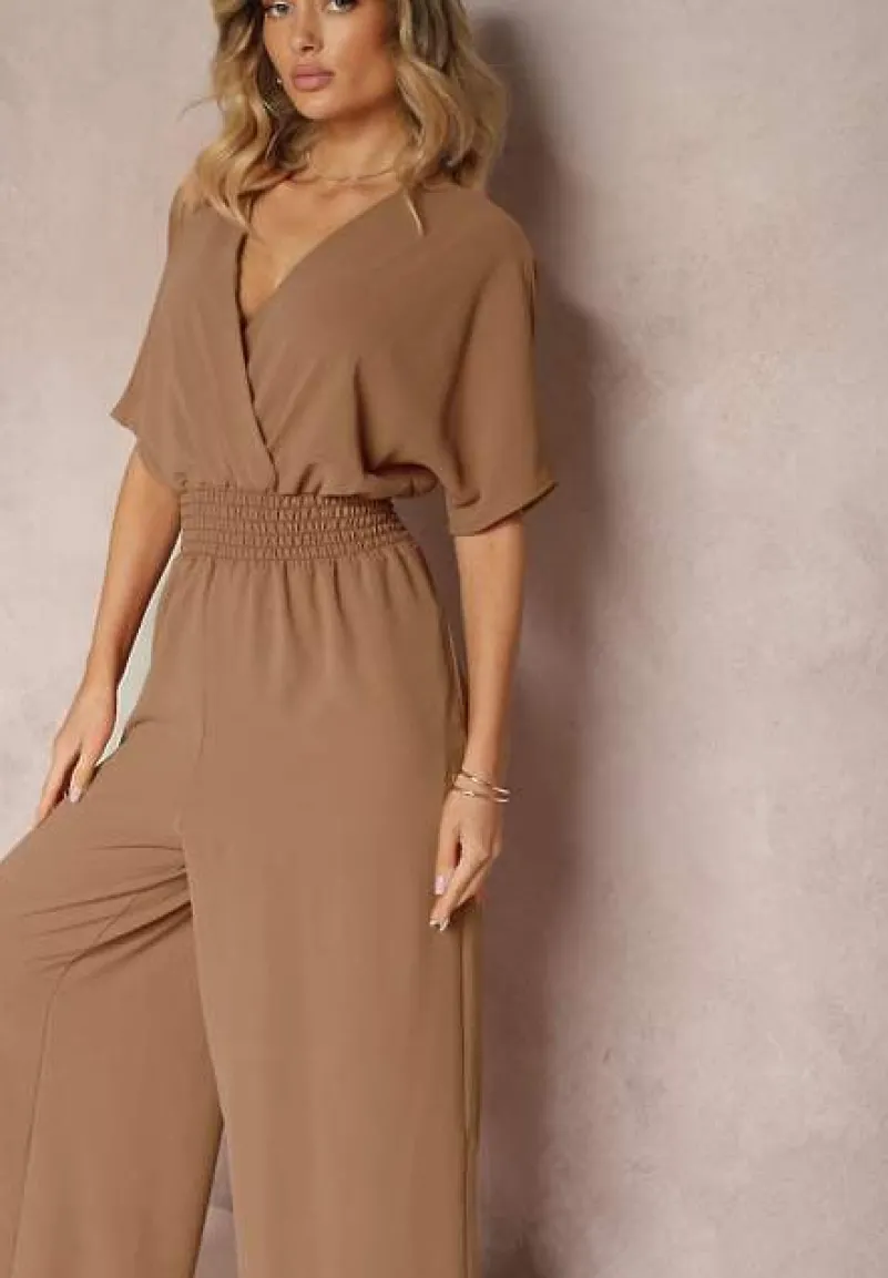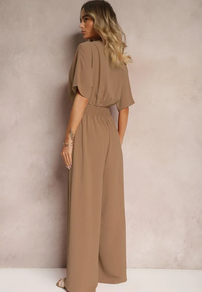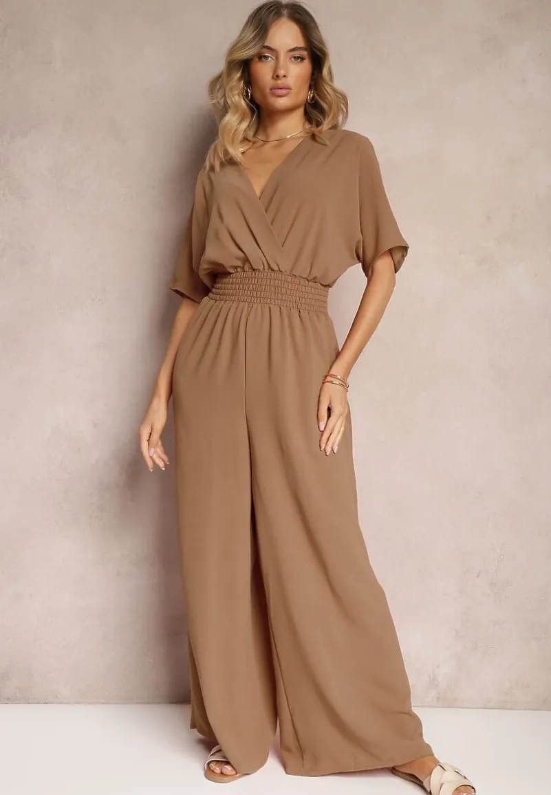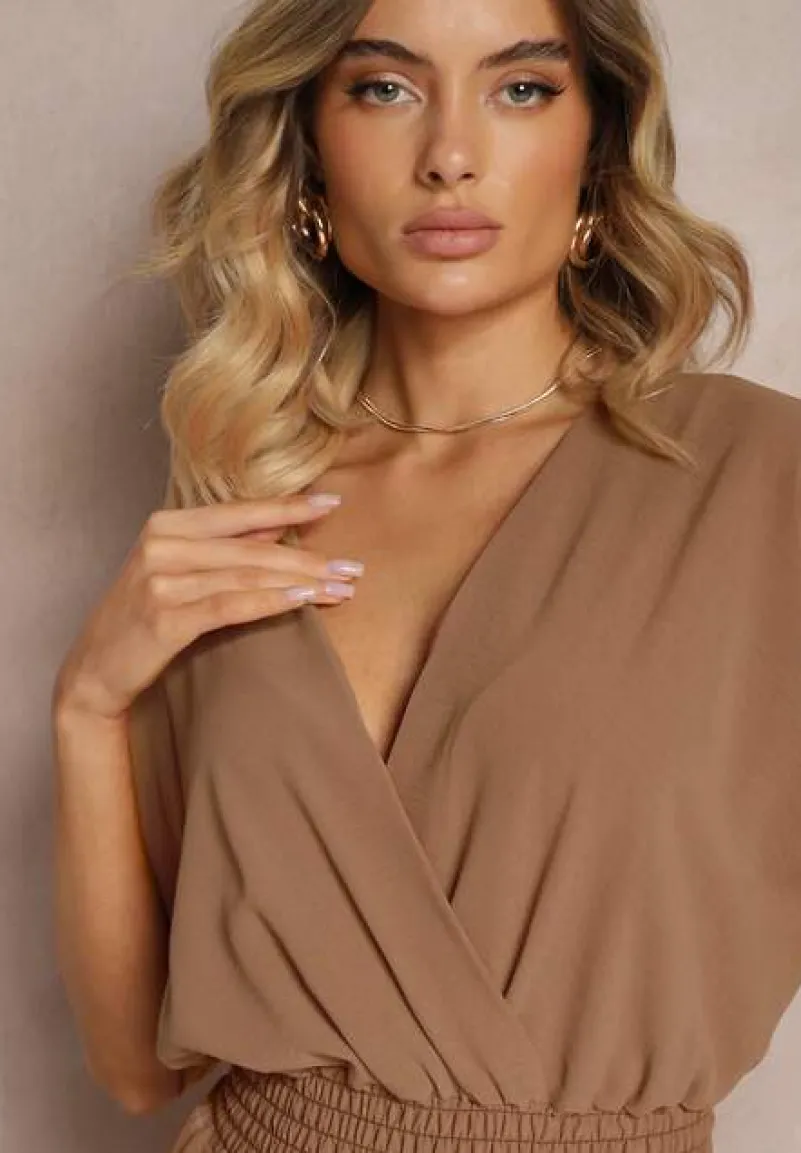 Brązowy Taliowany Kombinezon z Zakładkowym Dekoltem i Gumką w Pasie Vimalynna