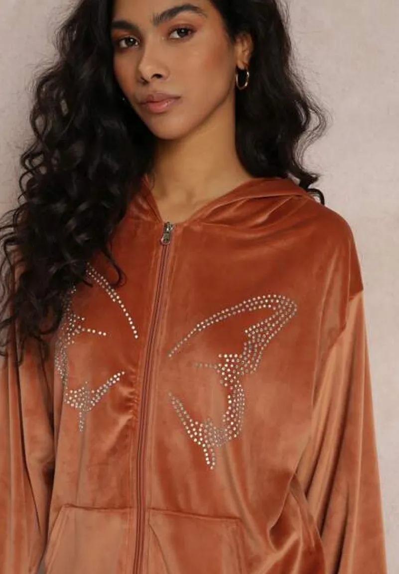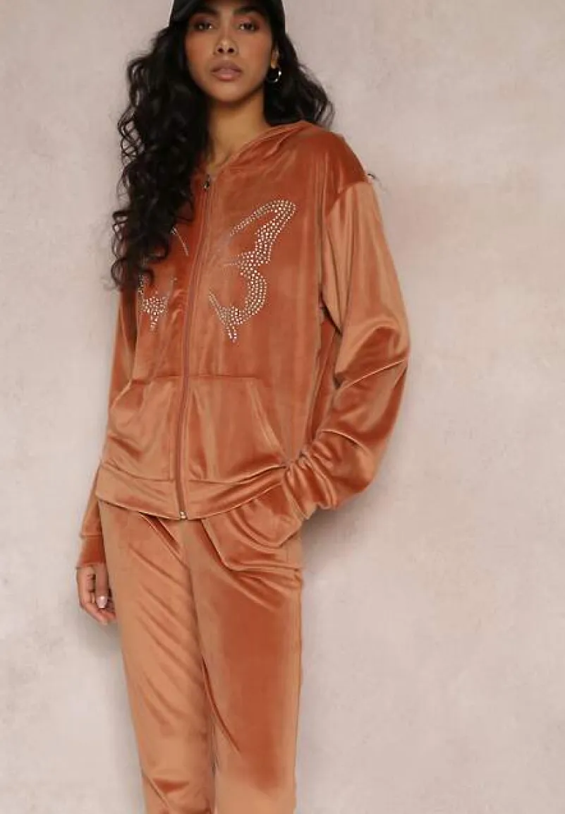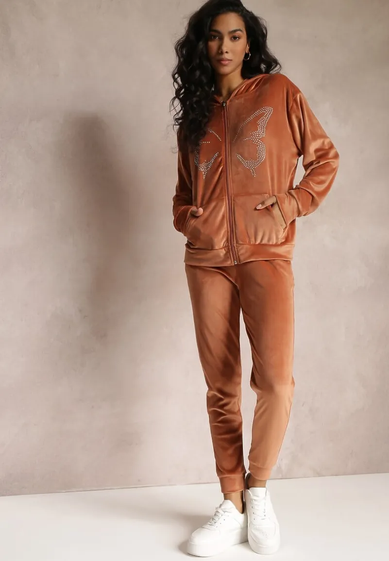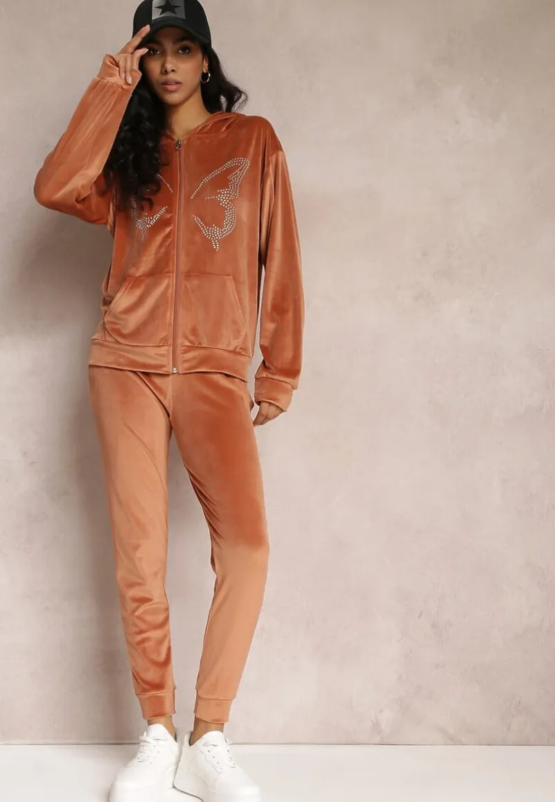 Przyciągaj zachwycone spojrzenia ze stylowym zestawem Athania! Dwuczęściowy, składa się z bluzy i spodni dresowych. Bluza z kapturem, zdobiona z przodu cyrkoniami. Zasuwana, posiada wsuwane kieszenie. Spodnie z elastyczną gumką w pasie. Na wysokości bioder również wsuwane kieszenie.