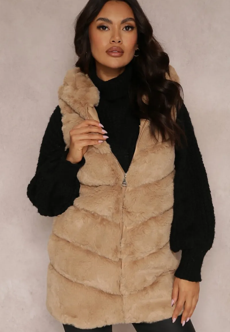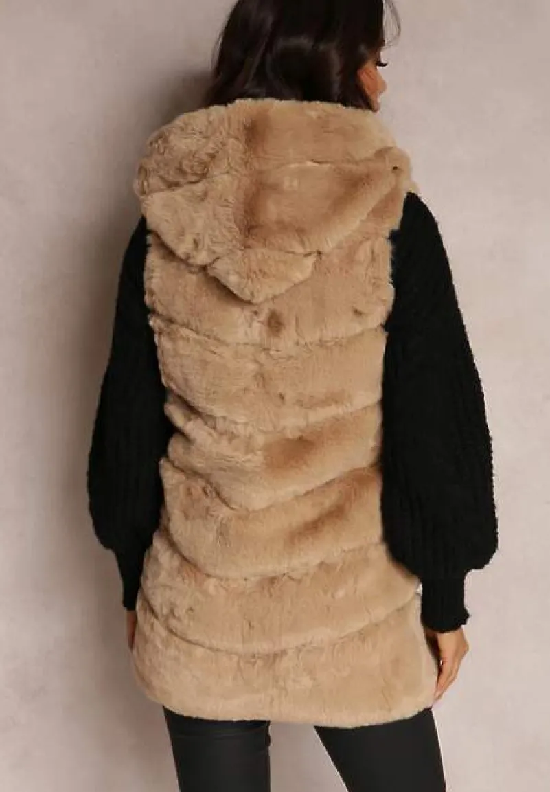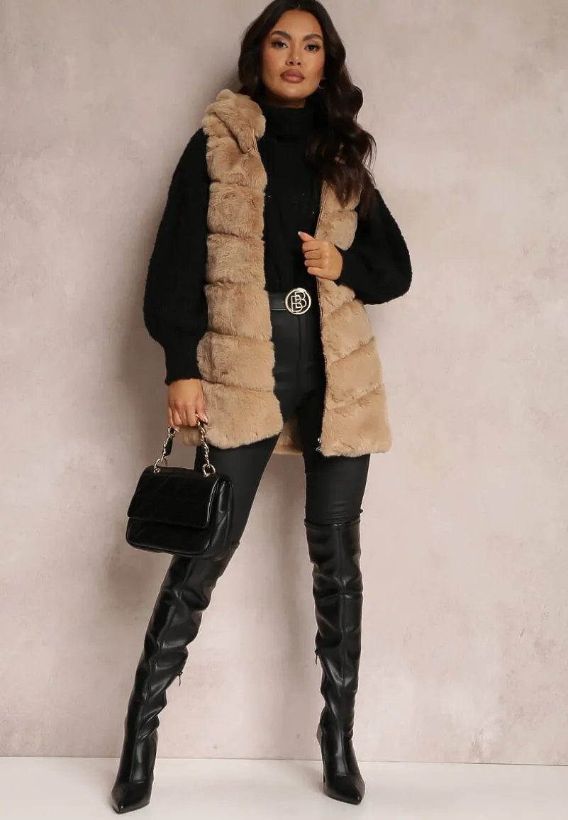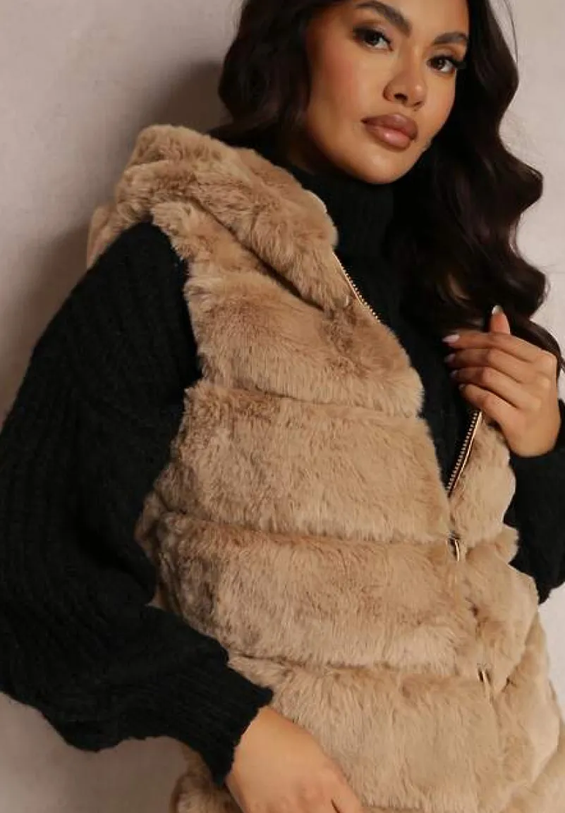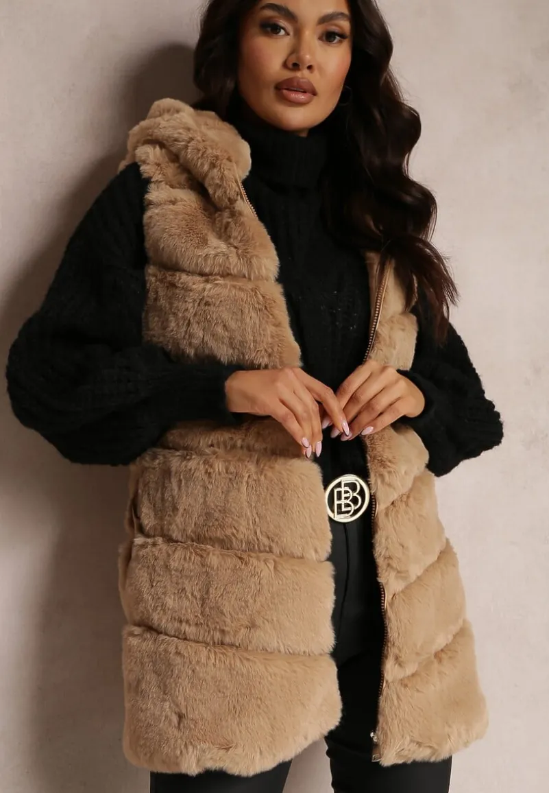 Futrzana kamizelka Nedelcu z kapturem zapinana na suwak. Na wysokości bioder niezasuwane kieszenie. Modna kamizelka Nedelcu ze sztucznego futerka idealna na jesień i zimę.