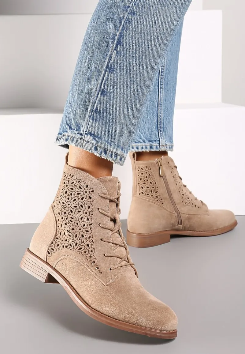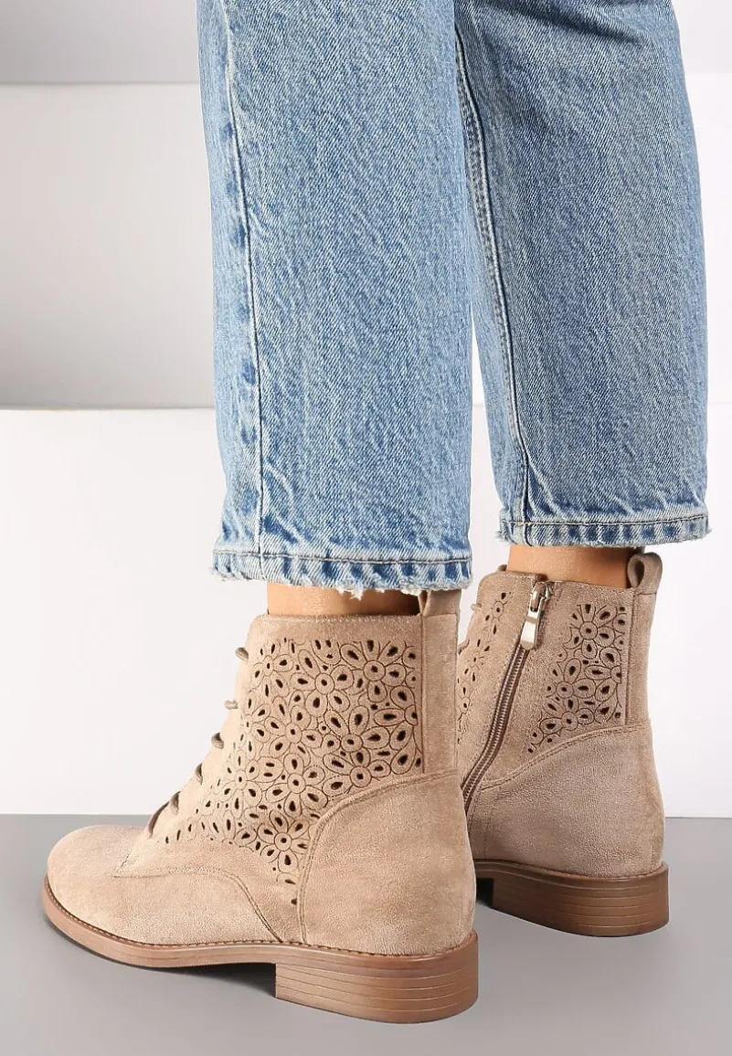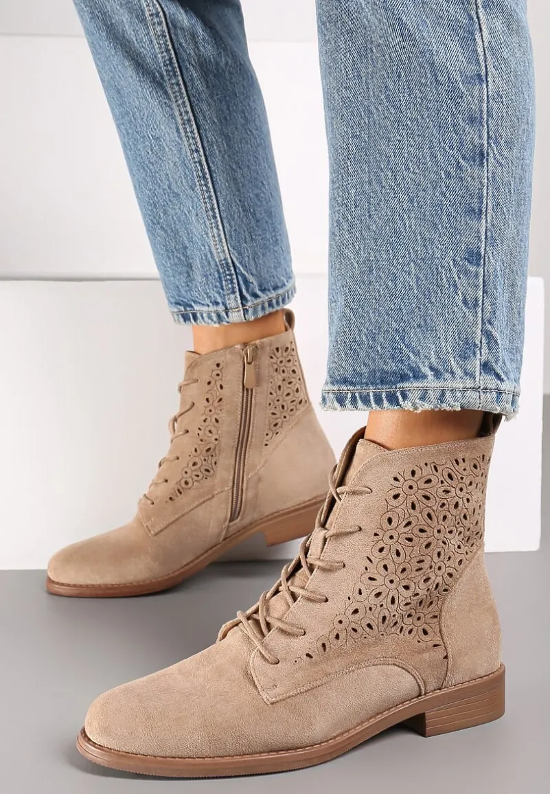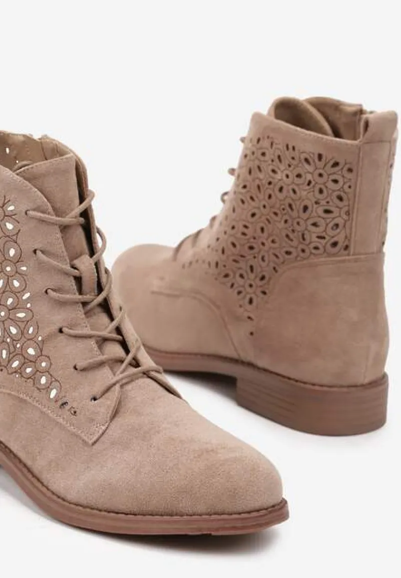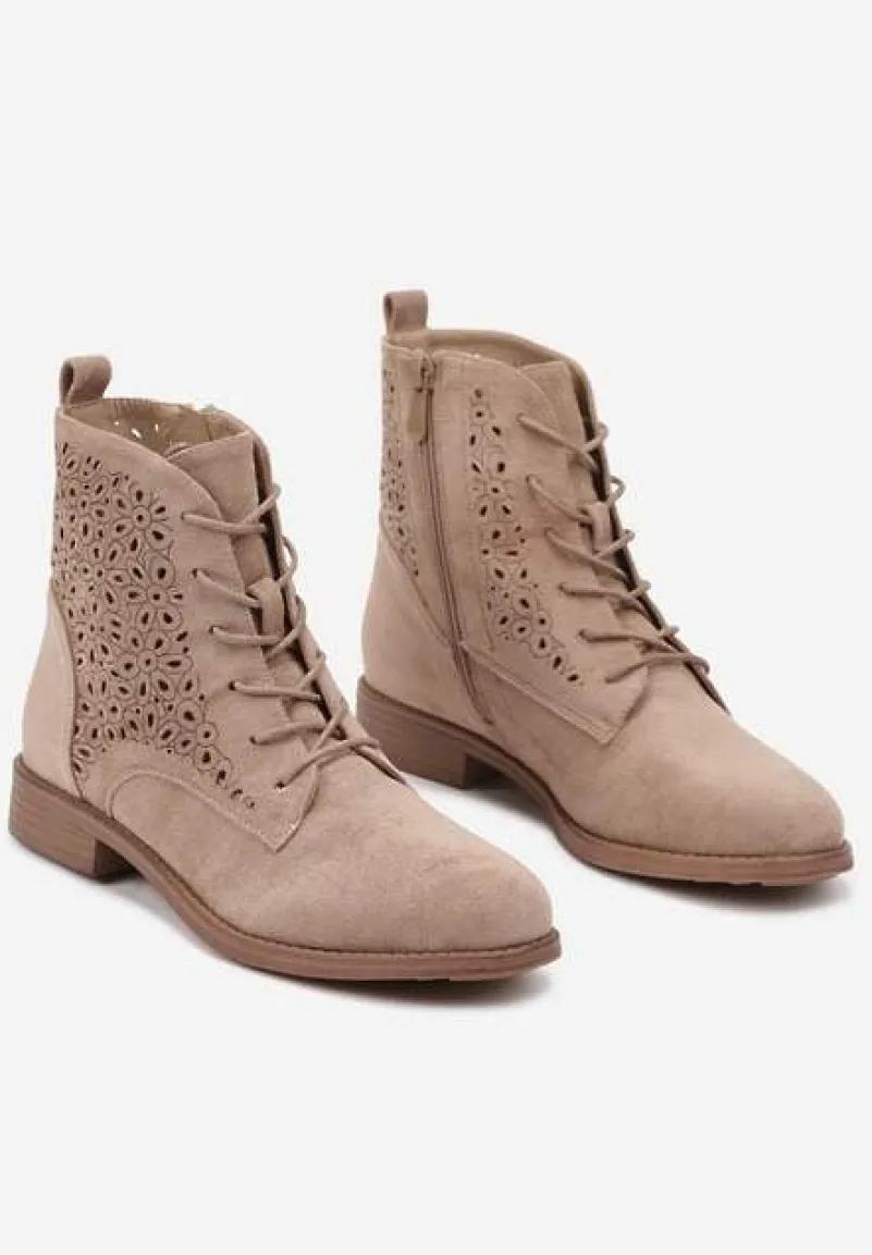 Ciemnobeżowe Ażurowe Botki ze Sznurowaniem i Suwakiem Lerinels