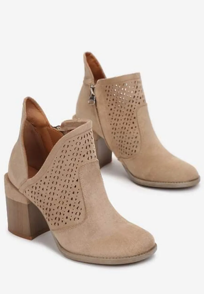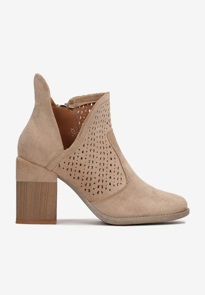 Ciemnobeżowe Botki Ażurowe na Obcasie Deinilea