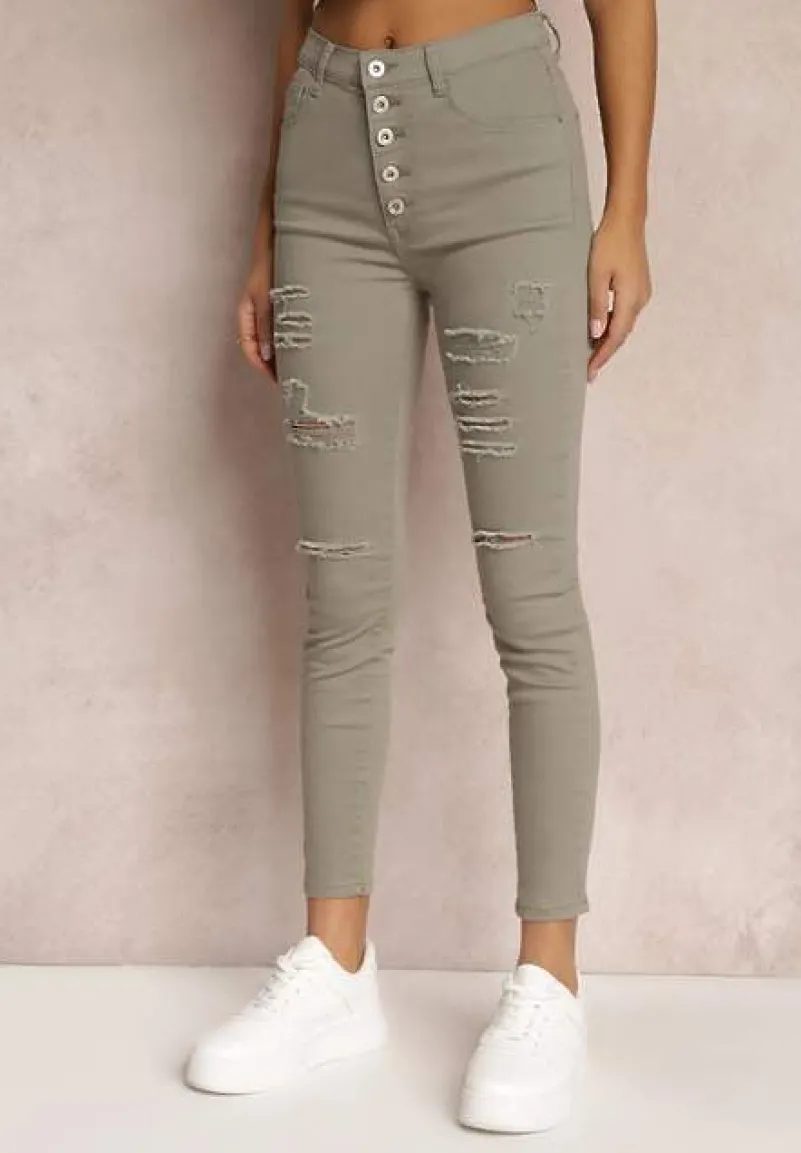 Jeansy Yholo o fasonie skinny z dziurami i przetarciami na nogawkach. Model z wysokim stanem i wsuwanymi kieszeniami. Klasyczne jeansy Yholo zapinane na cztery guziki.