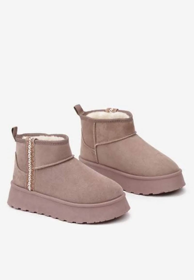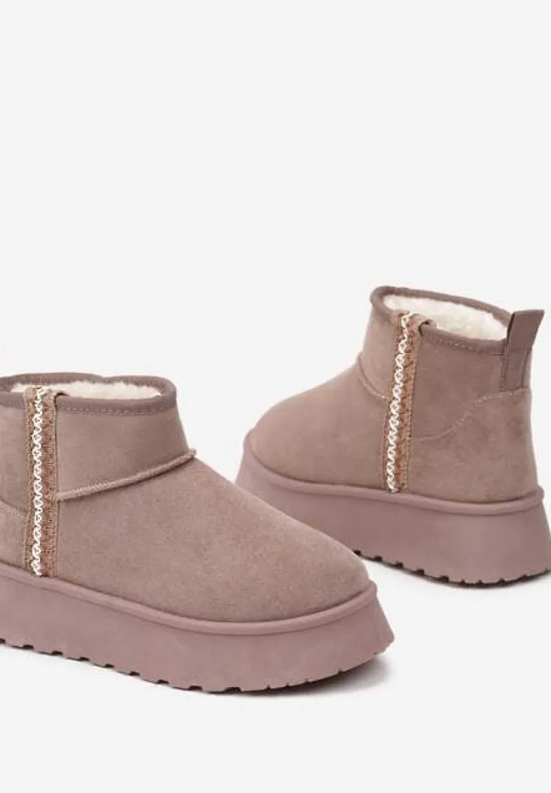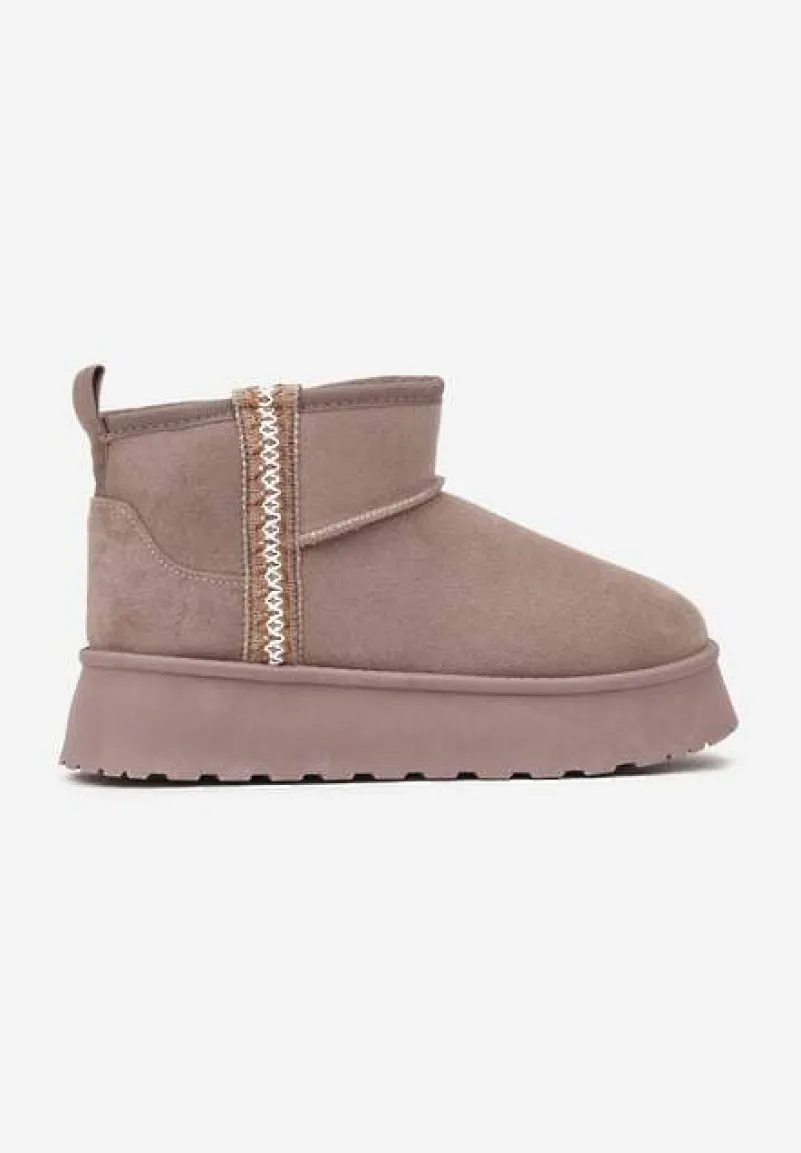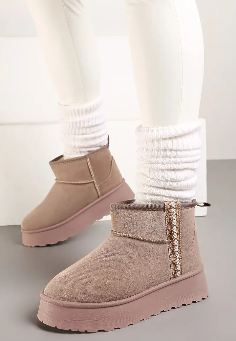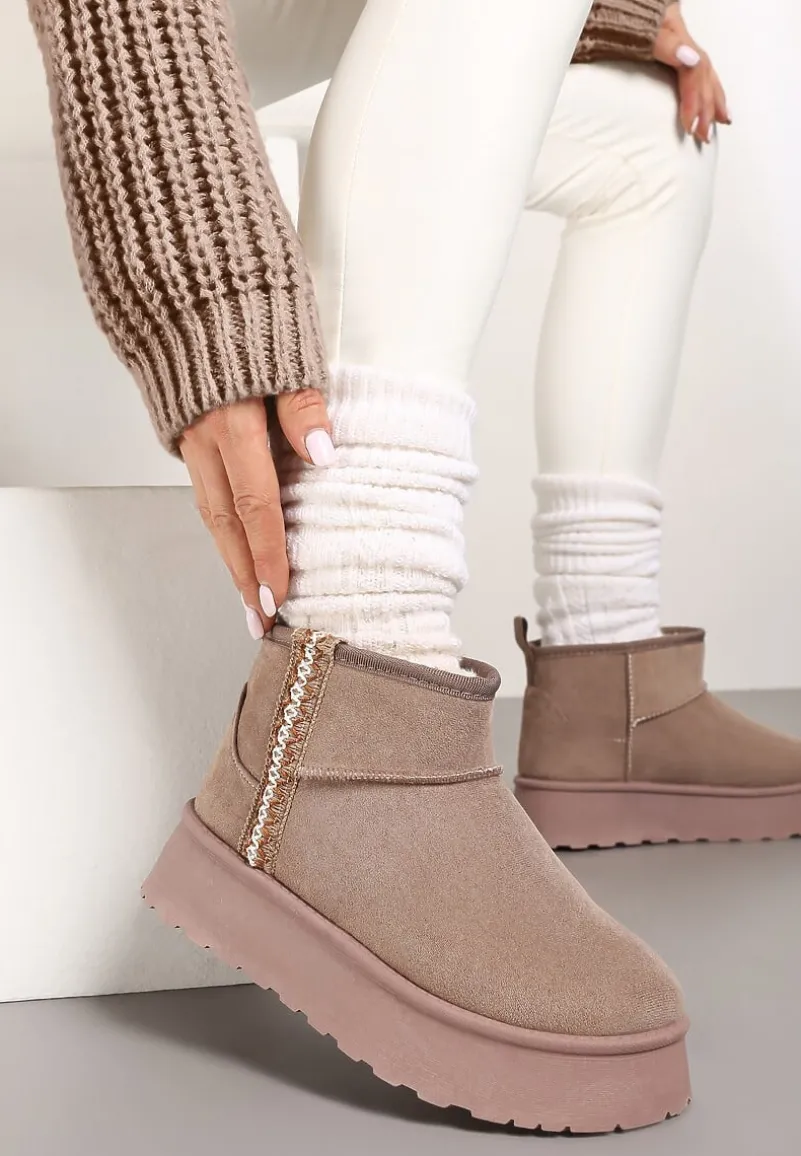 Krótkie Śniegowce na Platformie z Ozdobną Tasiemką Motavia to kwintesencja miejskiego stylu i zimowego ciepła. Masywna platforma dodaje centymetrów i pewności podczas zimowych spacerów. Złap za swoją ulubioną puchową kurtkę i oversize’owy sweter lub stwórz elegancki zestaw z dopasowanymi skórzanymi legginsami i długim wełnianym płaszczem – z tymi śniegowcami za każdym razem poczujesz się wyjątkowo.