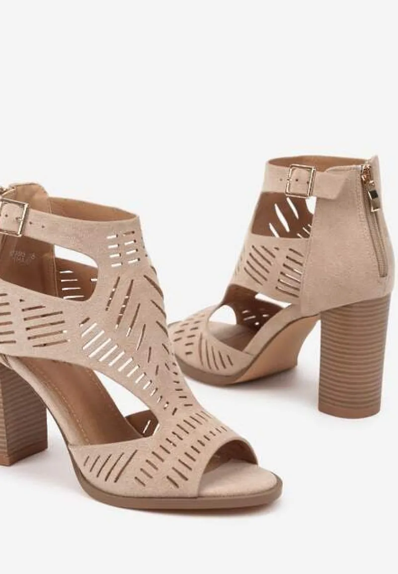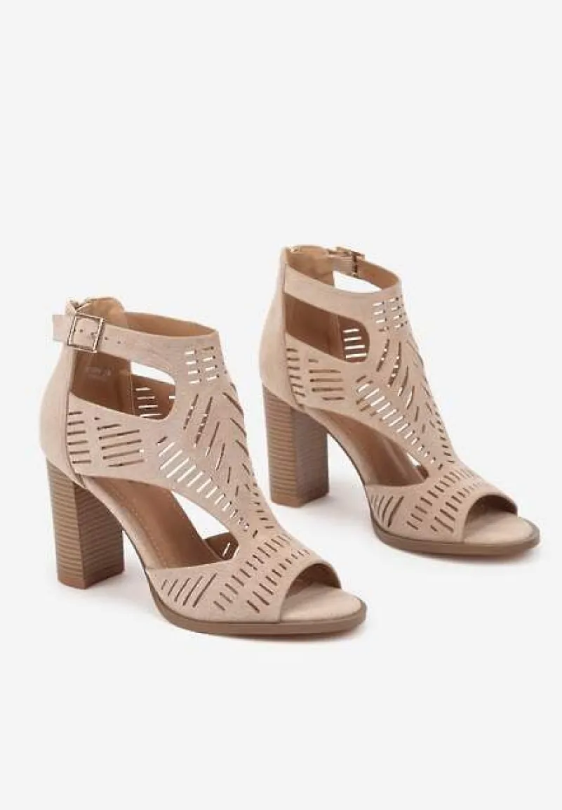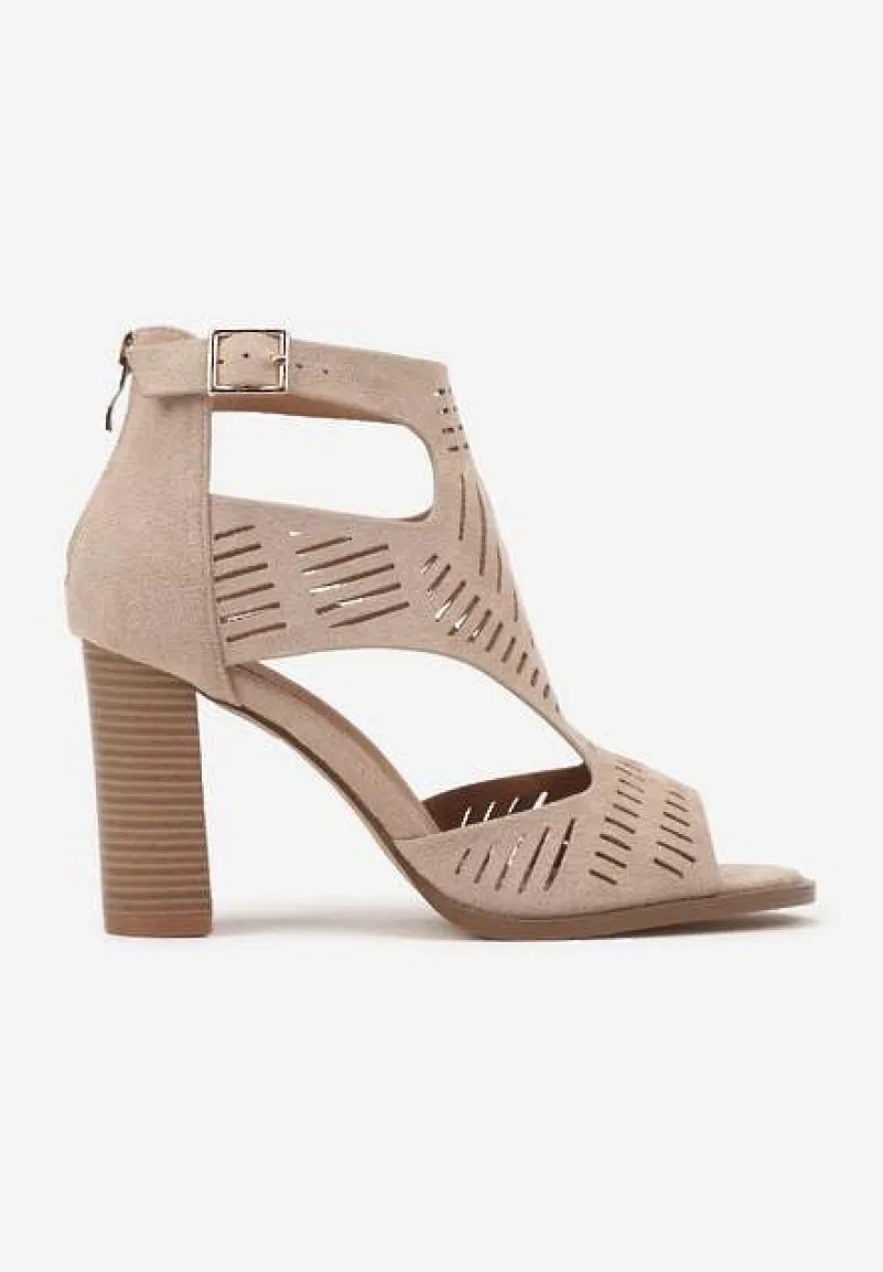 Ciemnobeżowe Sandały na Słupku Ozdobione Ażurowym Wzorem Grelidi