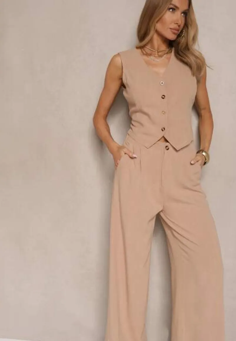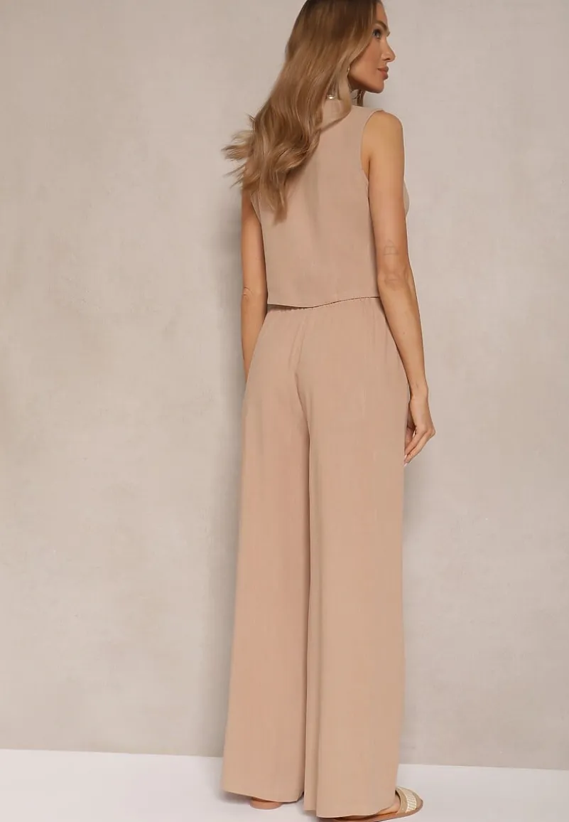 Garniturowy Komplet z Lnu i Wiskozy Kamizelka i Szerokie Spodnie Evialora to idealny wybór dla kobiet, które pragną połączyć wygodę z elegancją. Lekki materiał i swobodny krój zapewniają swobodę ruchów, a uniwersalny design sprawdzi się na wiele okazji. Ten zestaw doskonale sprawdzi się zarówno w stylizacjach na co dzień, na przykład z białym T-shirtem i minimalistycznymi sneakersami, jak i na formalne okazje, gdy zestawisz go ze szpilkami i elegancką torebką. Musisz go mieć!