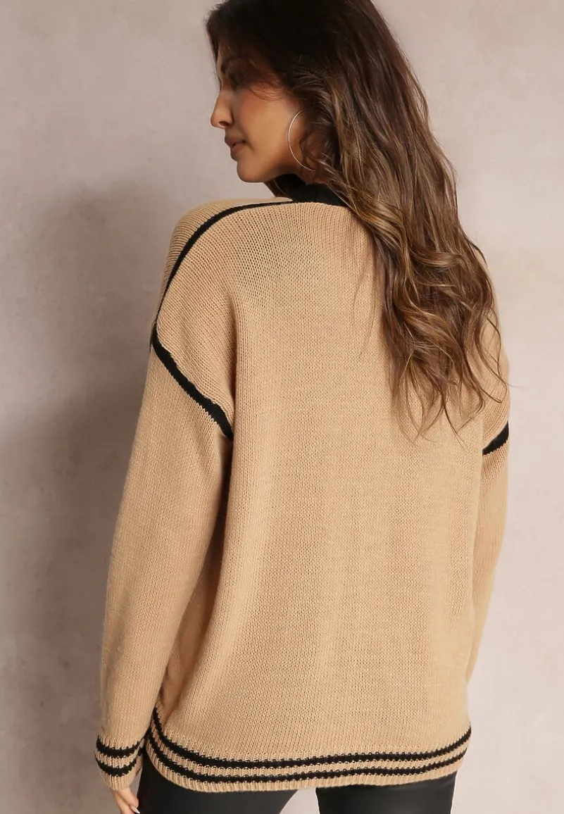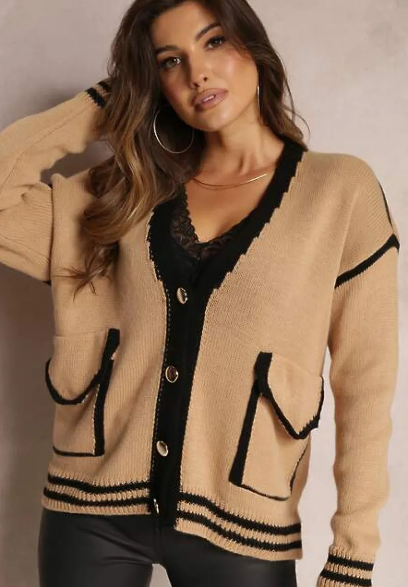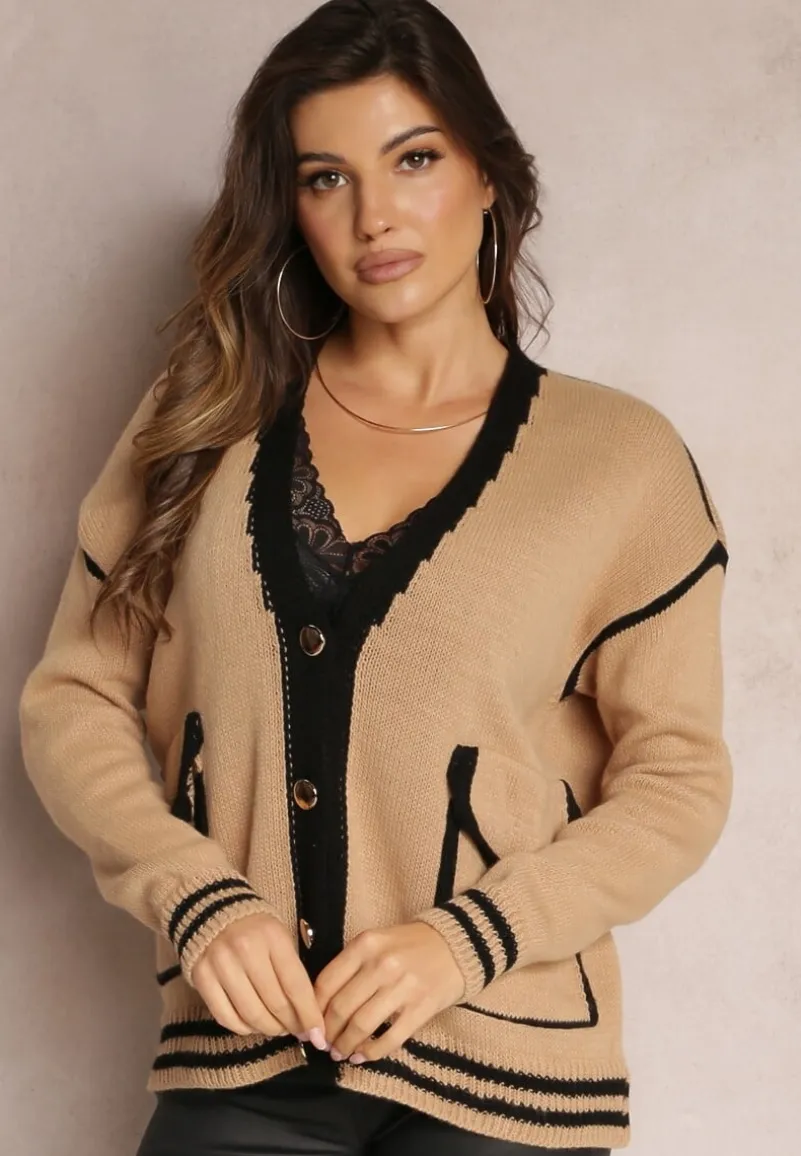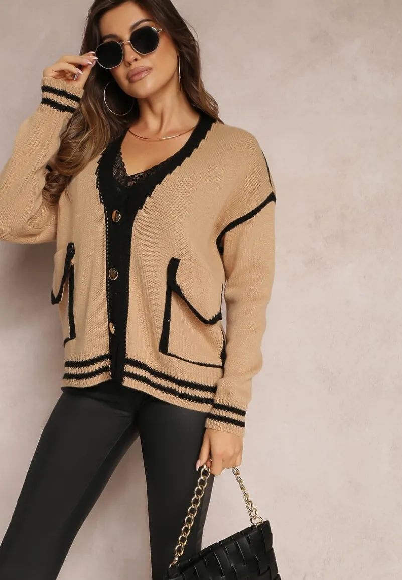 Kardigan Abovza wykonany z dzianiny zdobionej kontrastowymi lamówkami. Zapinany z przodu na biżuteryjne guziki.