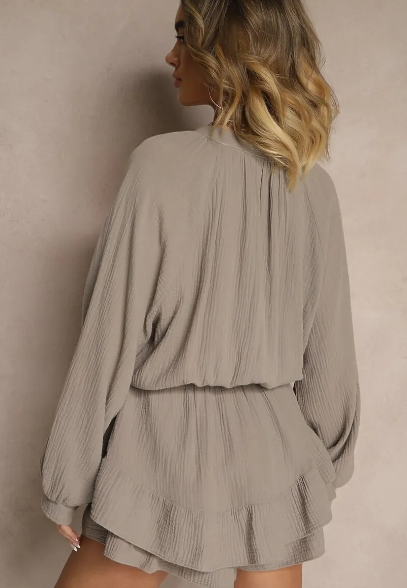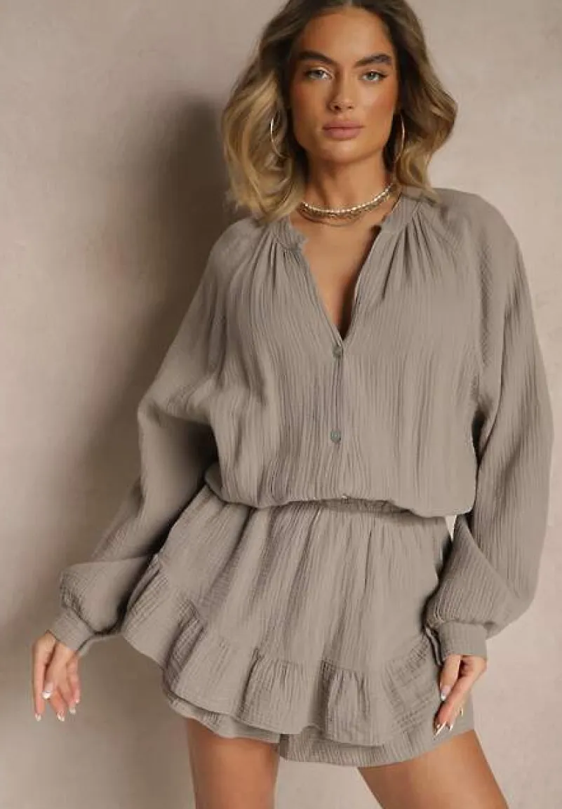 Ciemnobeżowy Kombinezon z Bawełny ze Spódnico-Spodenkami i Guzikami oraz Gumką w Talii Vimatthea