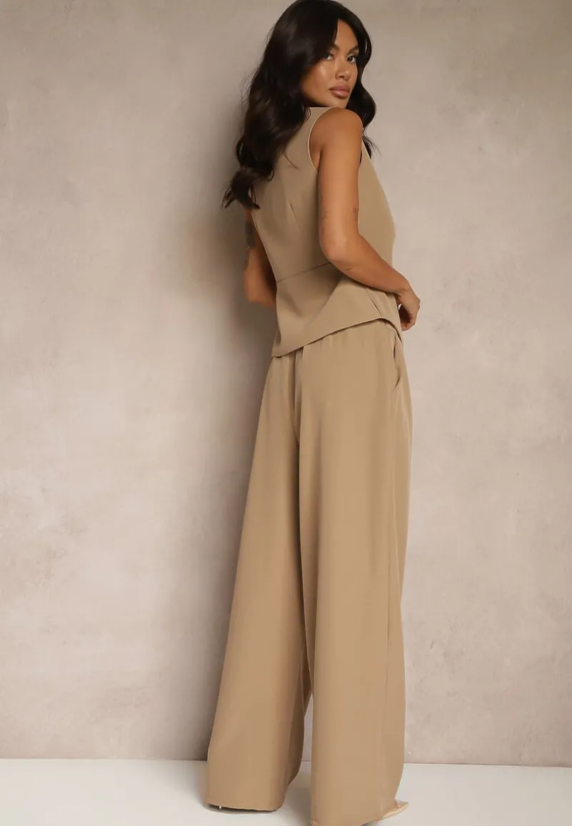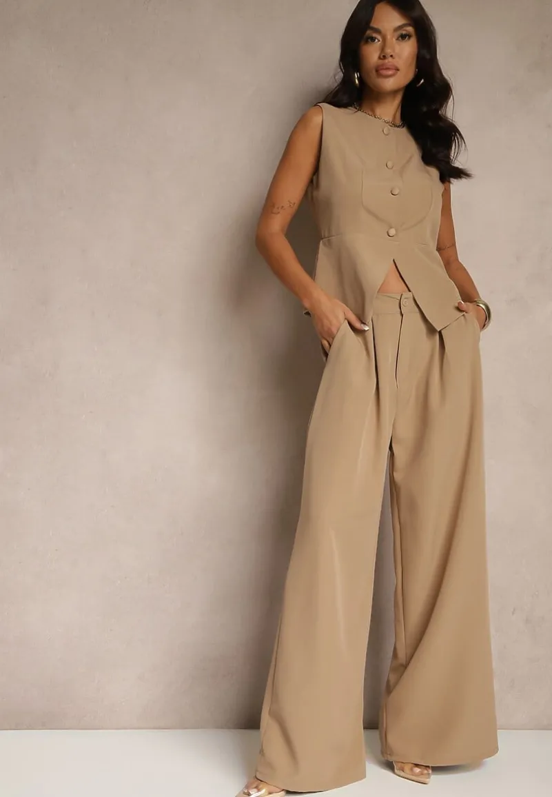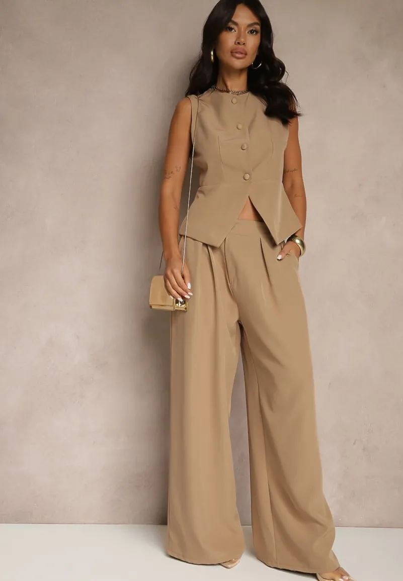 Zabłyśnij w każdej sytuacji dzięki wyjątkowemu kompletowi garniturowemu Ziorene, który łączy nowoczesny design z elegancją! Szerokie spodnie z elastyczną gumką z tyłu oraz wsuwanymi kieszeniami i dopasowana kamizelka wyróżniają się krojem, który dopasowuje się do sylwetki, podkreślając kobiece kształty. Idealnie sprawdzi się zarówno w biurze, jak i na wieczornym wydarzeniu; wystarczy dodać szpilki i minimalistyczną biżuterię, aby stworzyć zachwycający look.