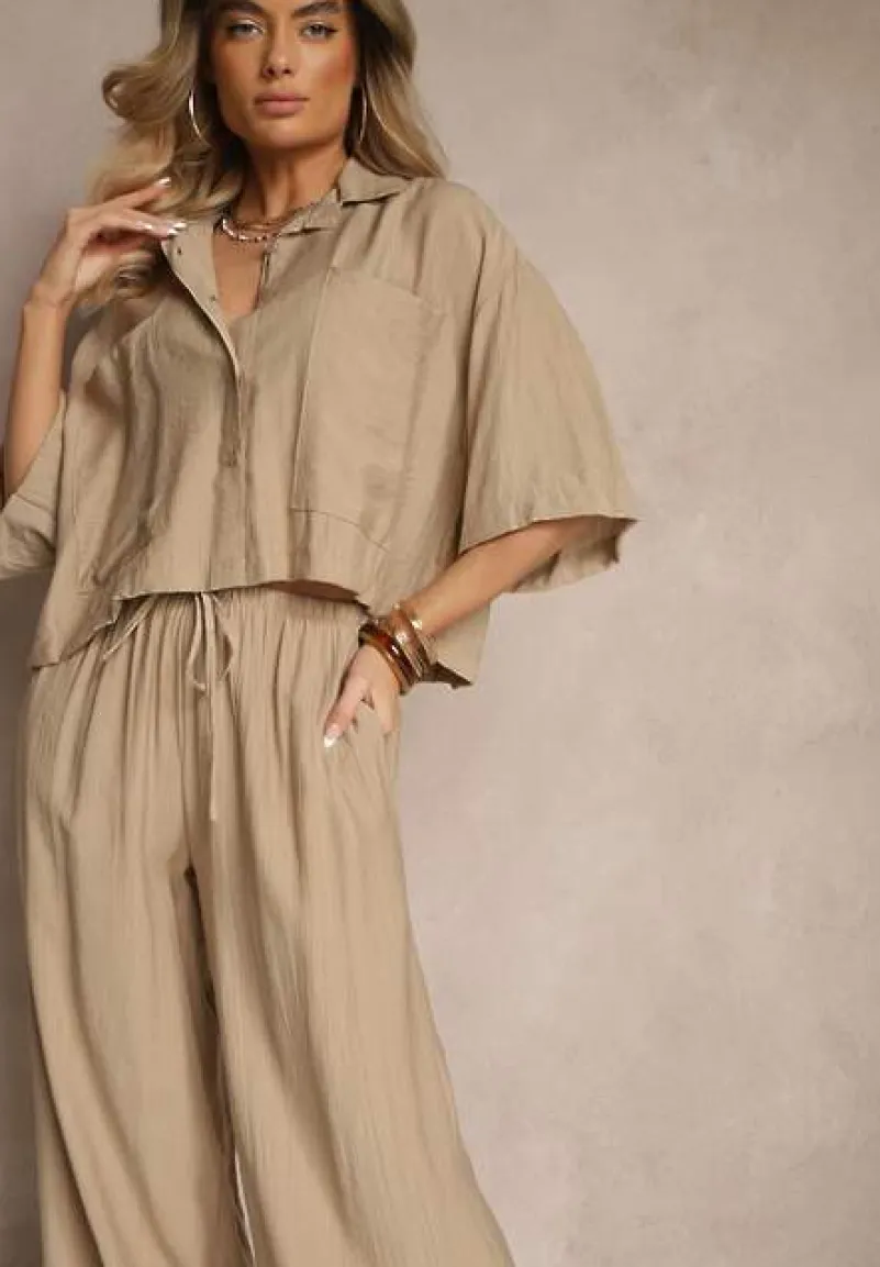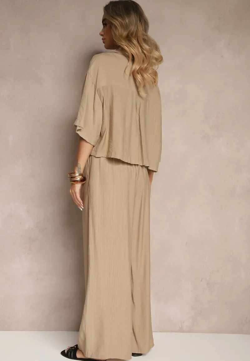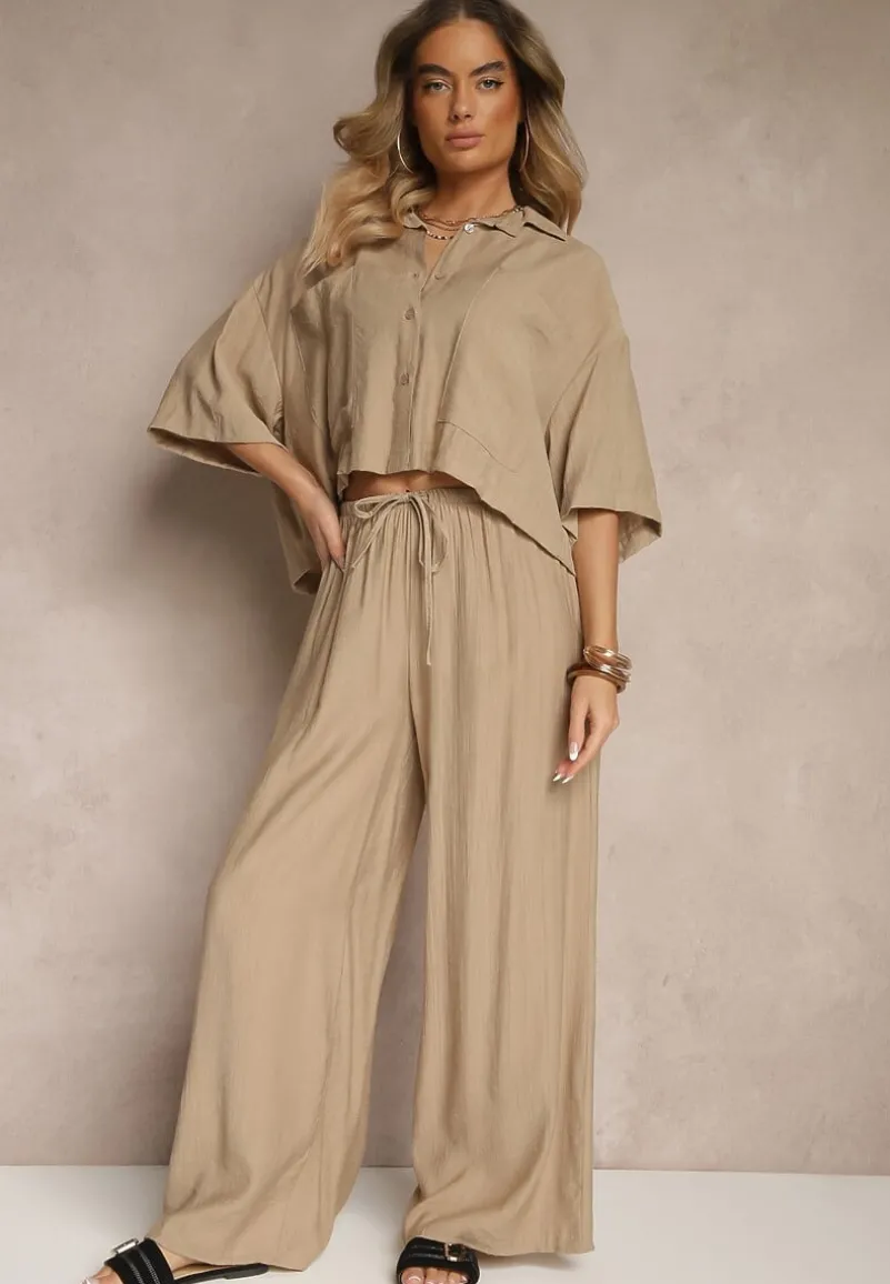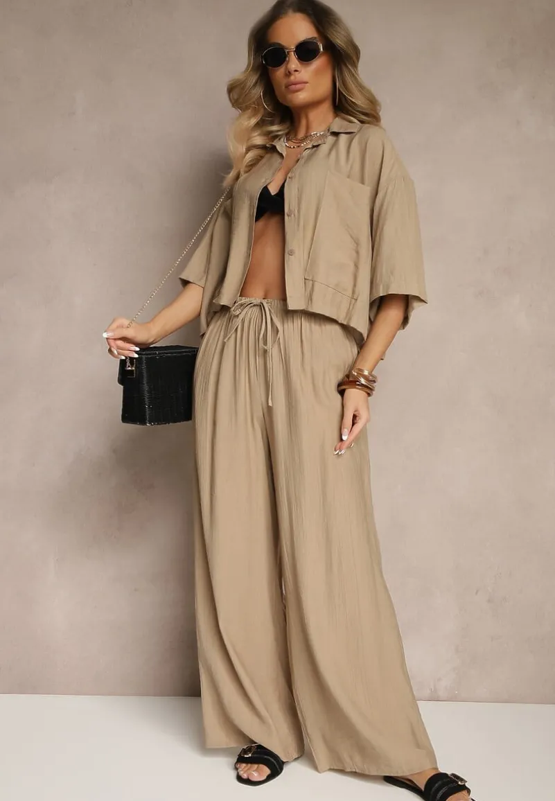 Zachwycający komplet Dovaraella to kwintesencja elegancji w stylu casual, idealny na każdą okazję! Oversize’owy fason zapewnia komfort noszenia, a naturalny materiał sprawdzi się w ciepłe dni. Doskonały na wiosnę i lato, możesz go stylizować na wiele sposobów – na co dzień postaw na sneakersy oraz torbę na ramię, a na formalne wyjście dobierz subtelną biżuterię i eleganckie szpilki. Dzięki gumce w talii spodni oraz krótkiemu krojowi koszuli komplet ten subtelnie podkreśli Twoją sylwetkę, a wsuwane kieszenie dodadzą mu funkcjonalności. Musisz go mieć!
