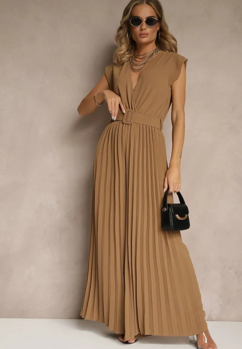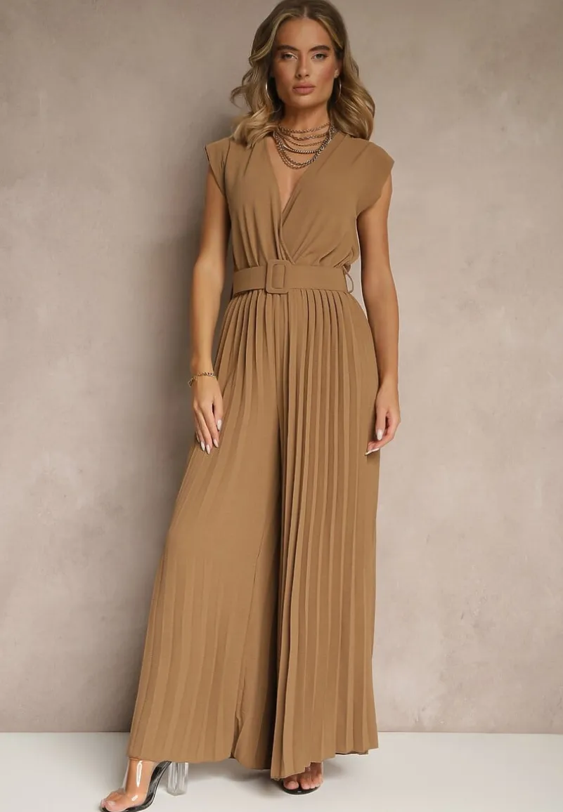 Ciemnobeżowy Kopertowy Kombinezon Wide Leg Zdobiony Plisami i Paskiem z Klamrą Salirella