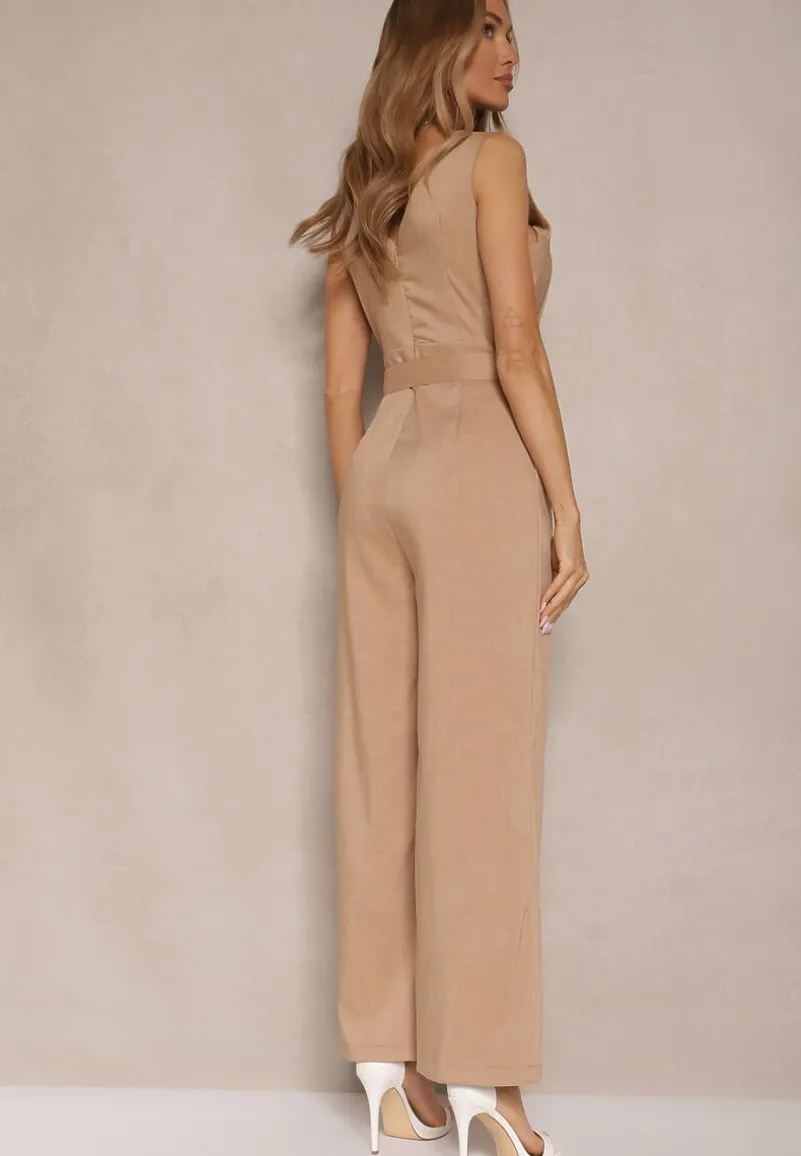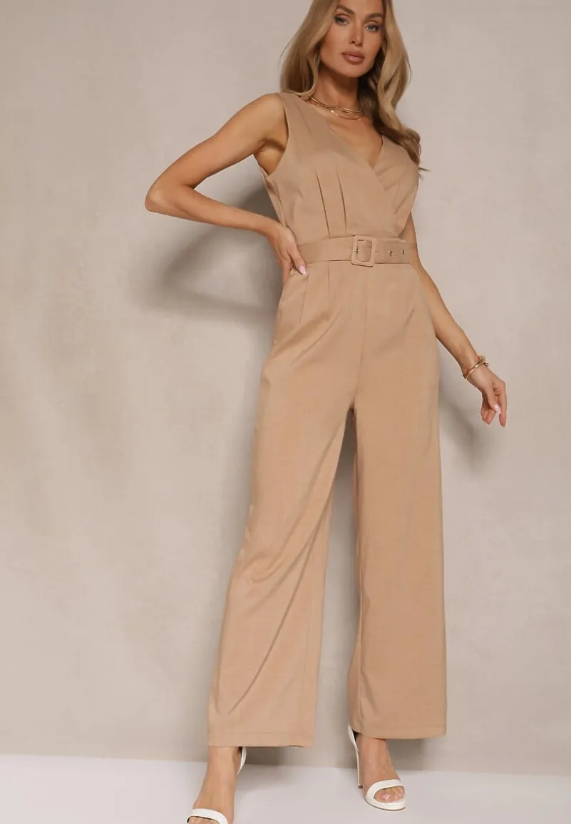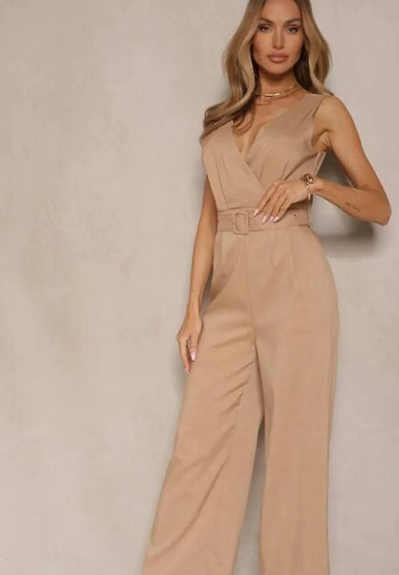 Ciemnobeżowy Kopertowy Kombinezon z Bawełną Ozdobiony Paskiem Evianaria