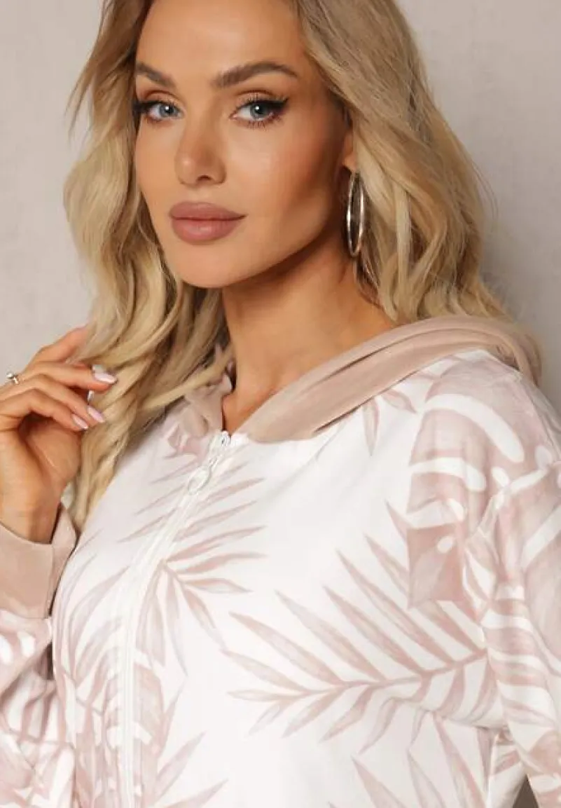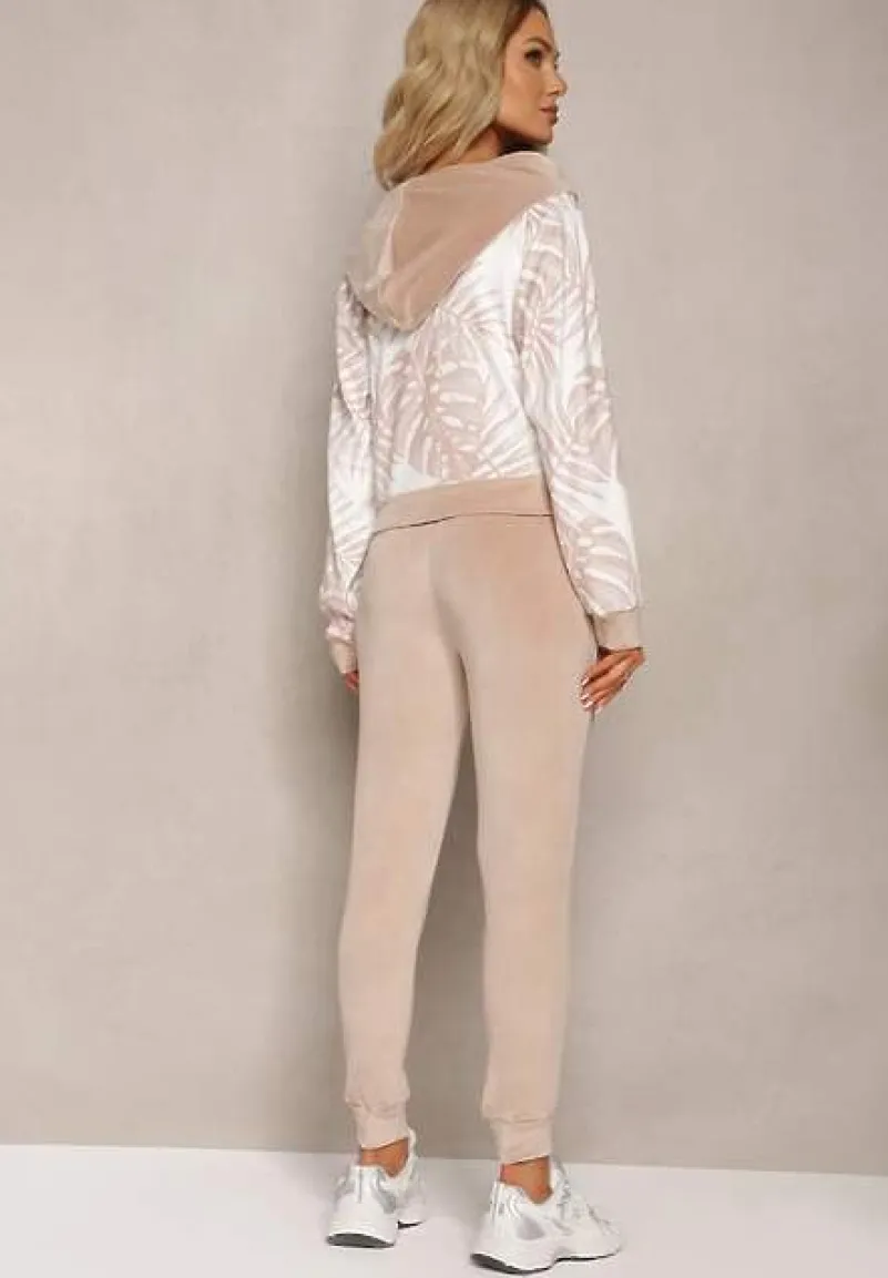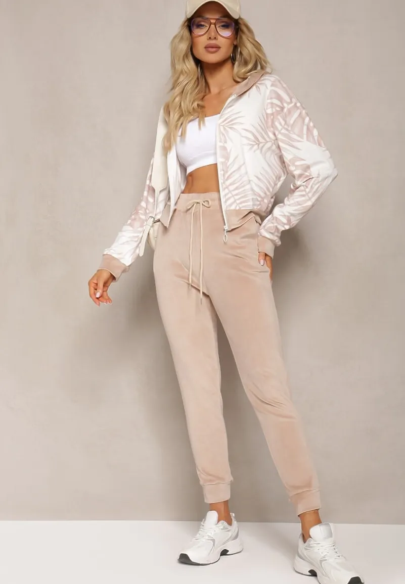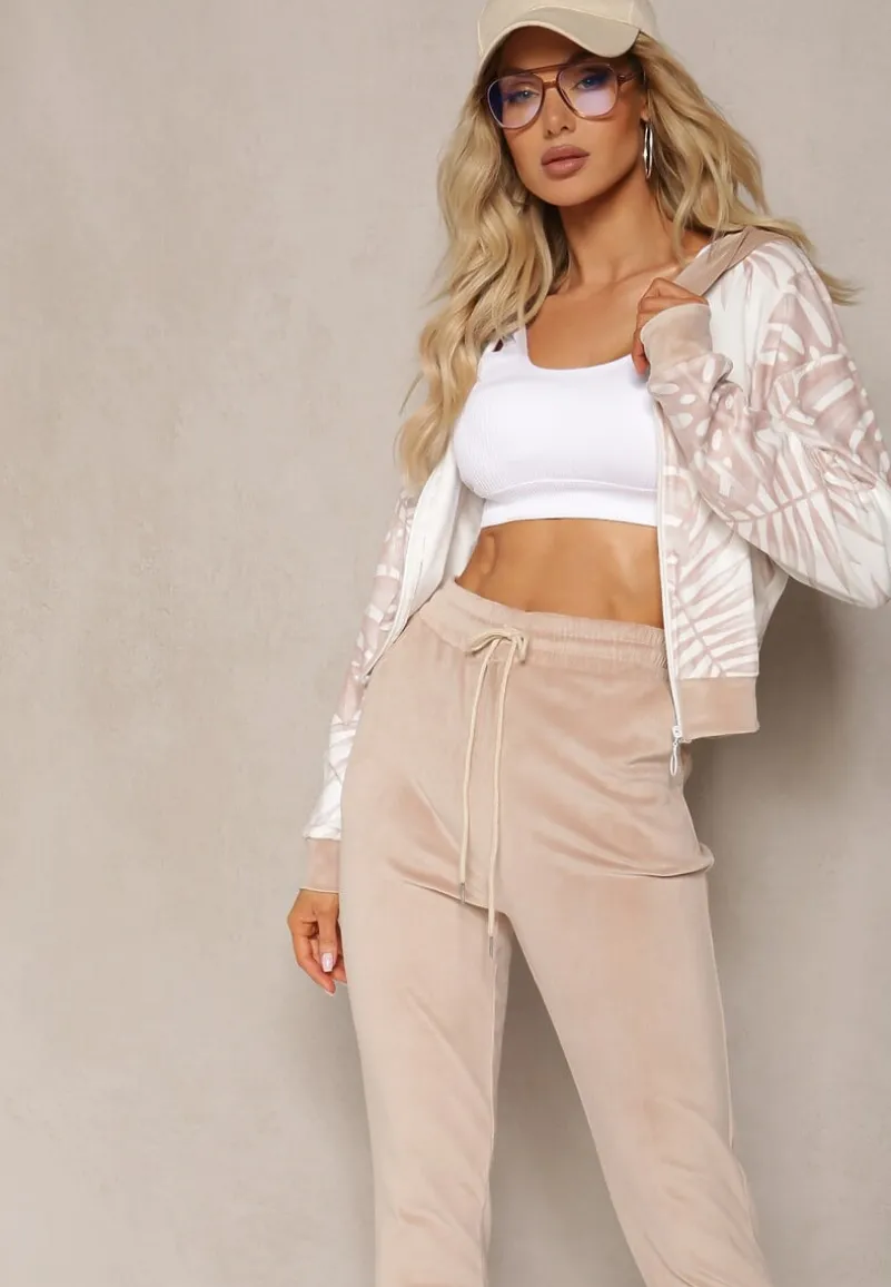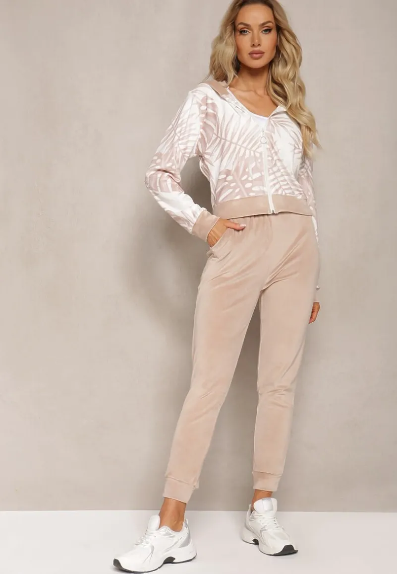 Welurowy komplet dresowy z wzorzystą, zasuwaną bluzą i spodniami typu joggery. Idealny na co dzień ze sneakersami.
