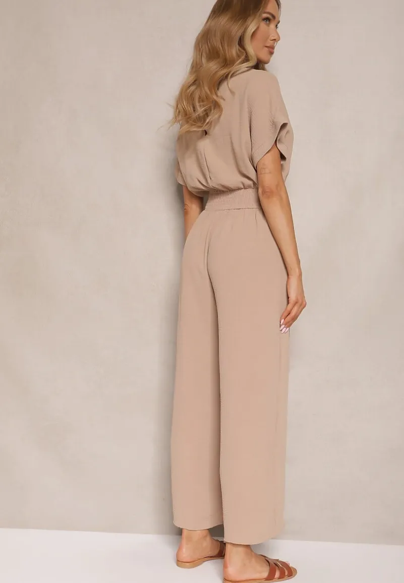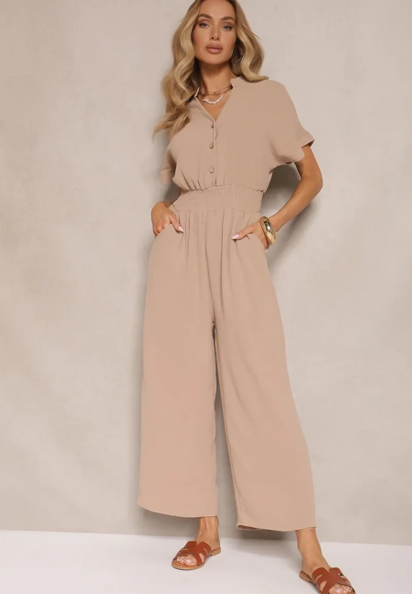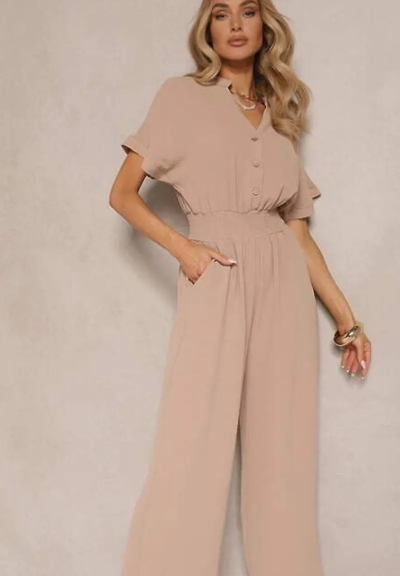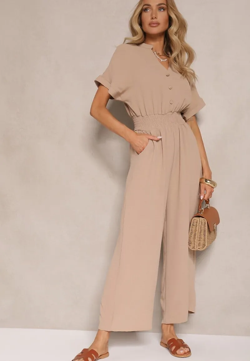 Ciemnobeżowy Wiskozowy Kombinezon z Dekoltem w Serek Zapinany na Guziki Anisora