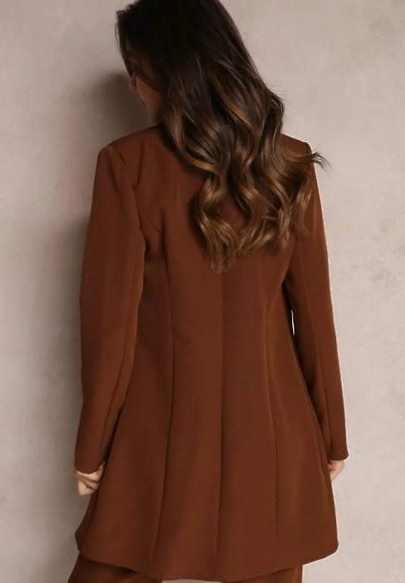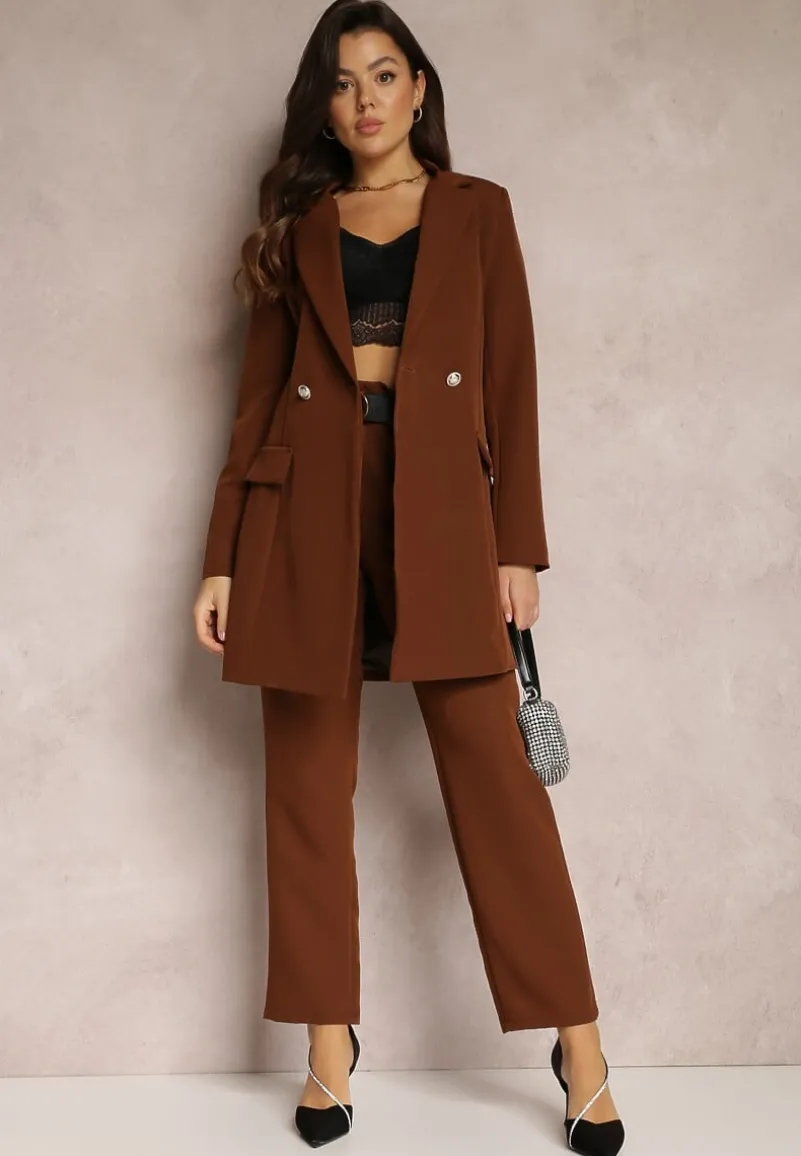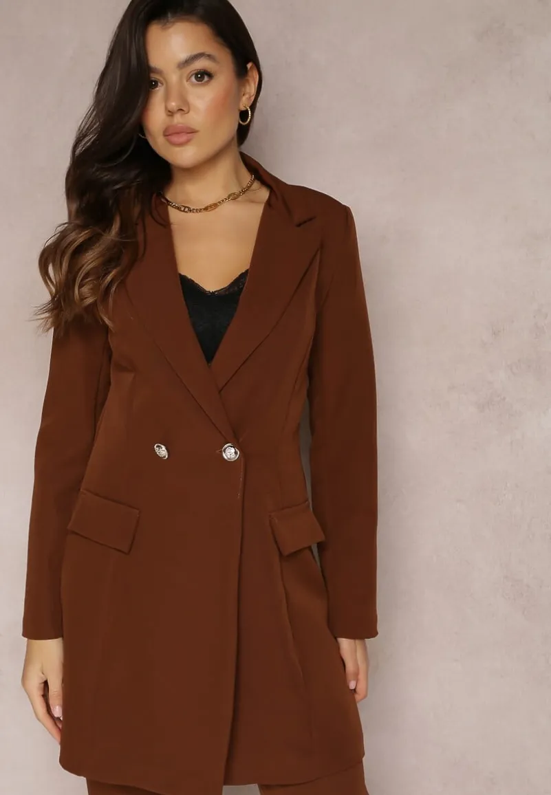 Marynarka Swal to dwurzędowy, długi fason. Z przodu eleganckie guziki. Trójkątny dekolt z klapami, klapy imitujące kieszenie na biodrach. Długi rękaw. Posiada podszewkę. Doskonale komponuje się w komplecie z garniturowymi spodniami i topem.