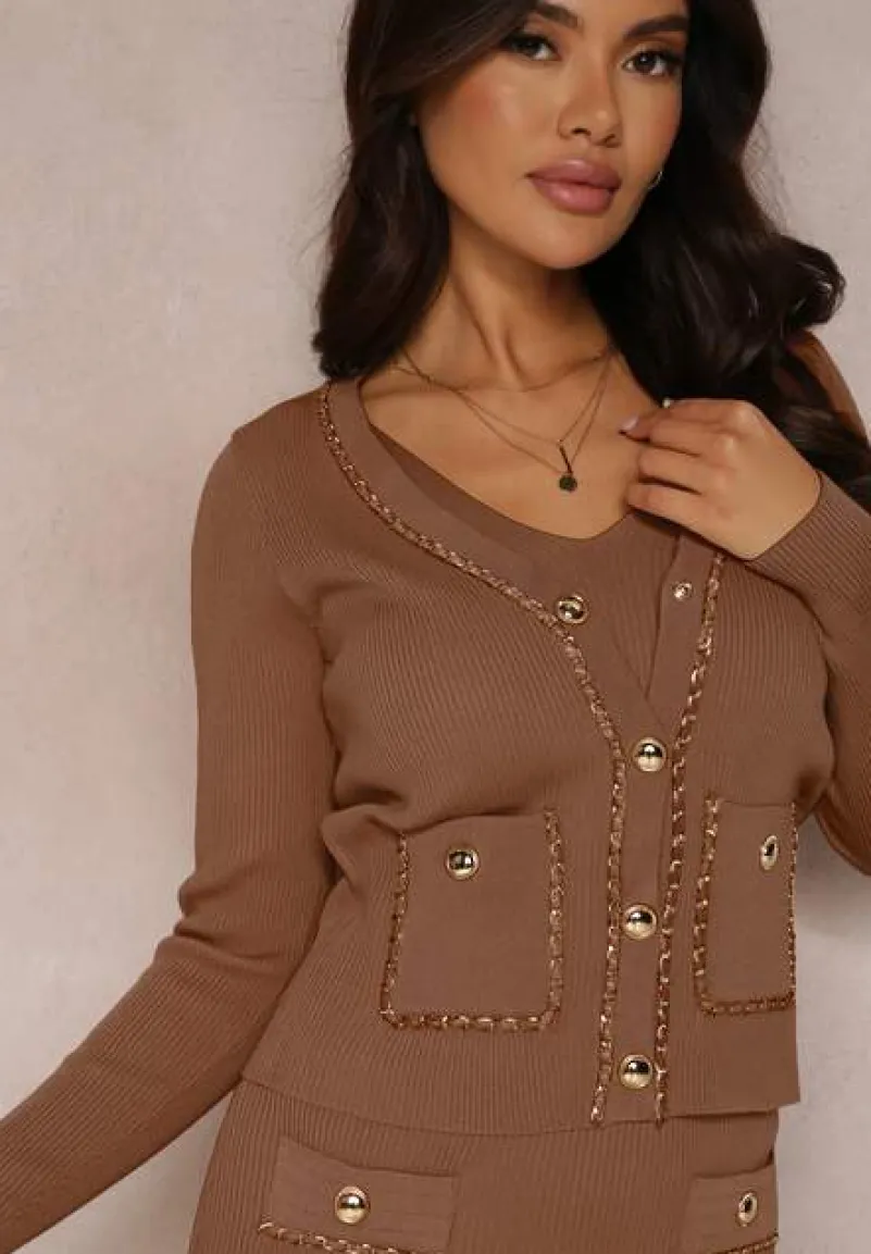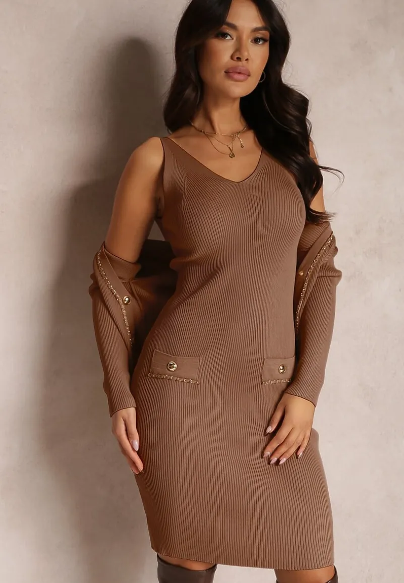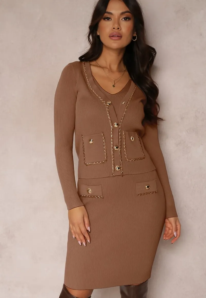 Komplet 2-częściowy z Prążkowanej Dzianiny z Wiskozą Chengi to must-have każdej modnej kobiety, która pragnie łączyć wygodę z elegancją. Sweterkowy materiał pięknie dopasowuje się do sylwetki, podkreślając jej atuty. Idealny na chłodniejsze sezony, sprawdzi się zarówno na co dzień, jak i podczas wyjść wieczorowych. Kardigan i dopasowana sukienka na ramiączkach tworzą elegancką linię, a subtelne zdobienia i imitacje kieszeni dodają całości szyku. Na co dzień zestaw ten świetnie skomponuje się z trampkami i torebką typu shopper, a na wieczór dobierz eleganckie szpilki i kopertówkę.