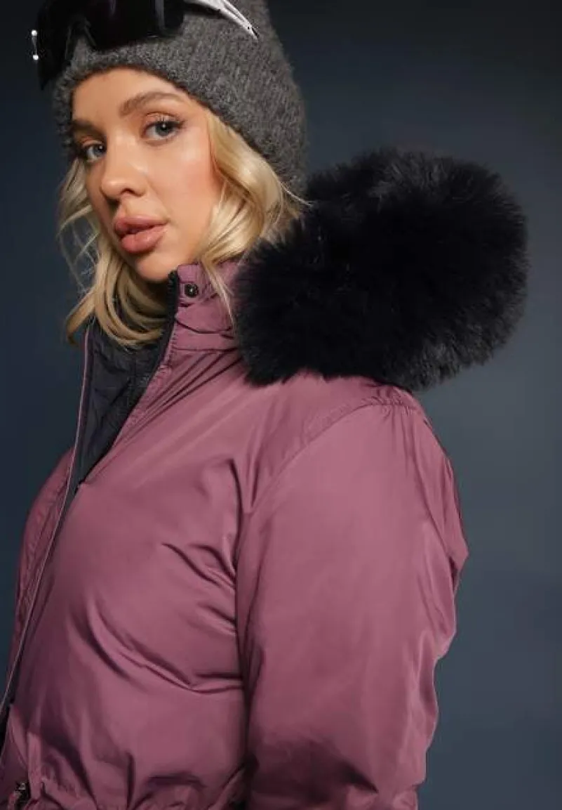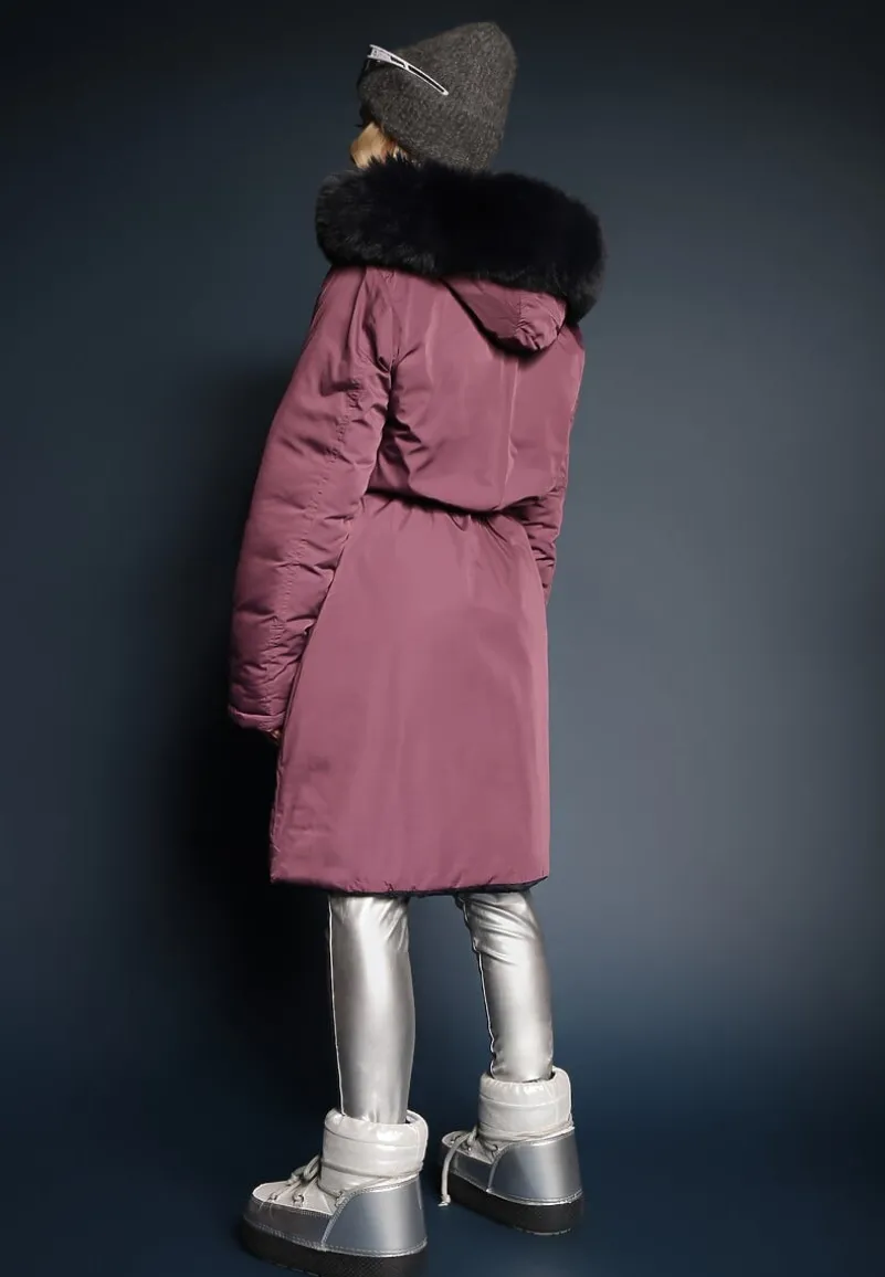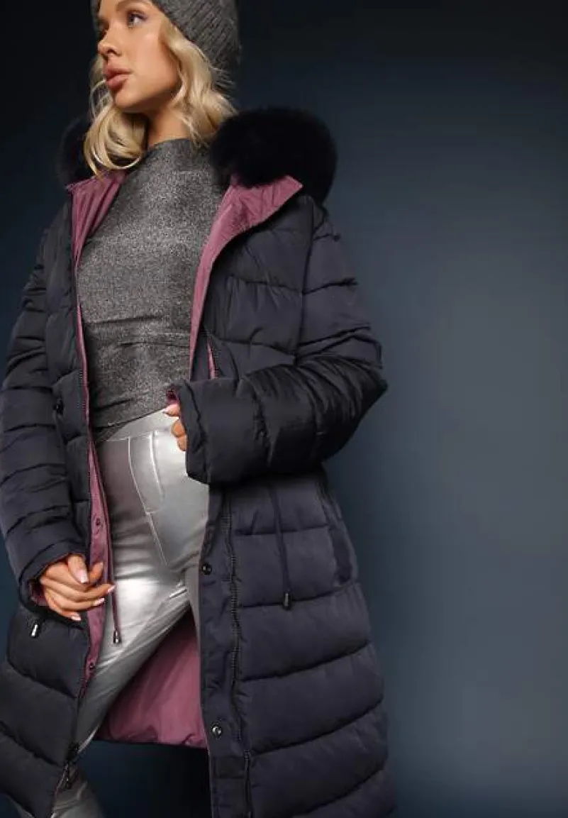 Dwustronna kurtka płaszcz – jedna strona z pikowaniem, druga gładka. Kurtka jest lekko taliowana za pomocą troczków, posiada kaptur ozdobiony futerkiem oraz kieszenie na wysokości bioder.