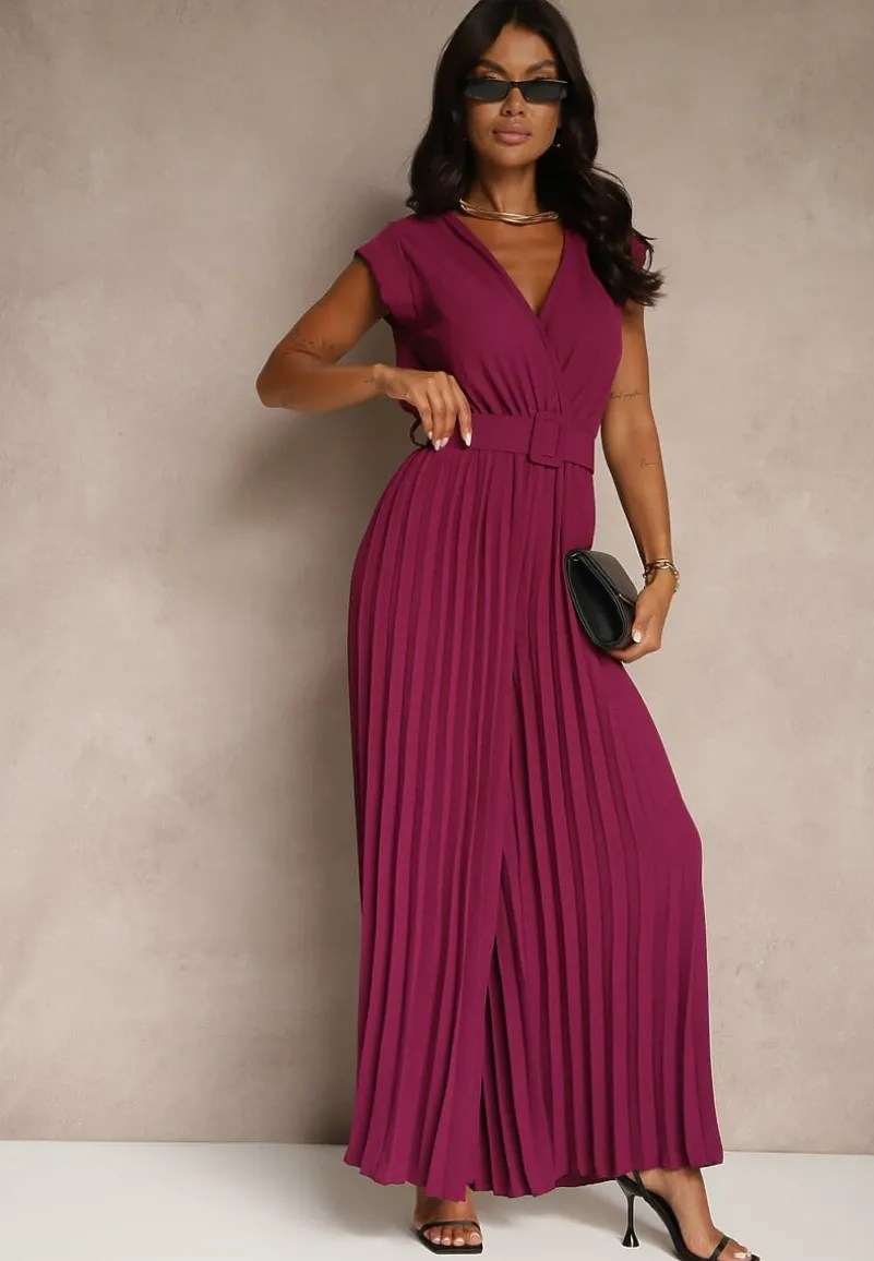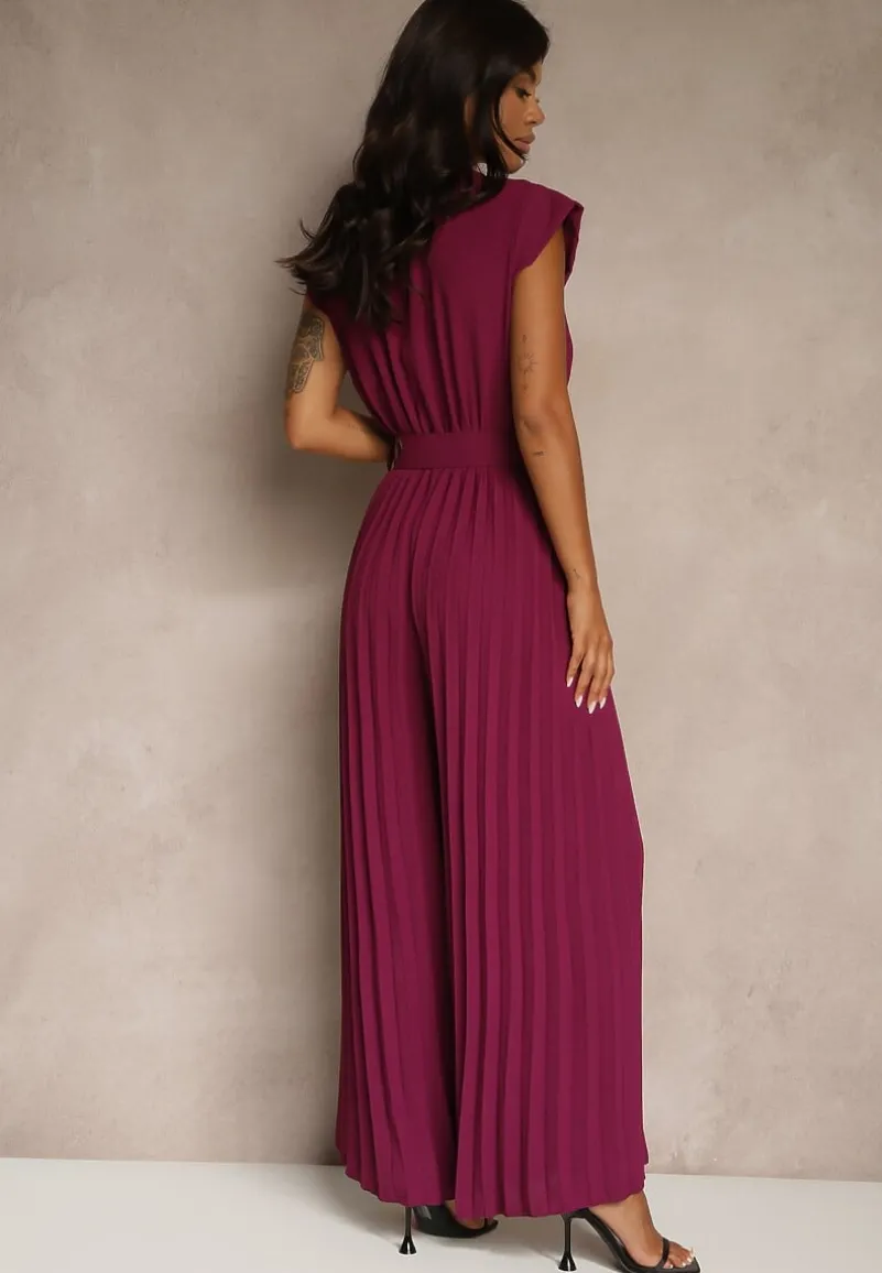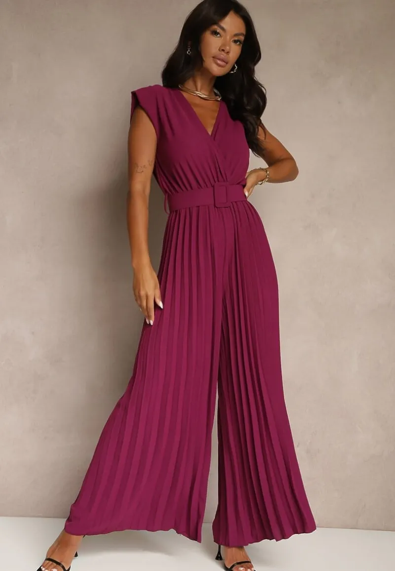 Ciemnofioletowy Kopertowy Kombinezon Wide Leg Zdobiony Plisami i Paskiem z Klamrą Salirella