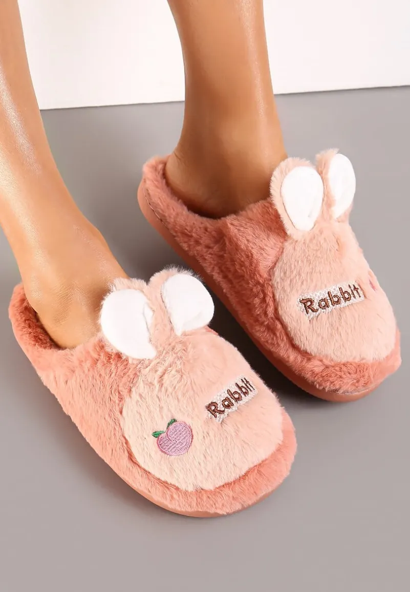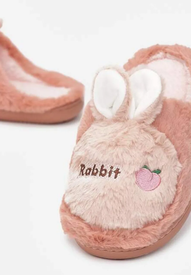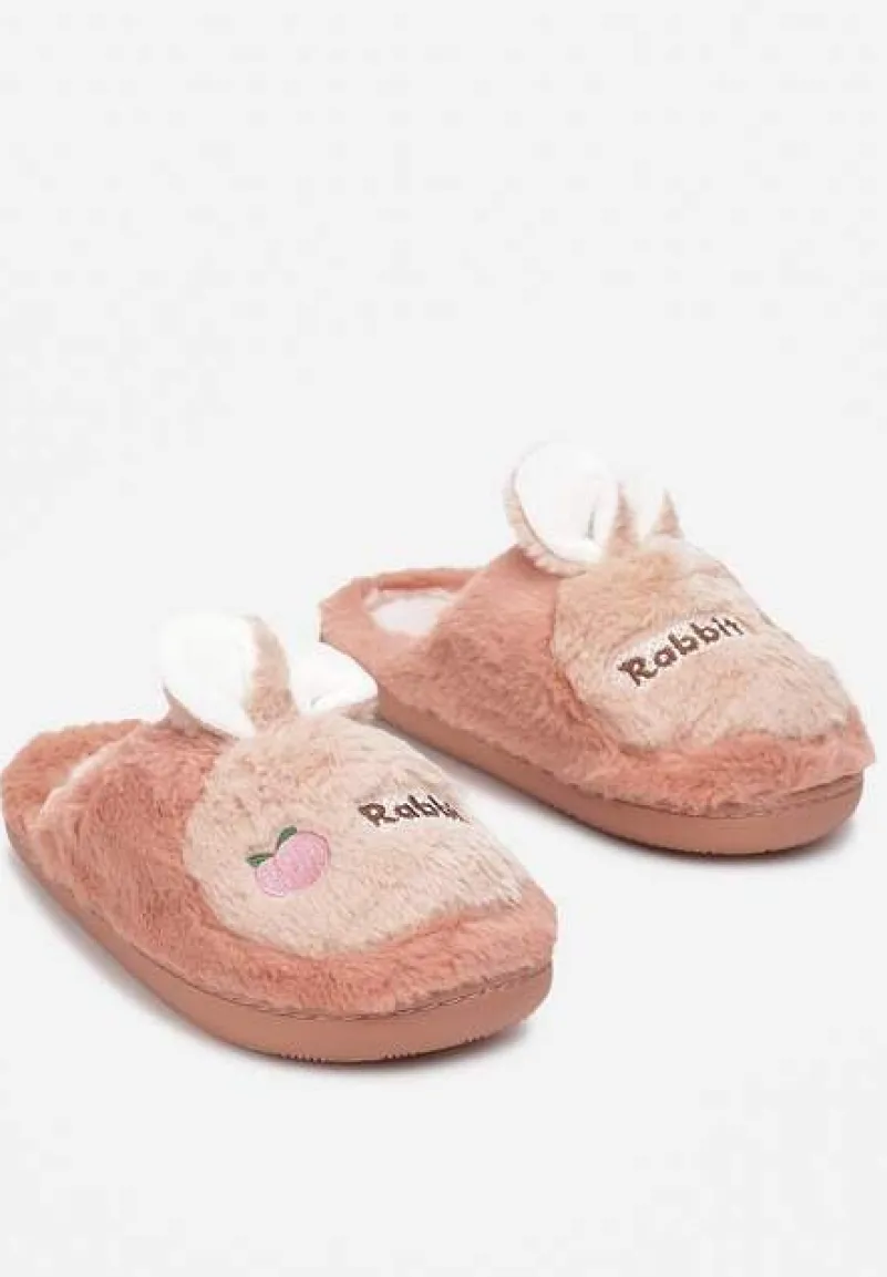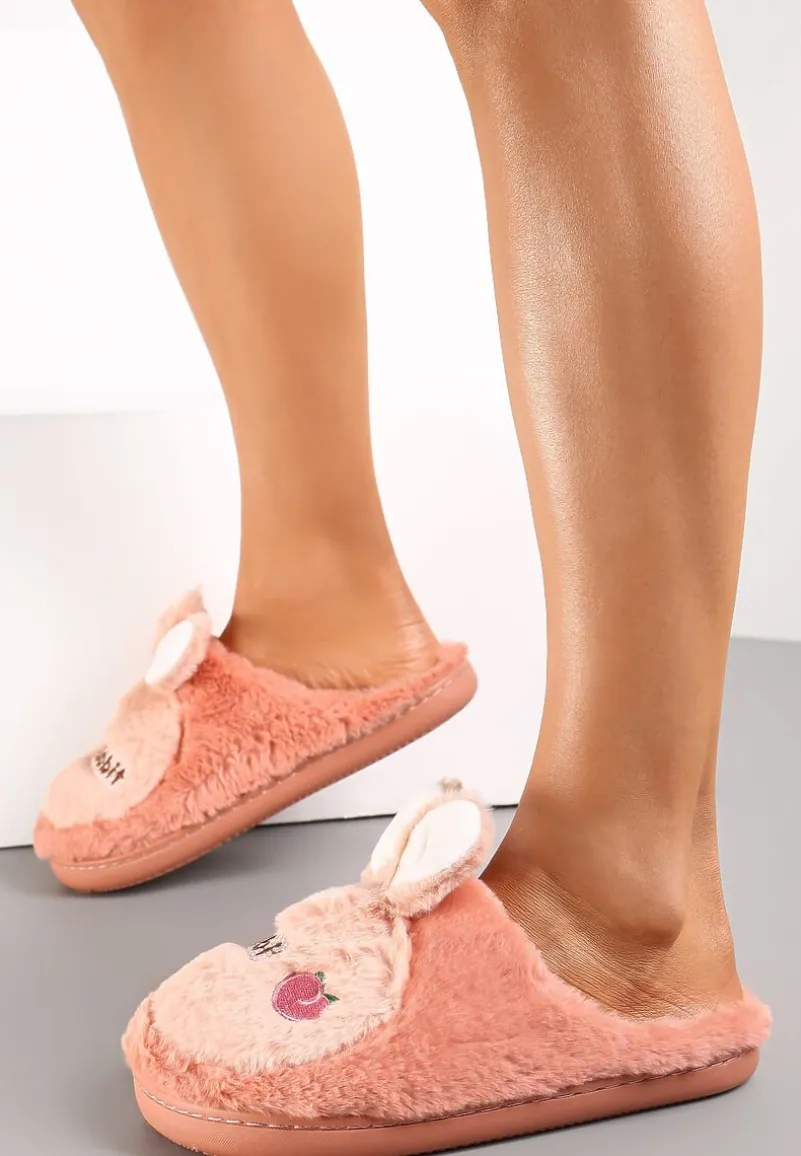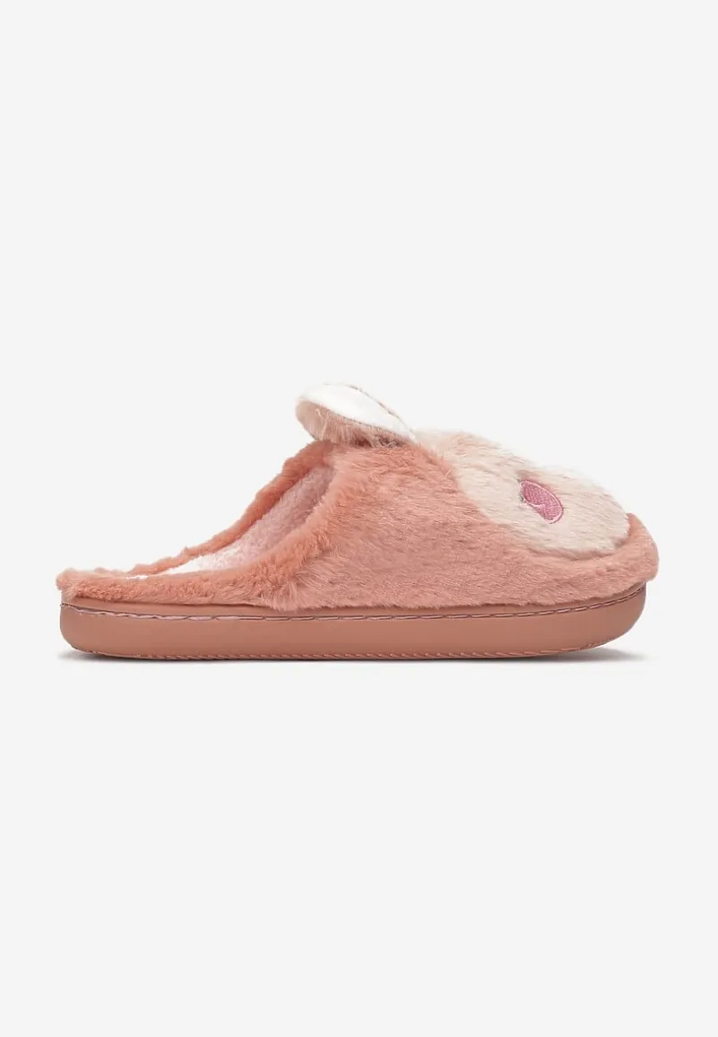 Kapcie Heas wykonane z miękkiego, pluszowego materiału. Osadzone na płaskiej podeszwie z gumy. Z przodu ozdoba w kształcie królika z uszami i haftem. Futrzane kapcie Heas mają okrągłe noski.