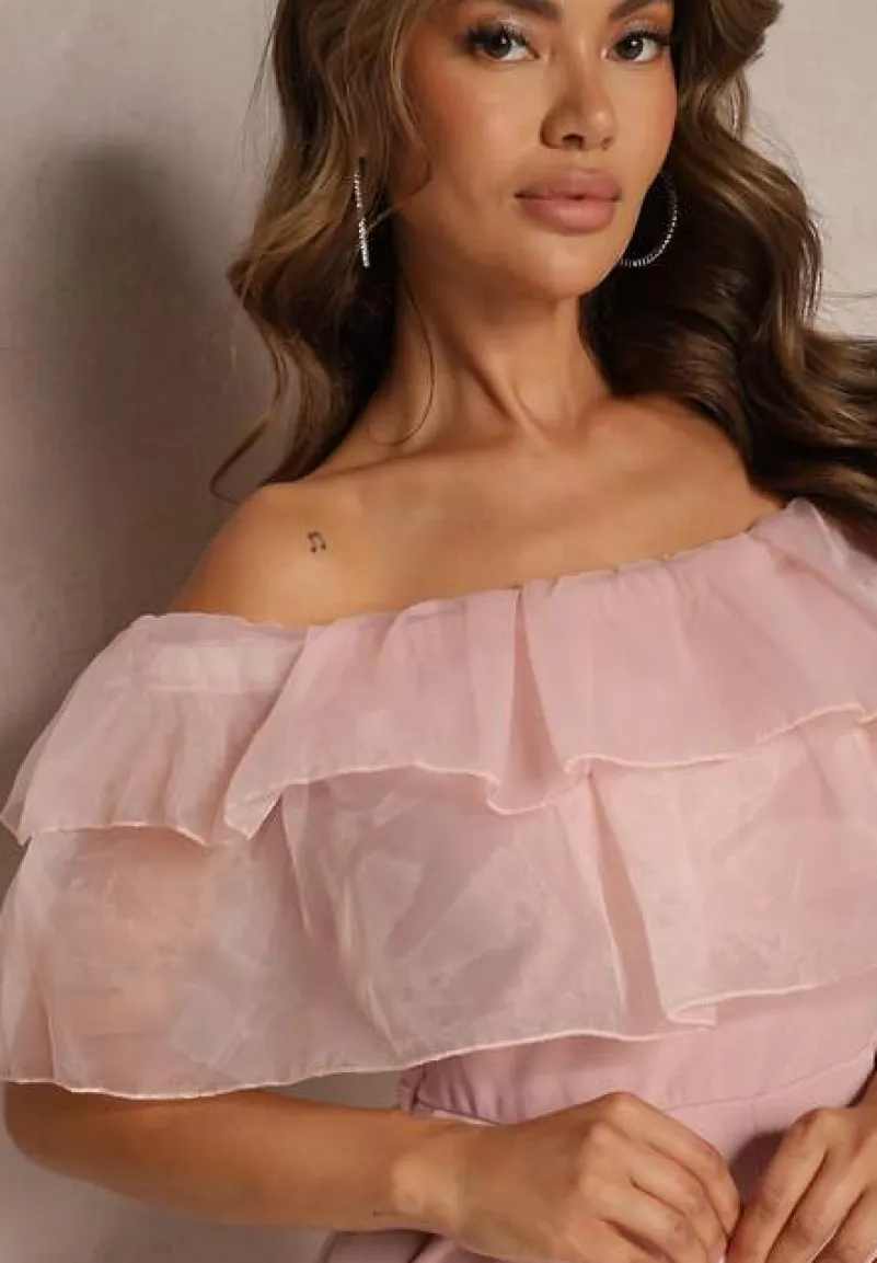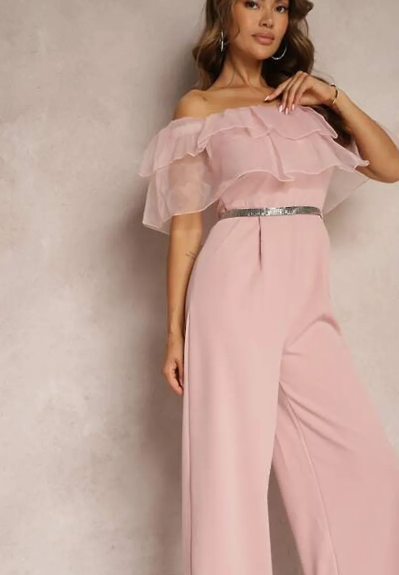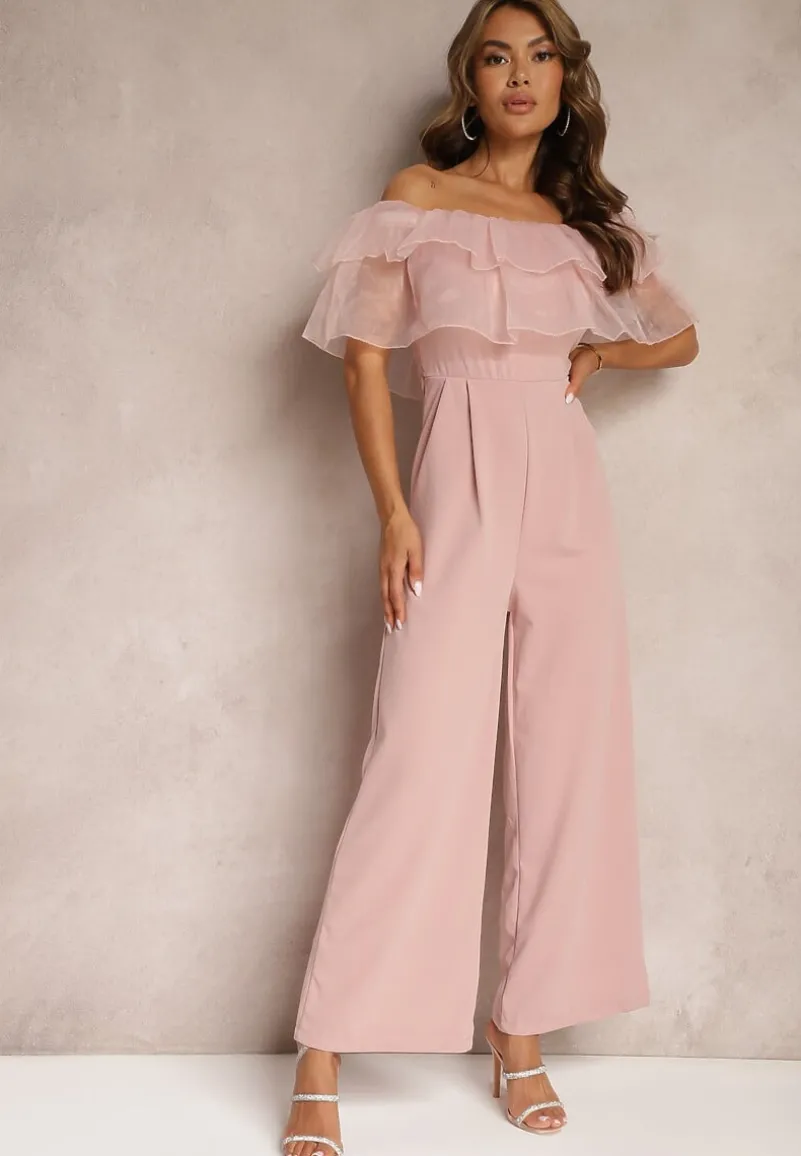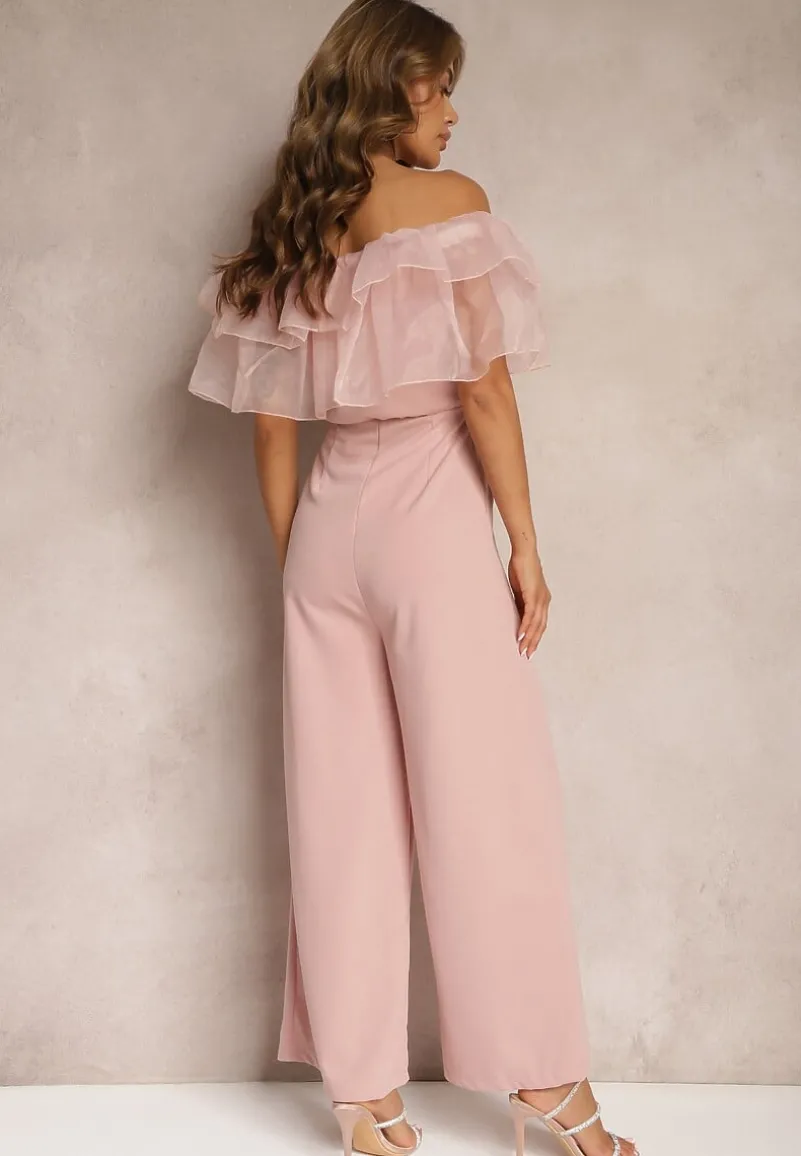 Ciemnoróżowy Koktajlowy Kombinezon z Falbanką przy Dekolcie bez Rękawów Tessita