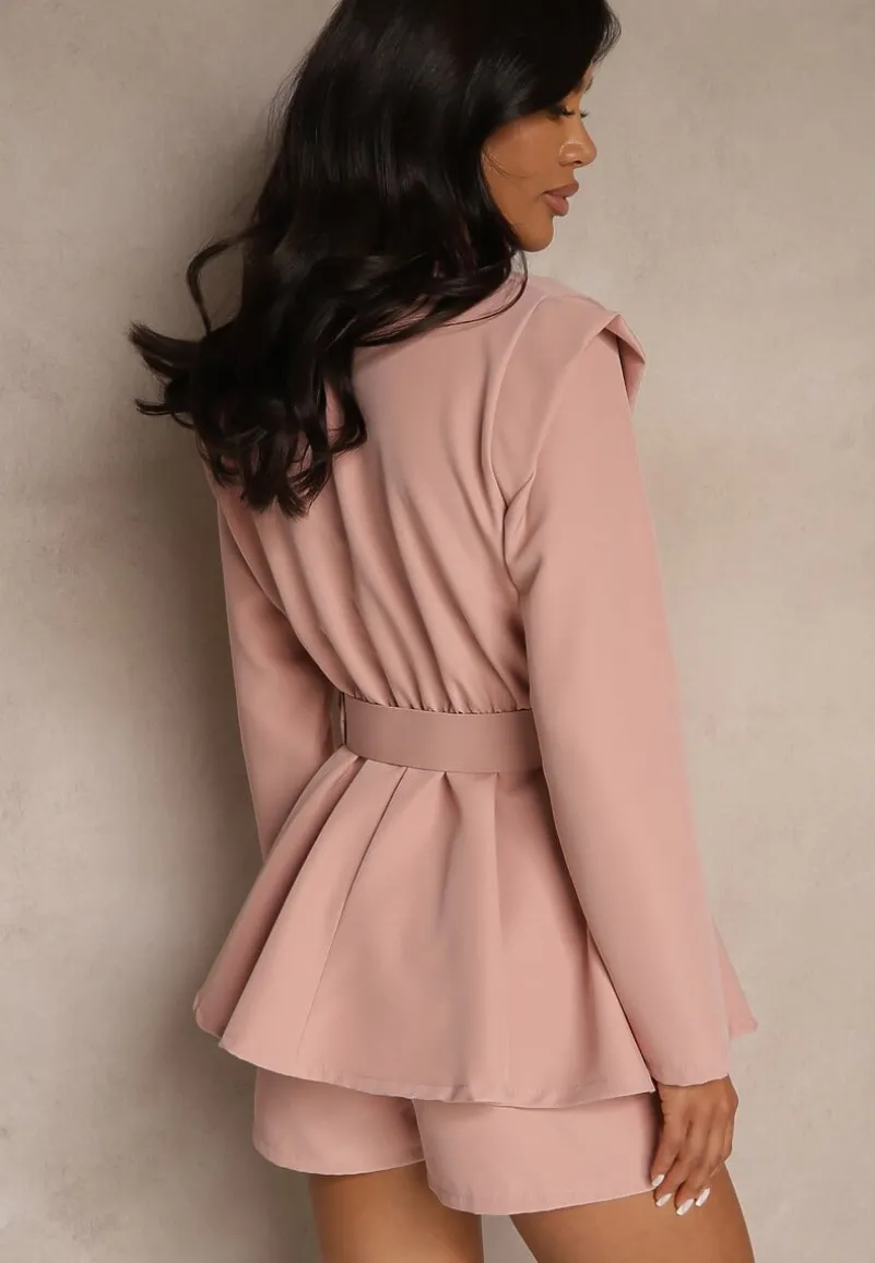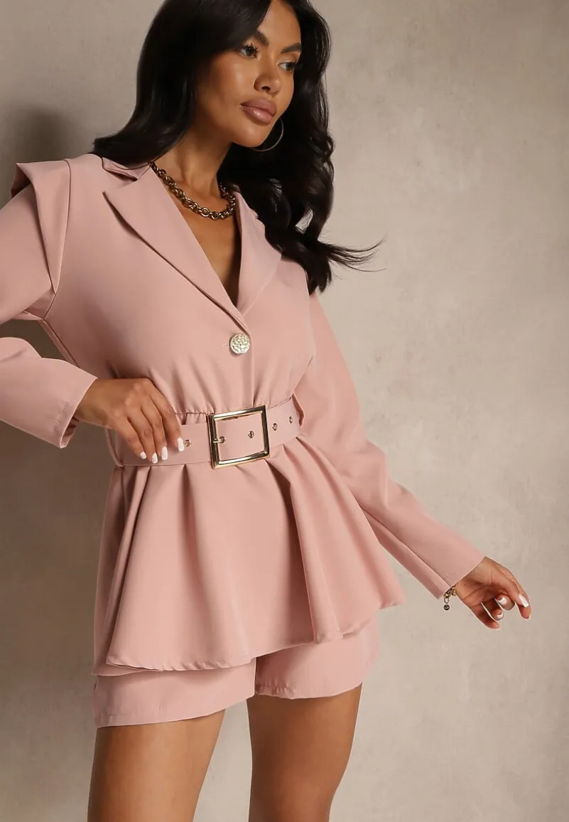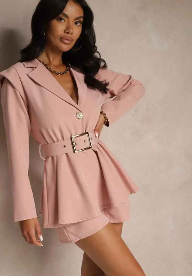 Ciemnoróżowy Taliowany Kombinezon Imitujący Garnitur z Paskiem i Cyrkoniami Milazi