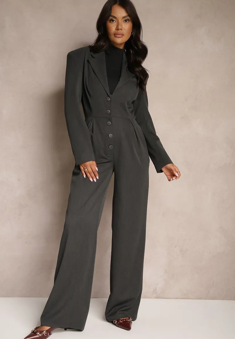 Ciemnoszary Taliowany Kombinezon na Guziki w Garniturowym Stylu z Wiskozą Wide Leg Avarella