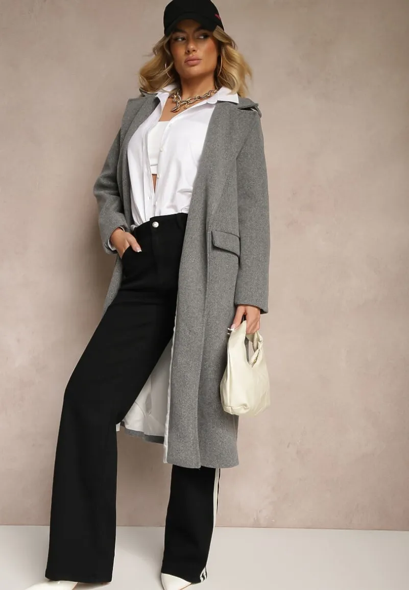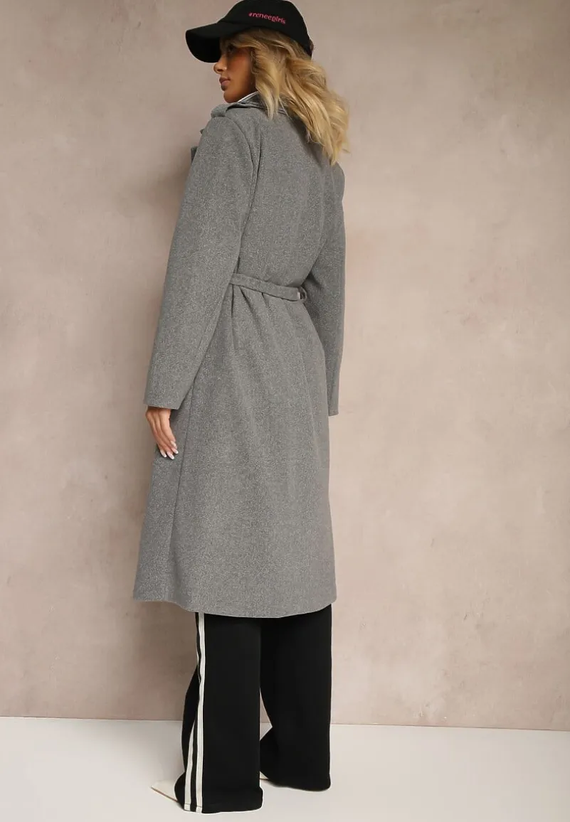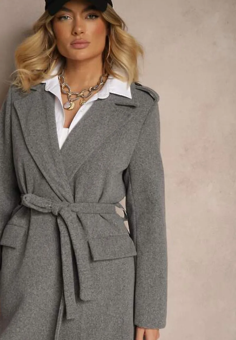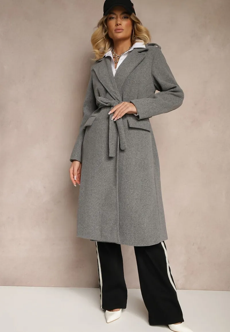 Płaszcz Seraphique o kobiecym, taliowanym kroju, sięgający za kolano. Wiązany w pasie materiałowym paskiem. Na ramionach ozdobne pagony z guzikami.