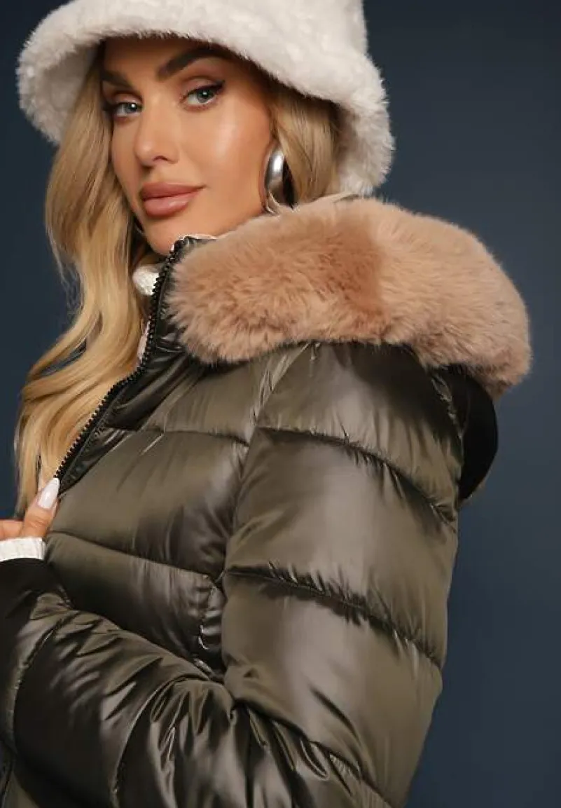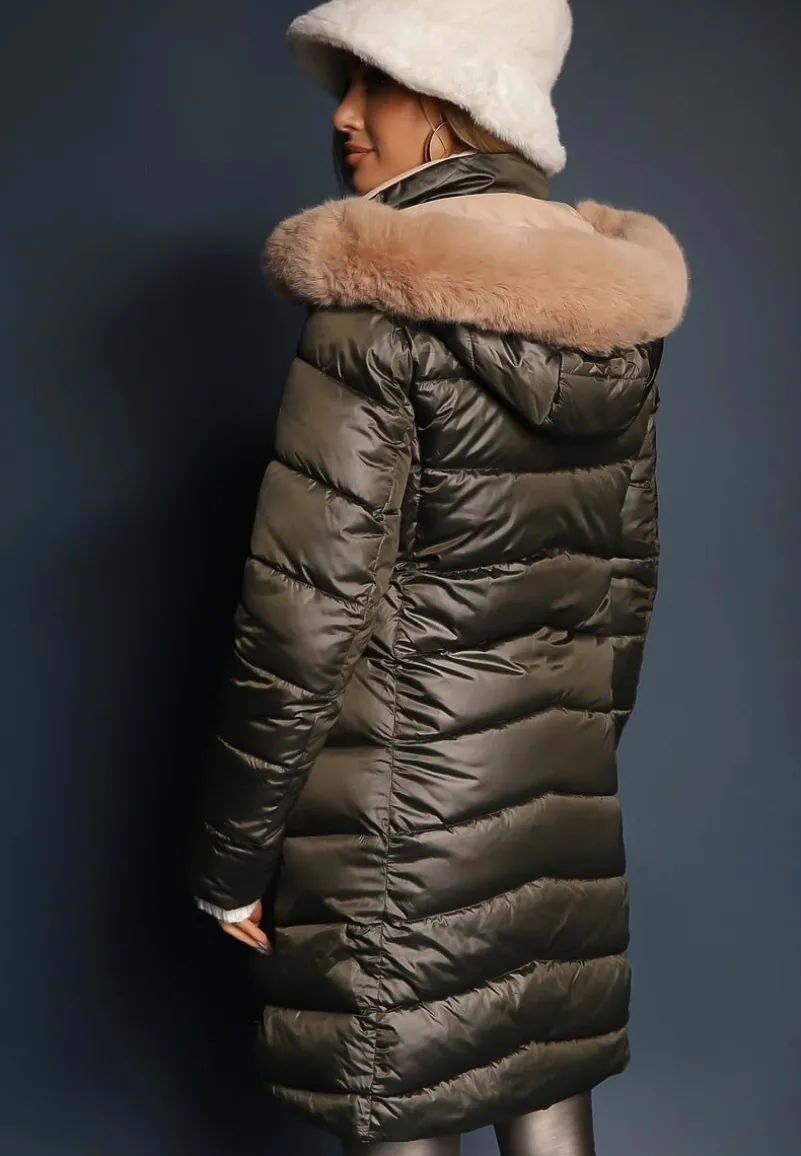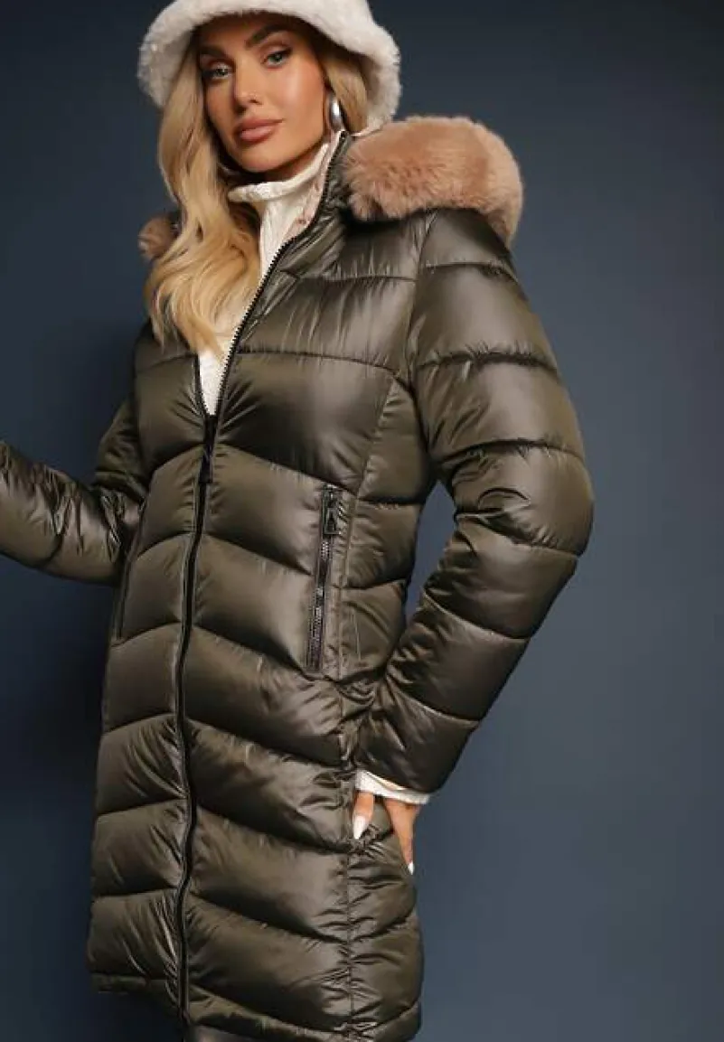 Kurtka Nuncos sięgająca przed kolano, o dwustronnym fasonie. Z jednej strony pikowana. Zasuwana z przodu na zamek błyskawiczny. Posiada odpinany kaptur, zdobiony również odpinaną imitacją futerka. Po bokach zasuwane kieszenie, z drugiej strony wsuwane.