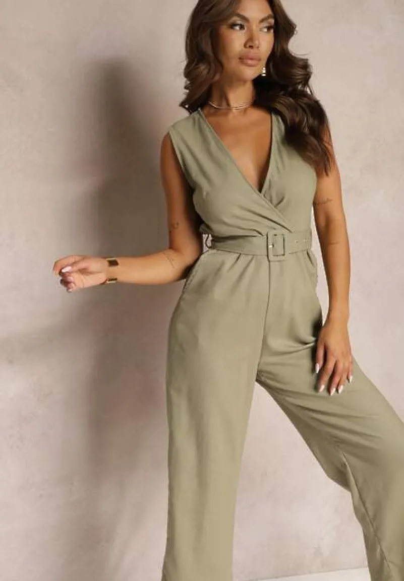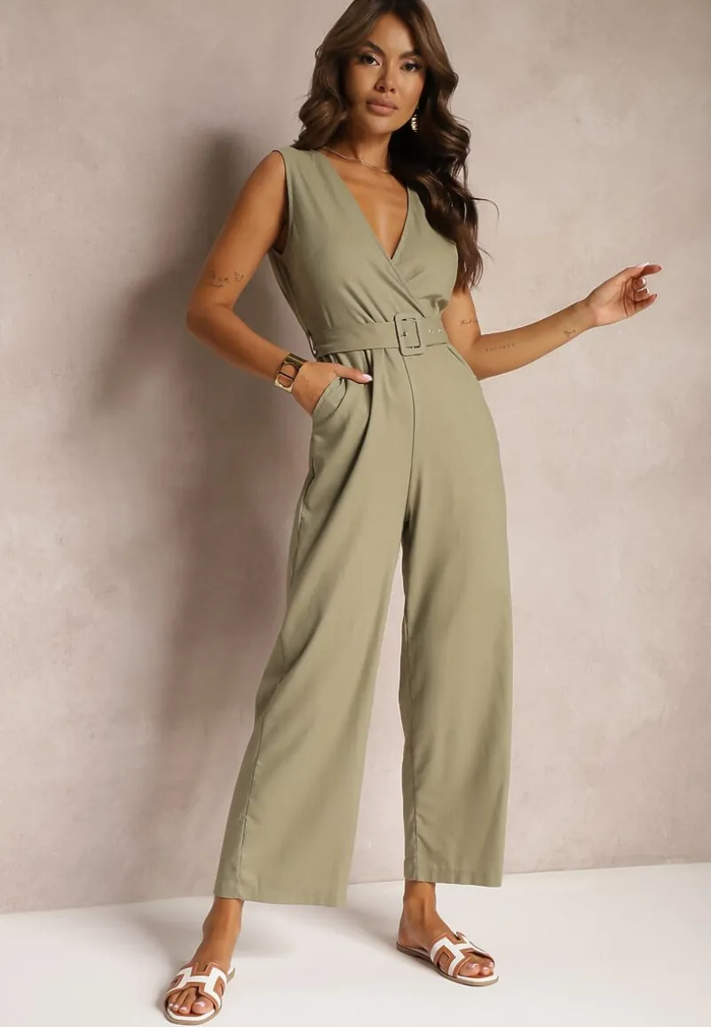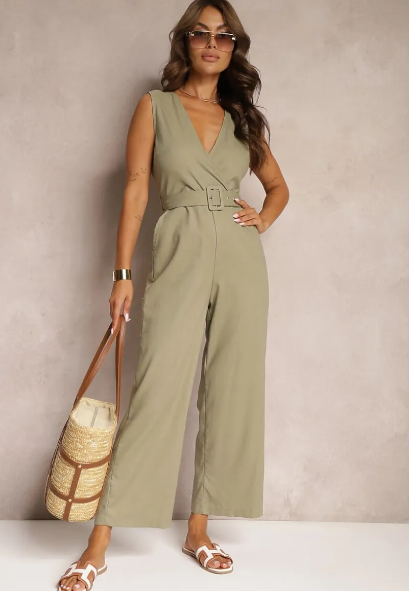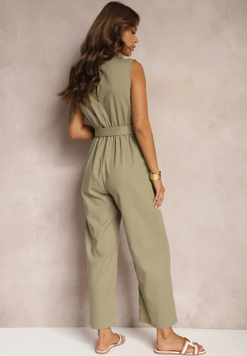 Ciemnozielony Bawełniany Kombinezon z Kopertowym Dekoltem Paskiem z Klamrą i Gumką w Talii Risalen