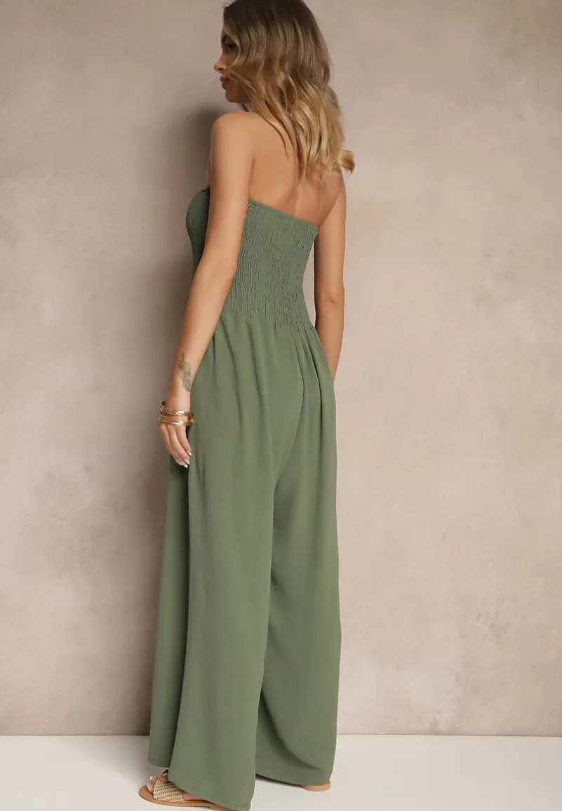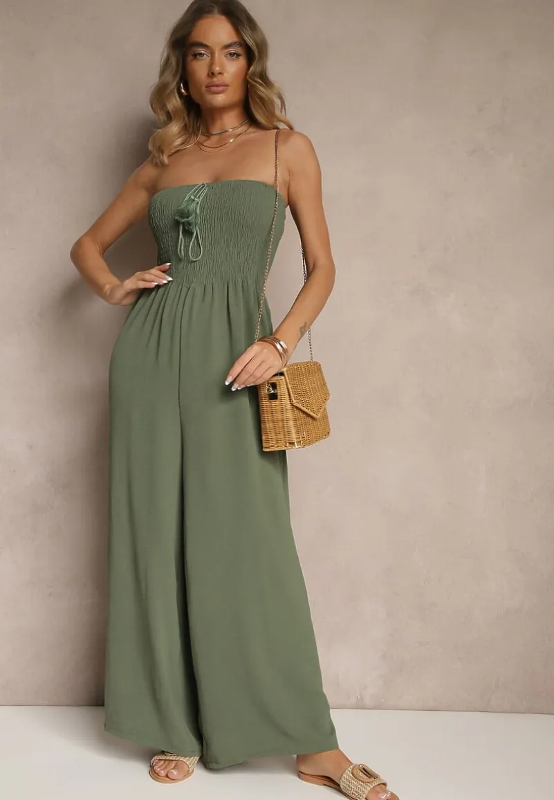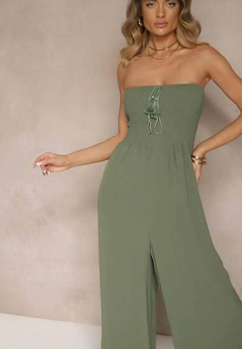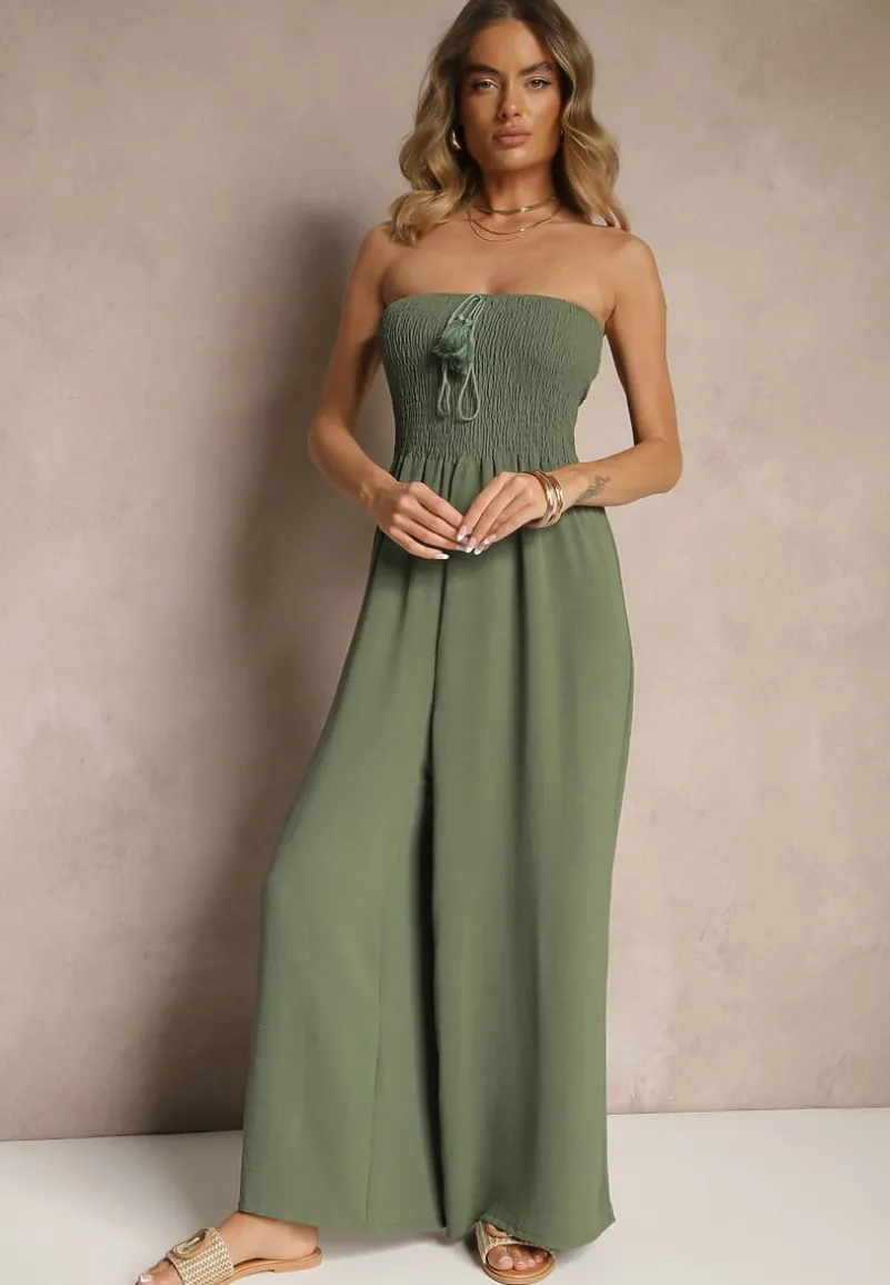 Ciemnozielony Kombinezon Bandeau z Szeroką Nogawką Zdobiony Frędzlami Dovaira