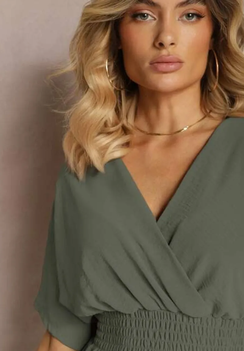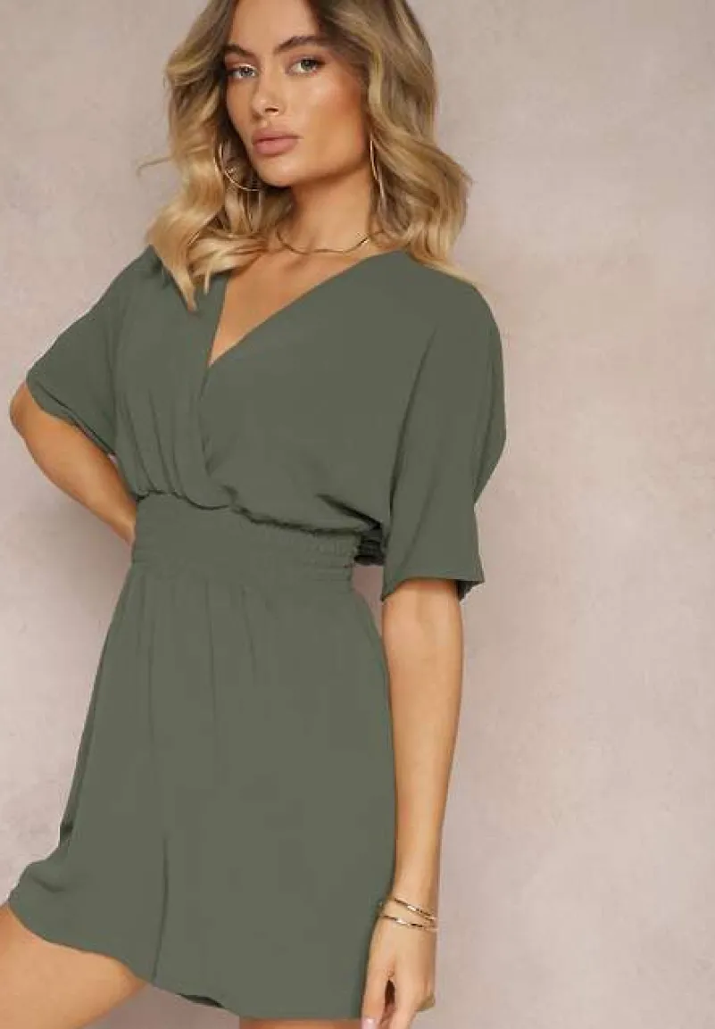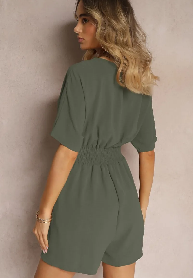 Ciemnozielony Kombinezon Kopertowy z Gumką w Pasie Fandrea