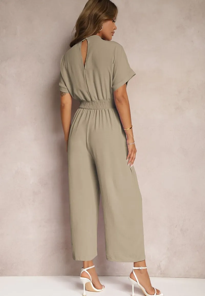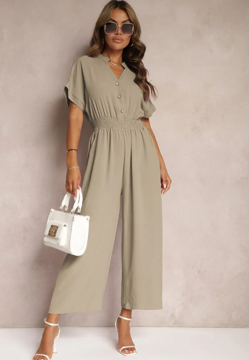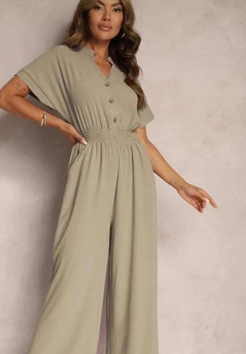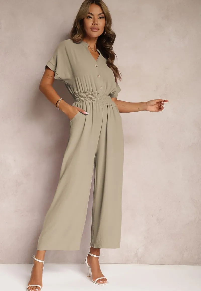 Ciemnozielony Taliowany Kombinezon z Wiskozy Zapinany na Guziki Frisea