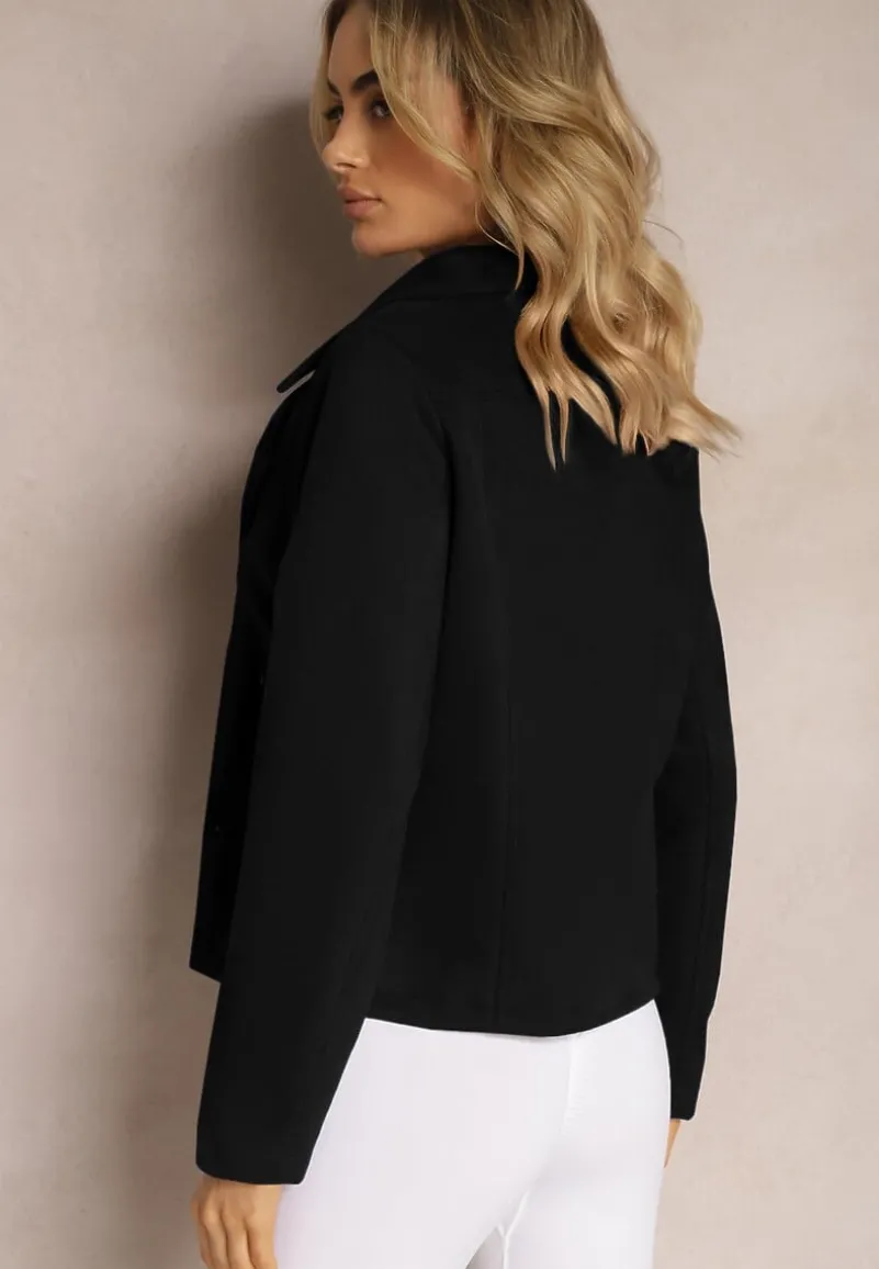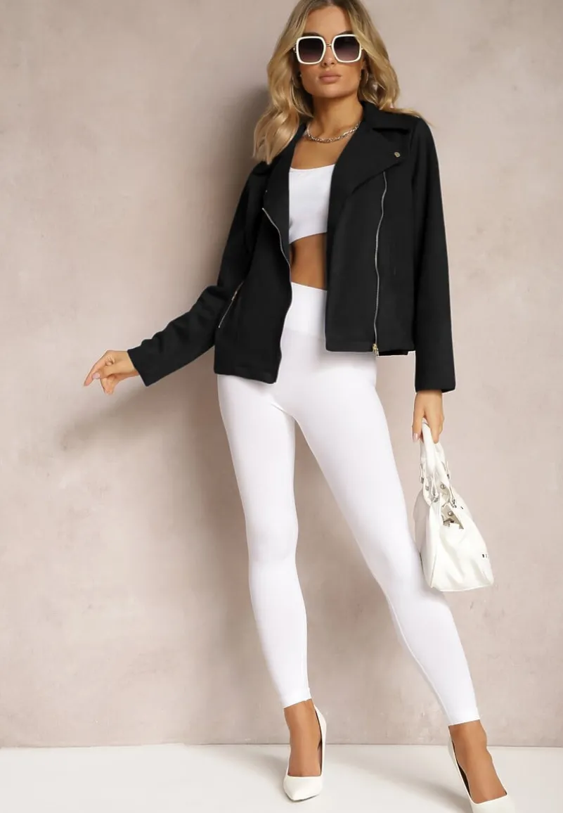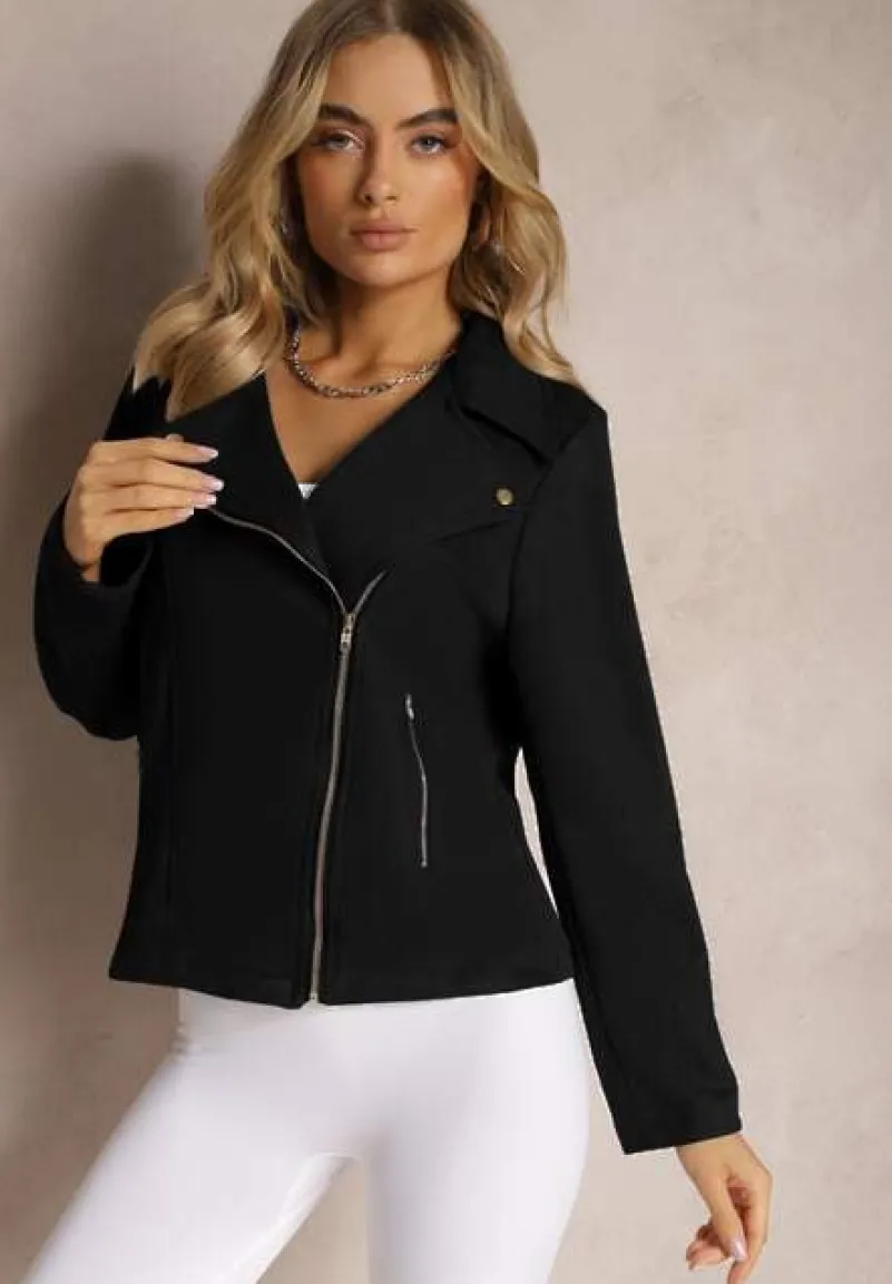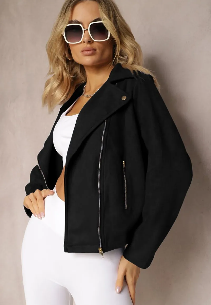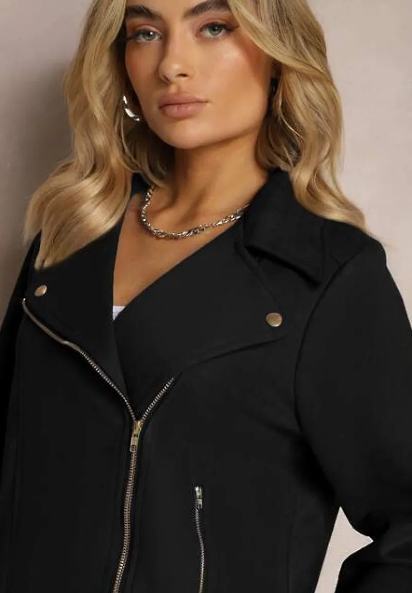 Kurtka Kmiya o asymetrycznym fasonie ramoneski z ekozamszu. Posiada zasuwane kieszonki. Ramoneska z linii plus size, dostępna w większych rozmiarach.