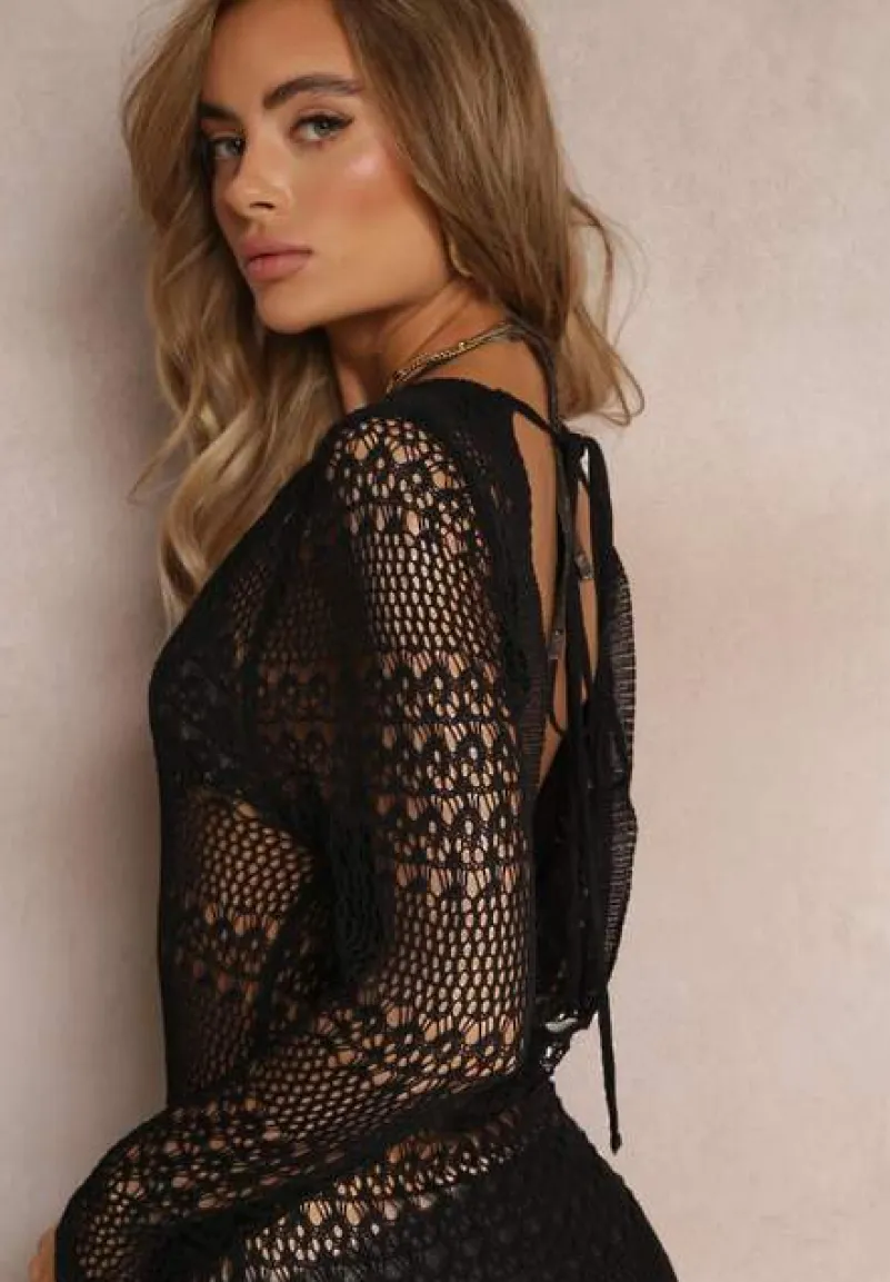 Ażurowa sukienka Odemia z długimi rękawami. Model w stylu narzutki, wiązany na plecach troczkiem.