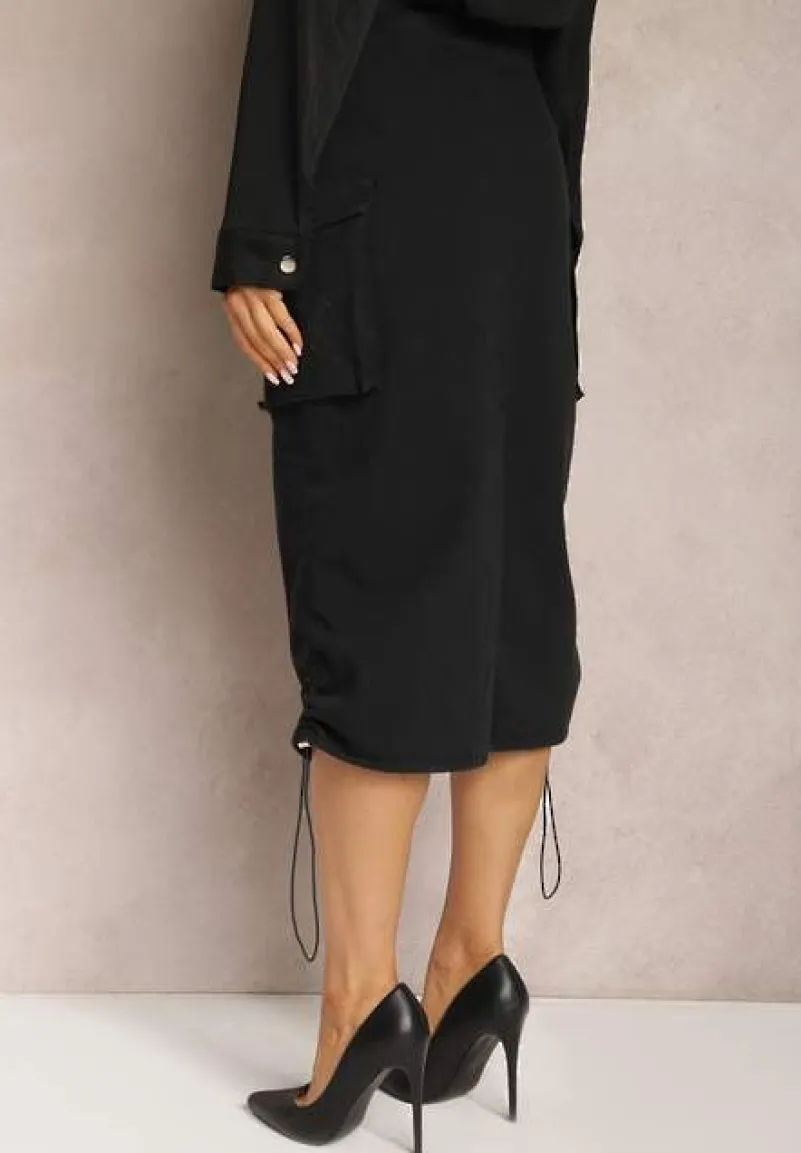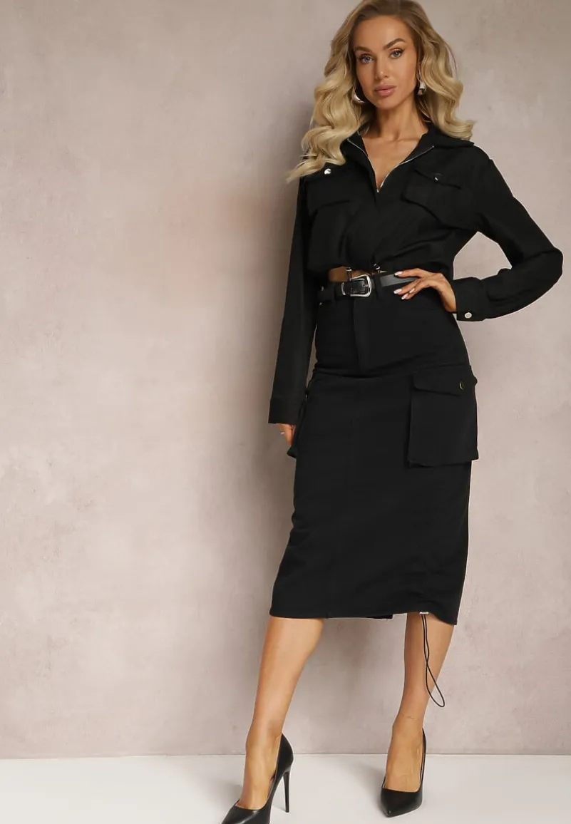 Spódnica Timnitos o długości midi i fasonie cargo. Po bokach wsuwane kieszenie, poniżej naszyte z klapą na guzik. Zestawiona z paskiem z ekoskóry. Dół ściągany ze stoperami.