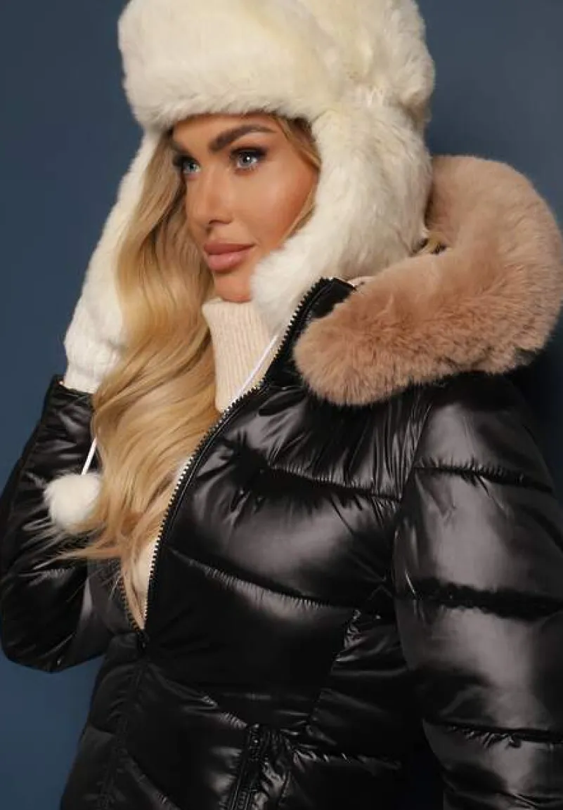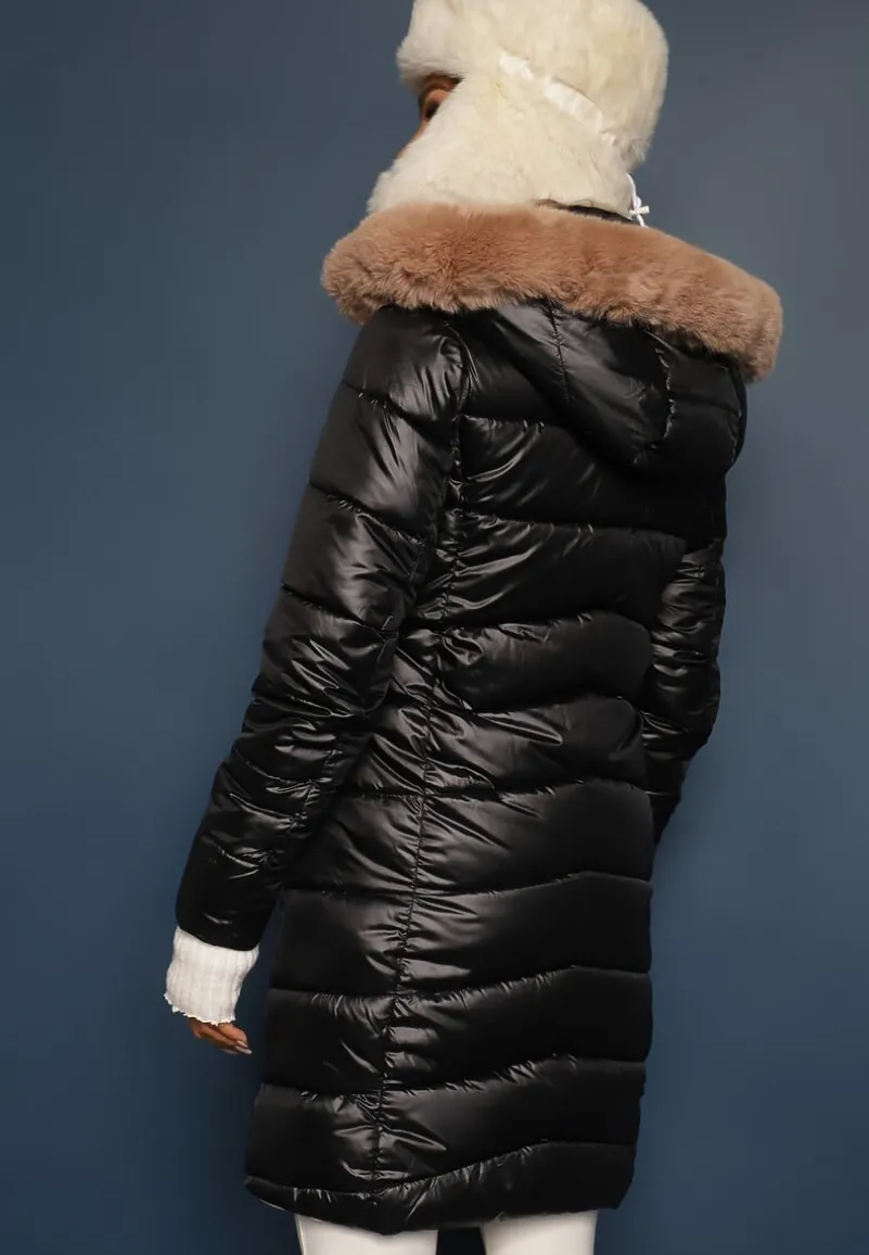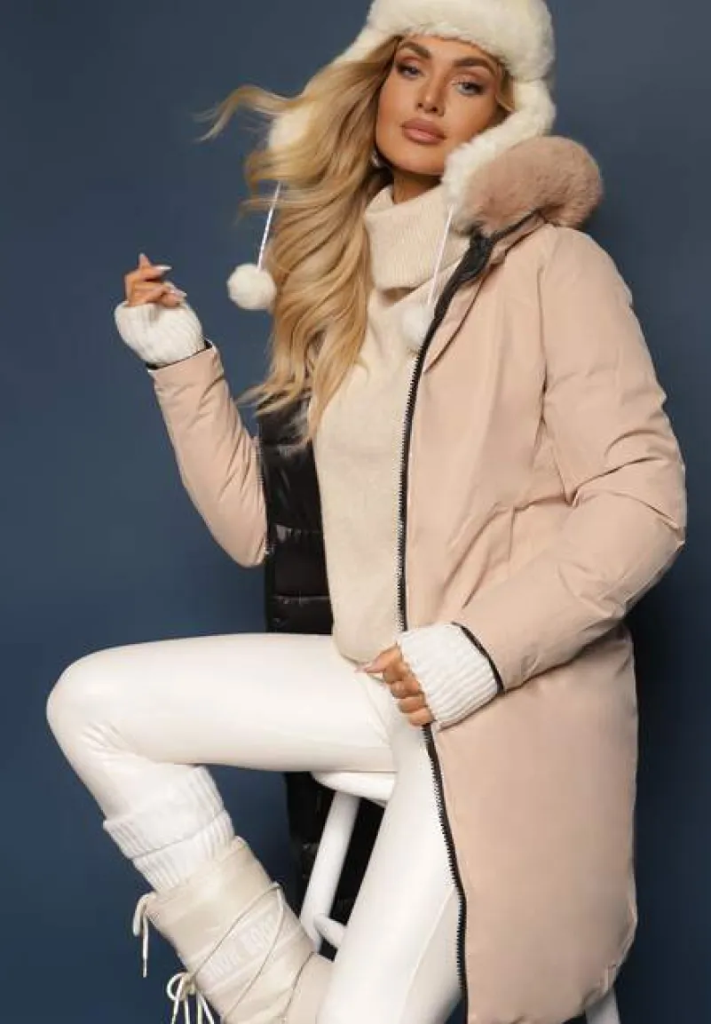 Kurtka Nuncos sięgająca przed kolano, o dwustronnym fasonie. Z jednej strony pikowana. Zasuwana z przodu na zamek błyskawiczny. Posiada odpinany kaptur, zdobiony również odpinaną imitacją futerka. Po bokach zasuwane kieszenie, z drugiej strony wsuwane.