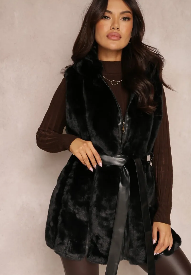 Futrzana kamizelka Lemiza zapisana na suwak i wiązana na skóropodobny pasek w talii. Wykonana ze sztucznego futerka. Ozdobiona wstawkami z ekoskóry. Modna kamizelka Lemiza posiada nieodpinany kaptur.