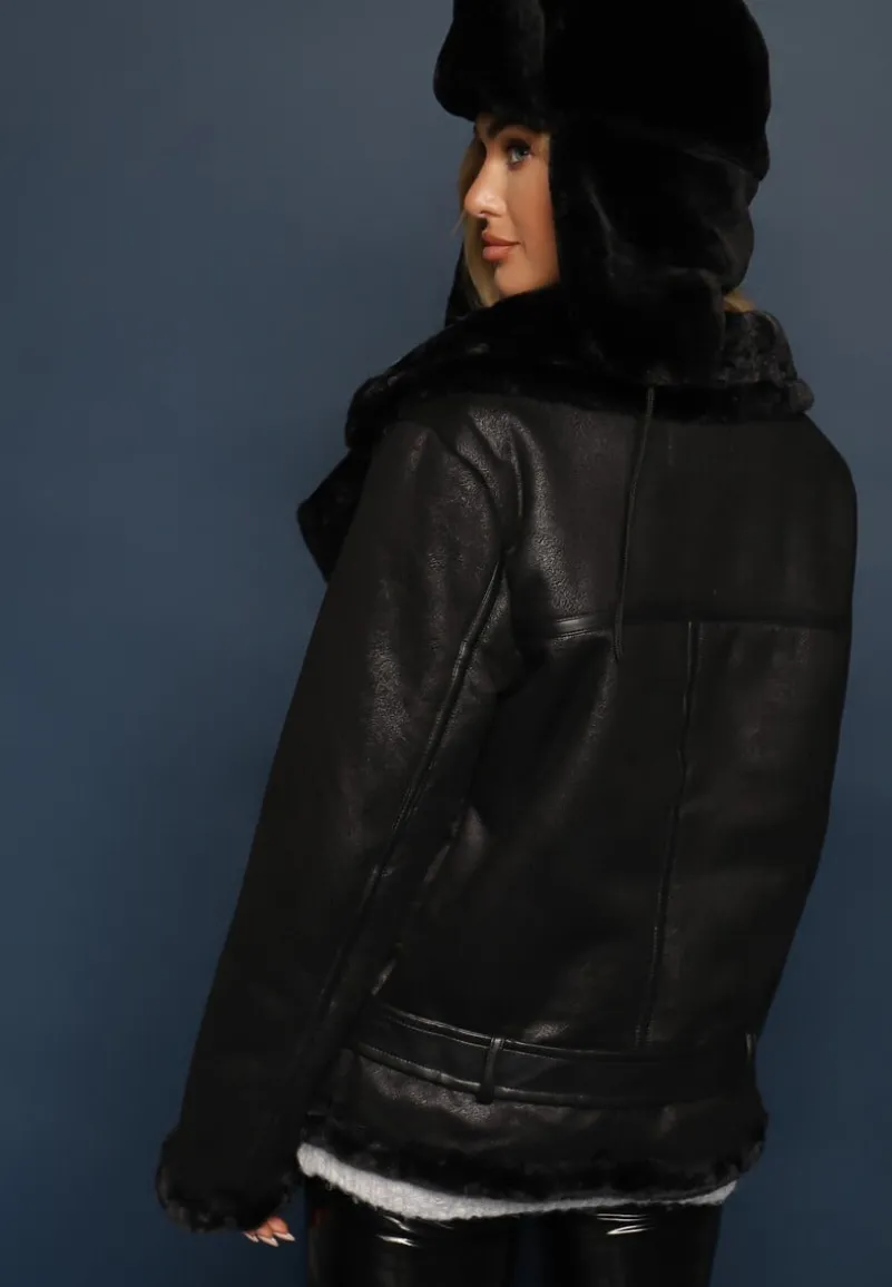 Kurtka Emaro z wywijanym kołnierzem i rękawami. W środku ocieplona futerkiem. Posiada zasuwane kieszenie na wysokości pasa, a na dole ozdobny pasek z klamrą.