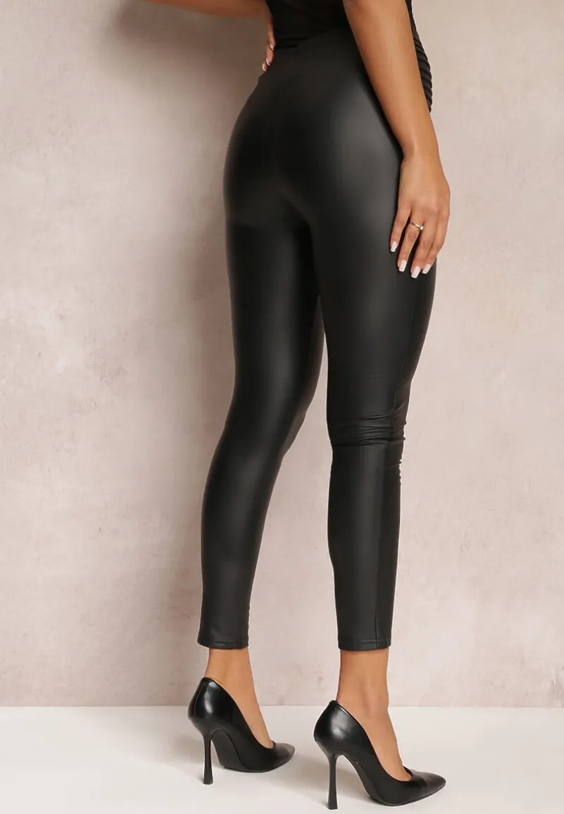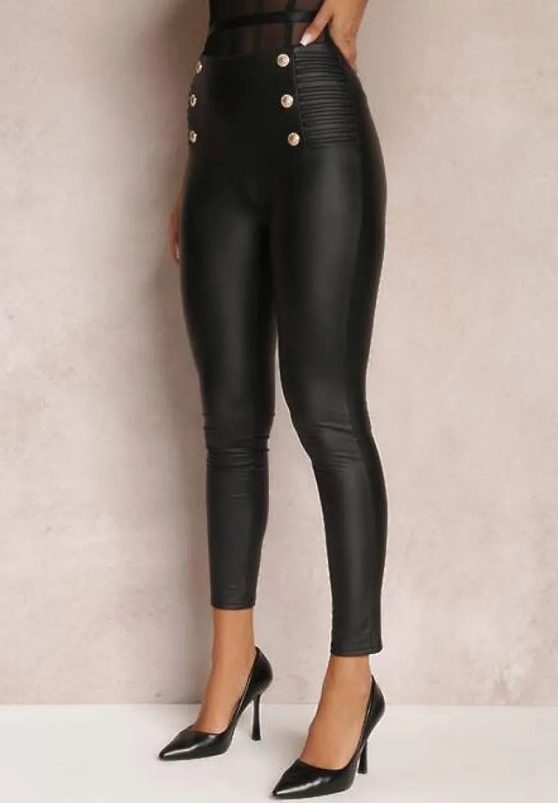 Legginsy Syah to must have w Twojej szafie. Wykonane z imitacji skóry, zdobione w pasie napami oraz drapowaniem przyciągają spojrzenia!