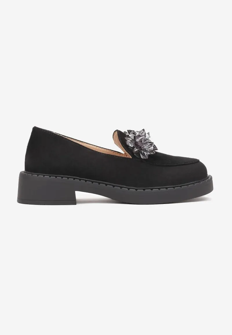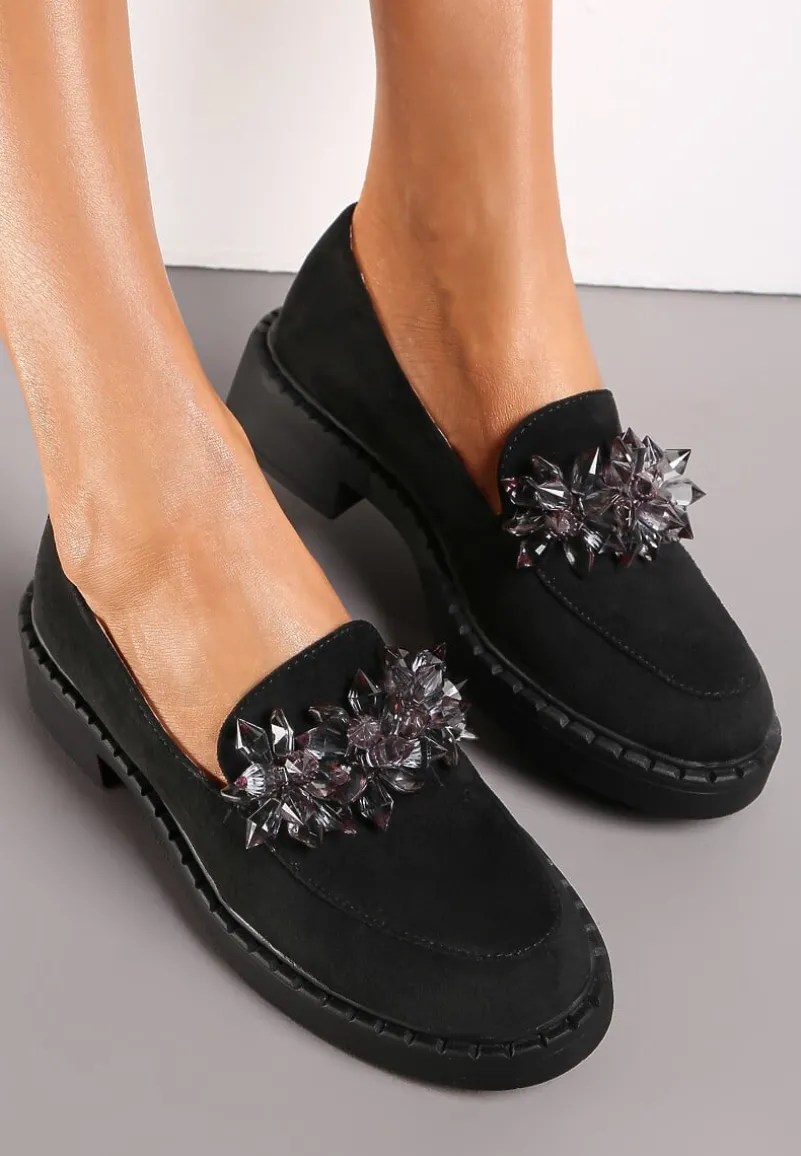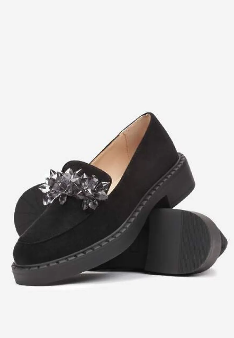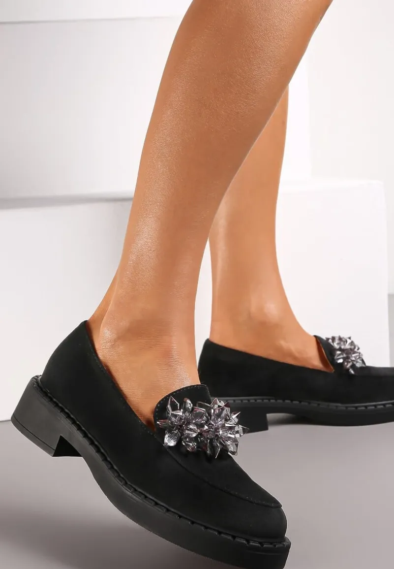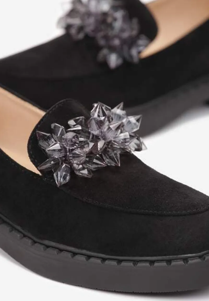 Mokasyny Limiha z modną aplikacją z kryształków, wykonane z imitacji zamszu, dodatkowym atutem jest skórzana wkładka.