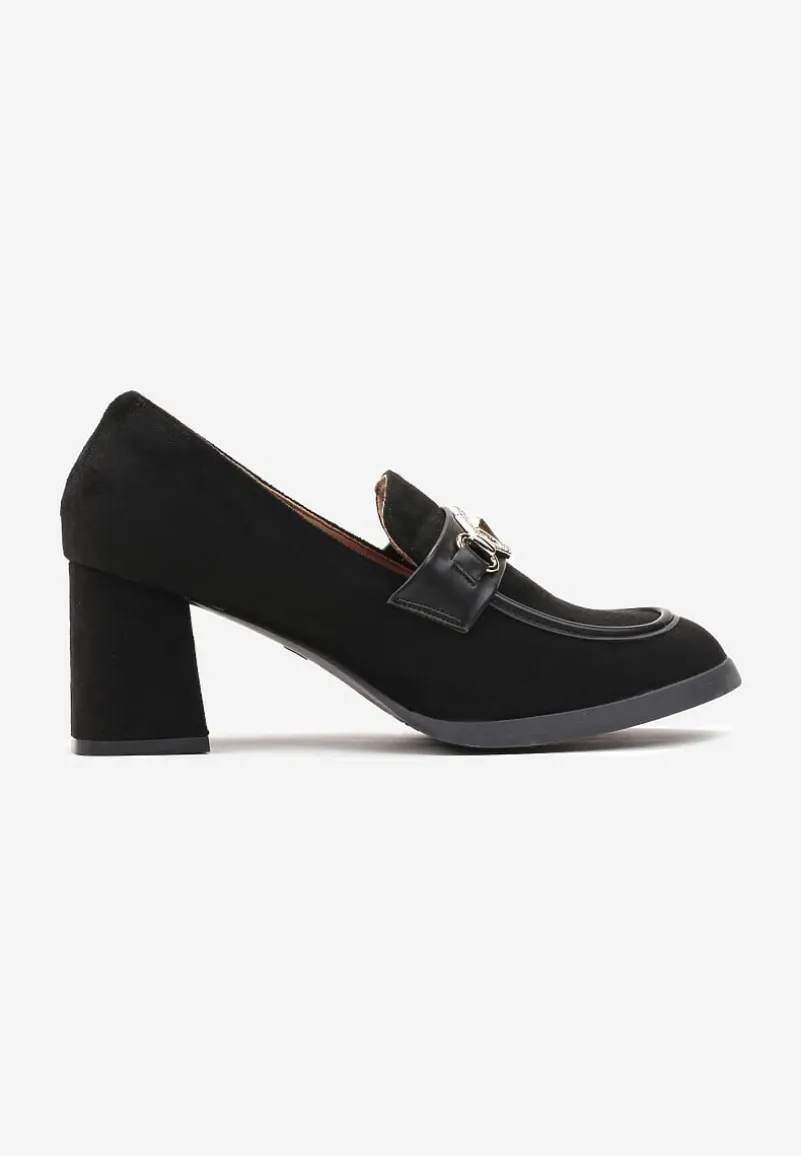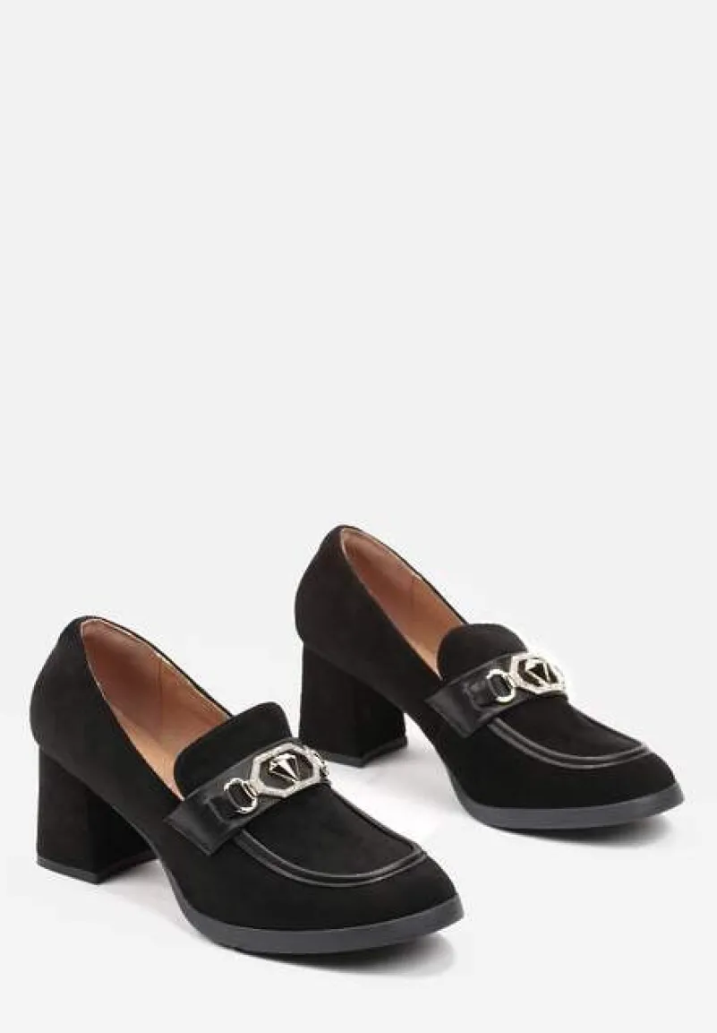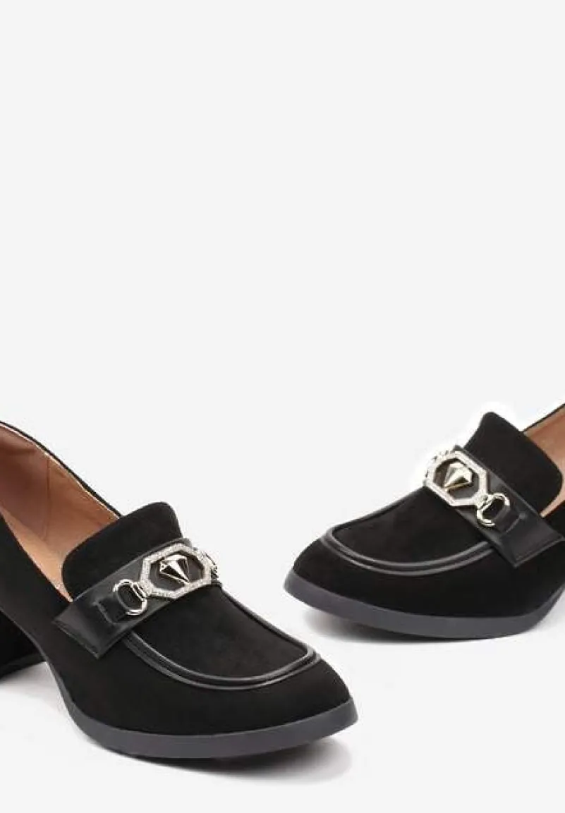 Półbuty Elegia wykonane z ekozamszu. Model w stylu mokasynów na słupku. Z przodu ozdobna klamra z cyrkoniami i diamentem.