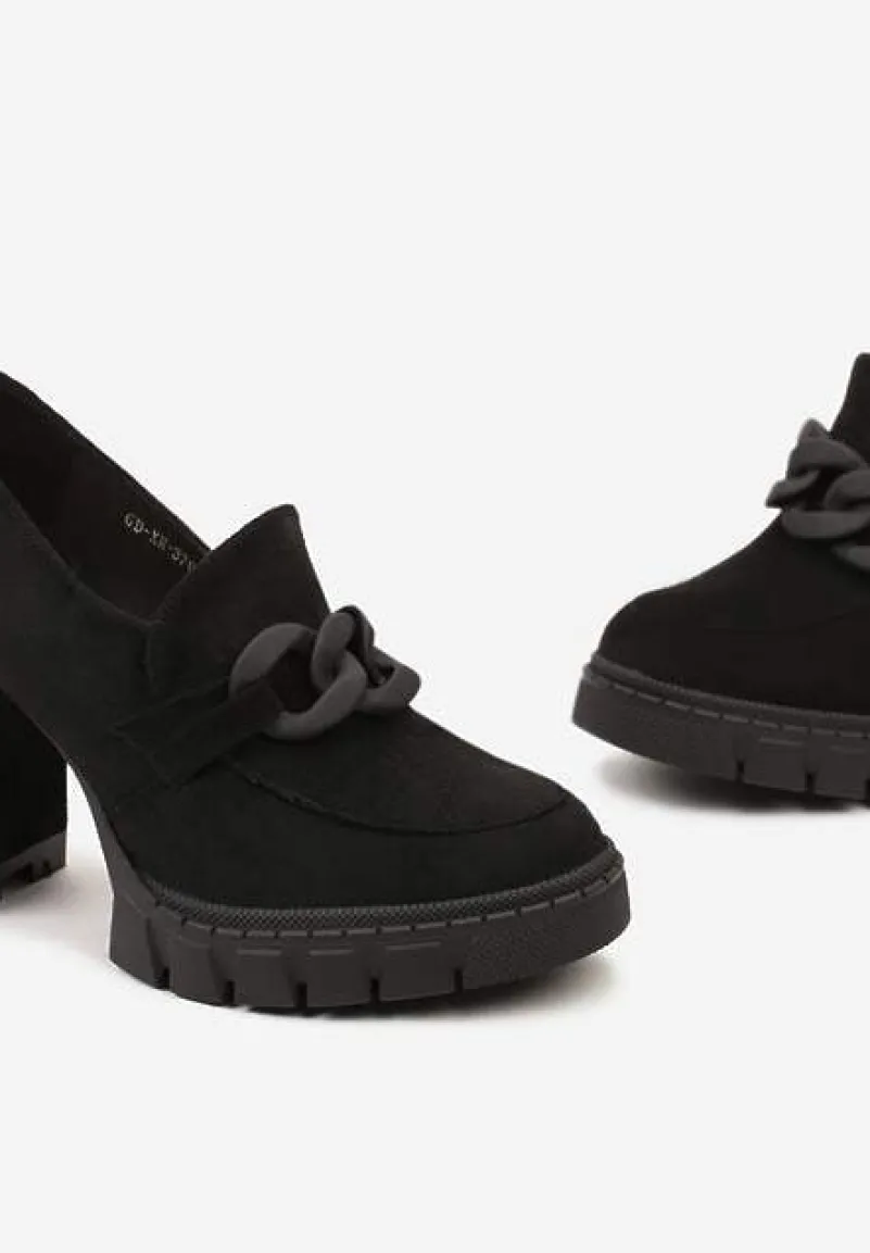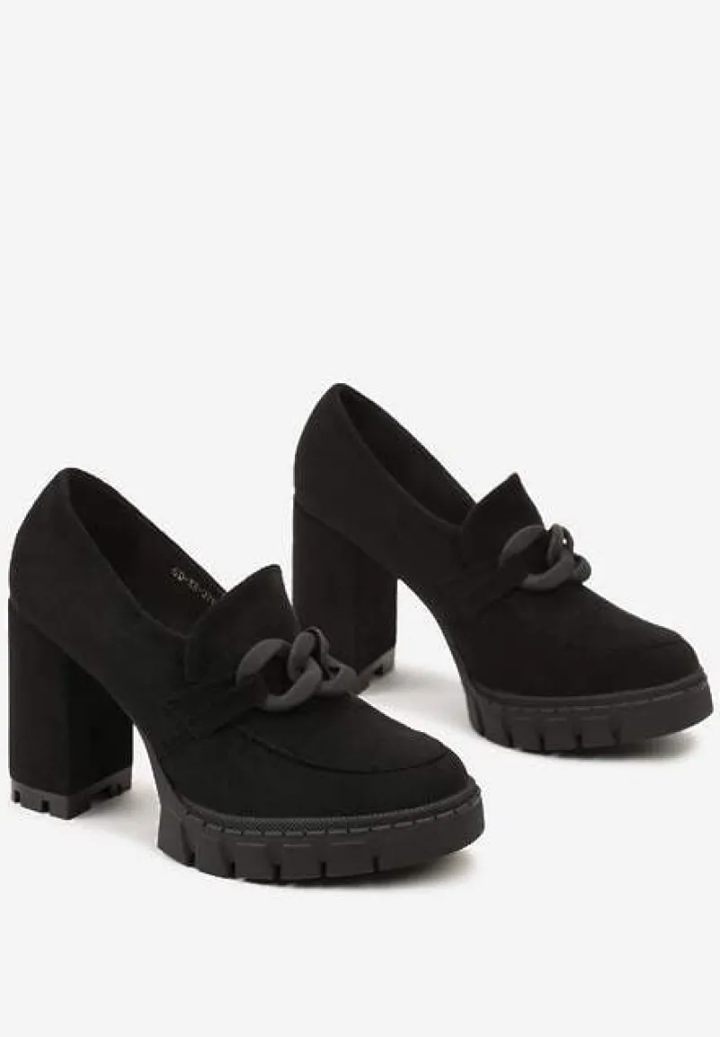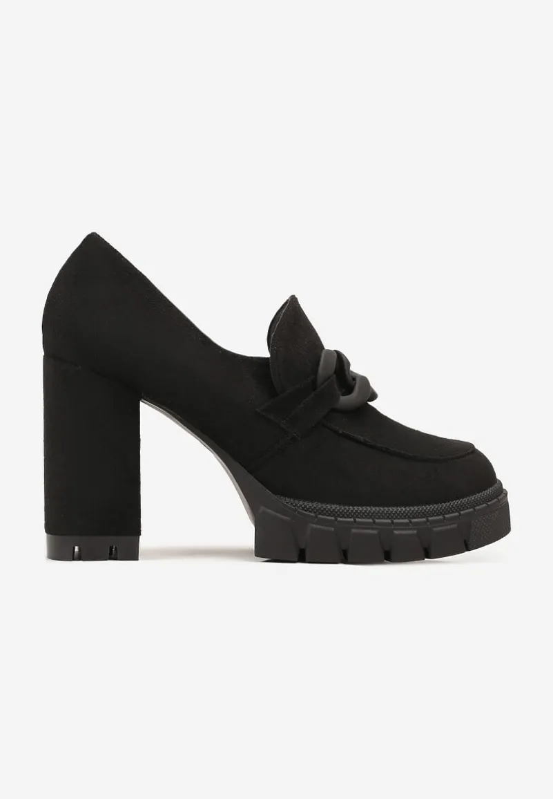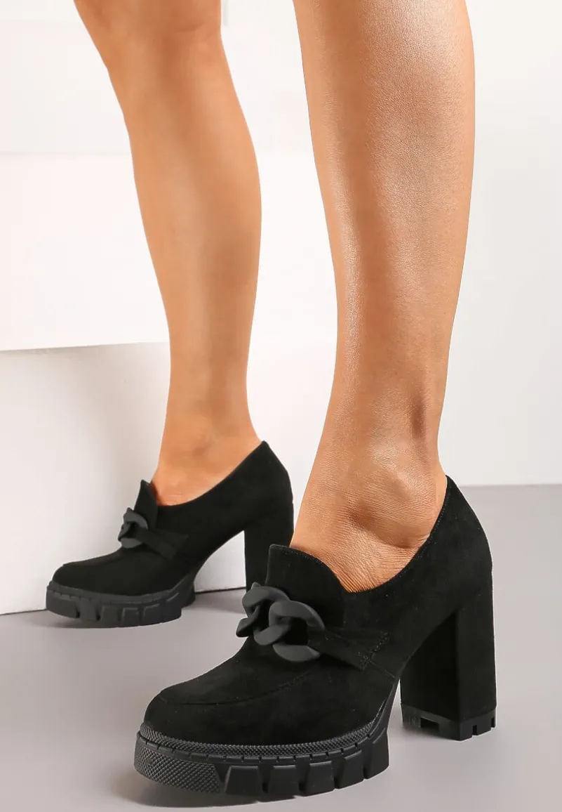 Półbuty Likorna ze skórzaną wkładką i klamrą w kształcie łańcuszka. Elegancki model na słupku i platformie z bieżnikiem.