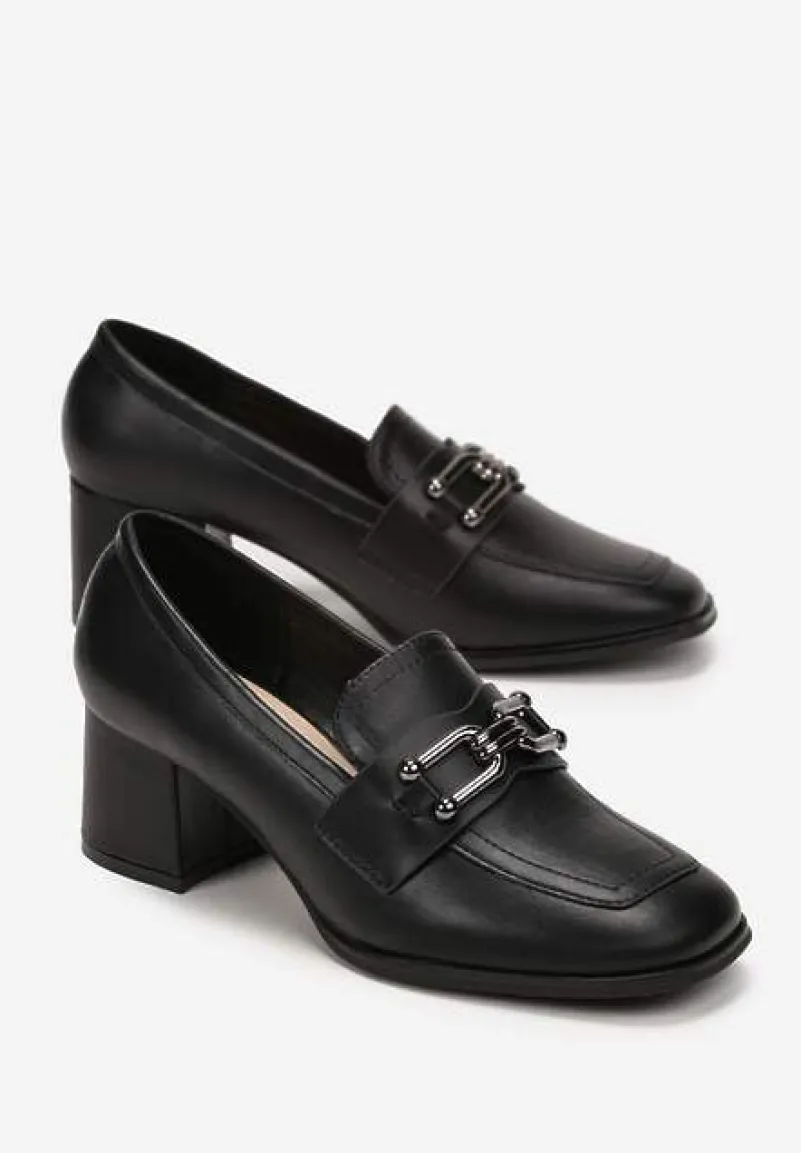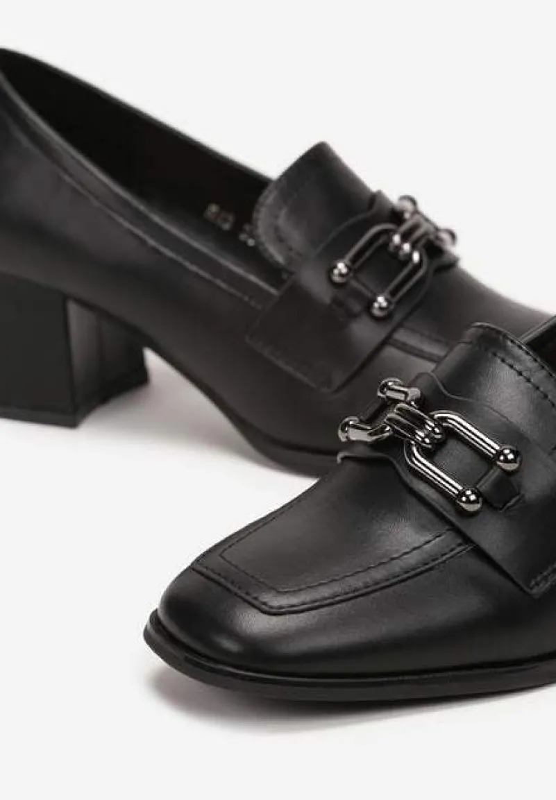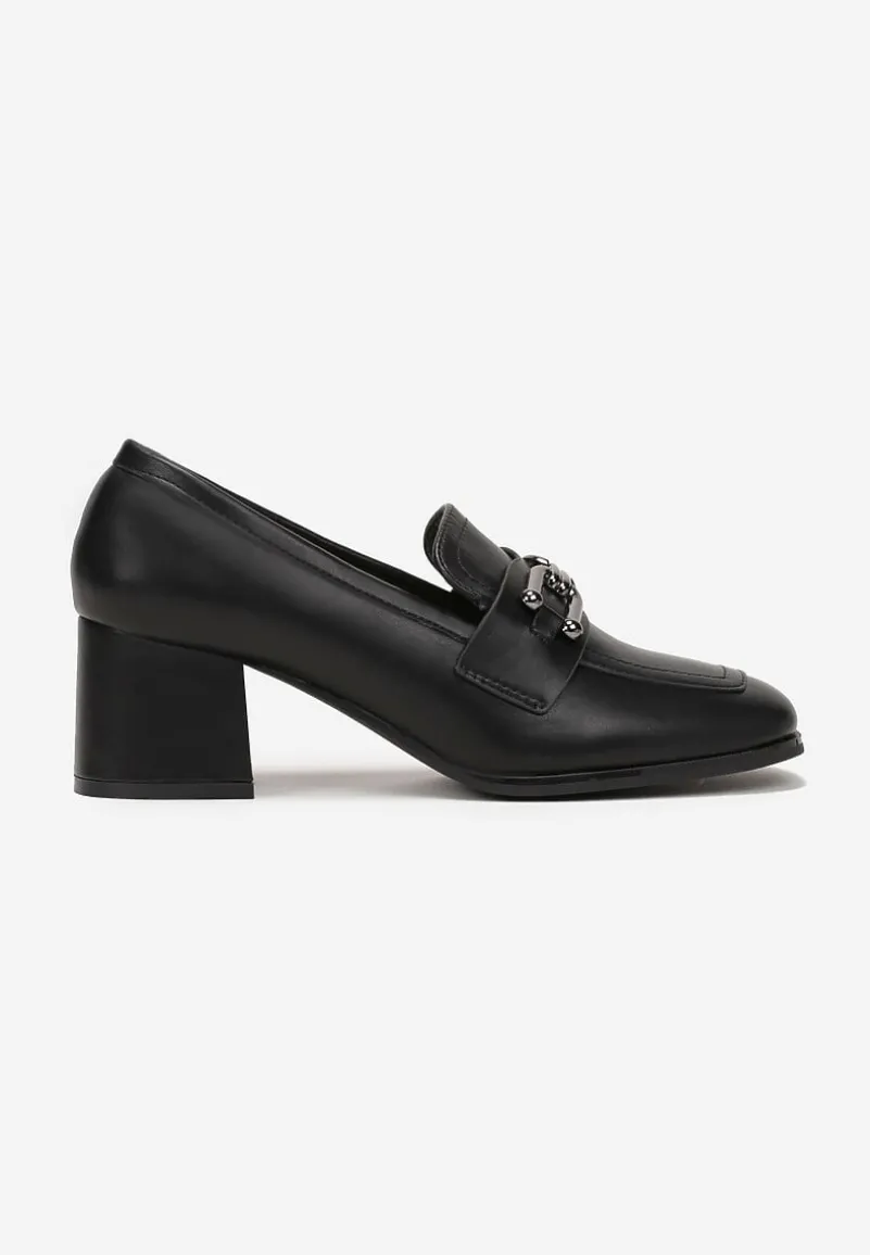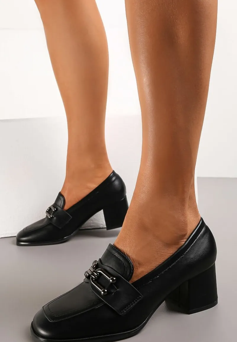 Półbuty Dihan są osadzone na niskim, kwadratowym słupku. Przód ozdabia metaliczna klamra, pojawiają się również ozdobne przeszycia.