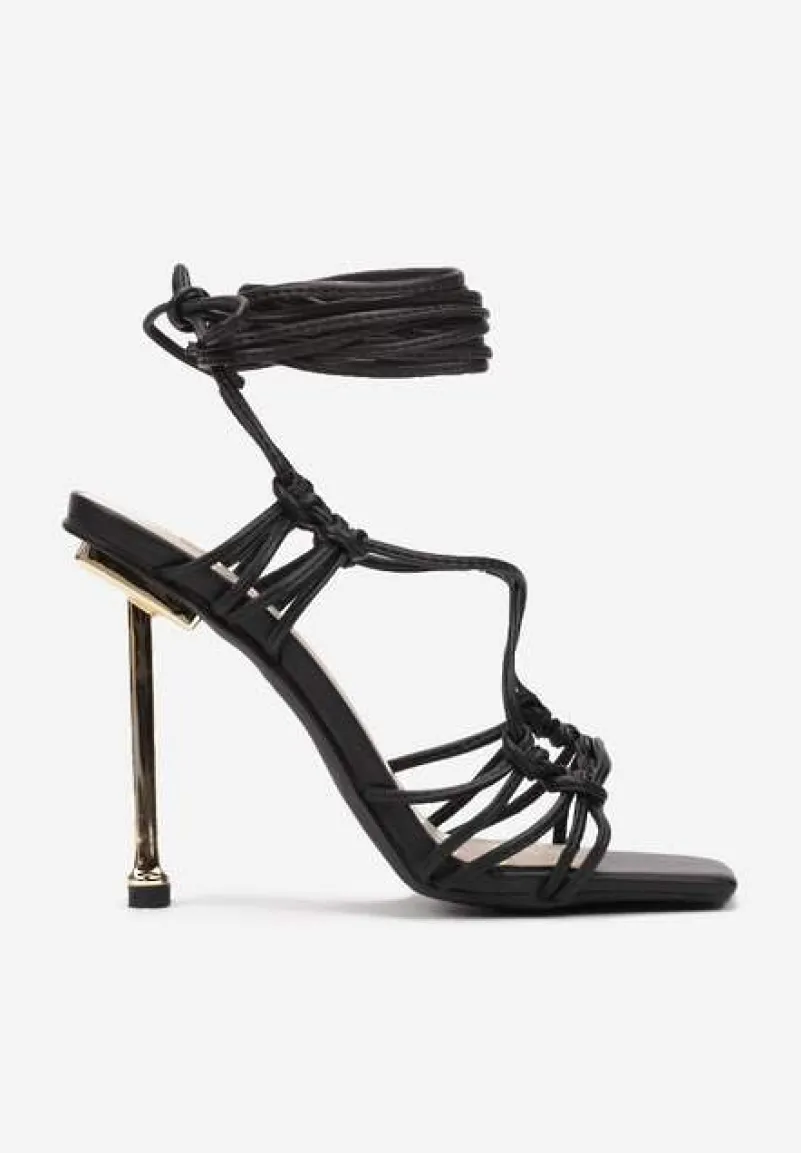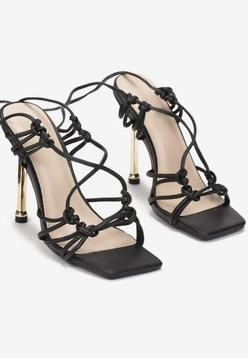 na wysokim, cienkim obcasie. Z modną cholewką wykonaną z kompozycji rzemyków. Kwadratowy nosek. Wiązane wokół kostki lub łydki, w zależności od preferencji. Wykonane z ekoskóry, razem z wkładką. Eleganckie sandały z rzemykami to must have każdej fashionistki! Świetnie pasują do sukienek bodycon i torebek na łańcuszku.