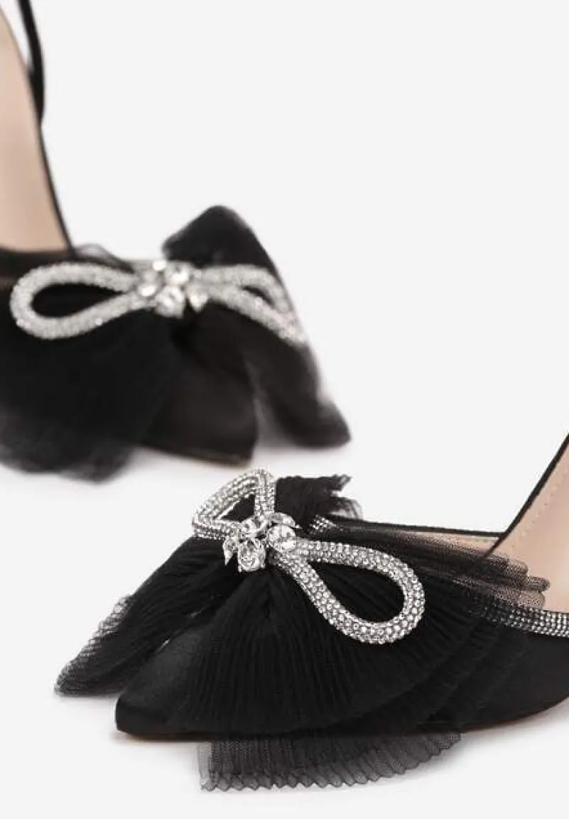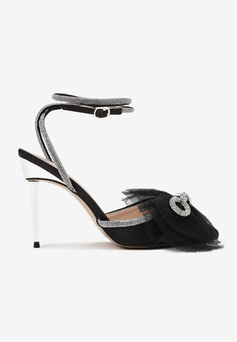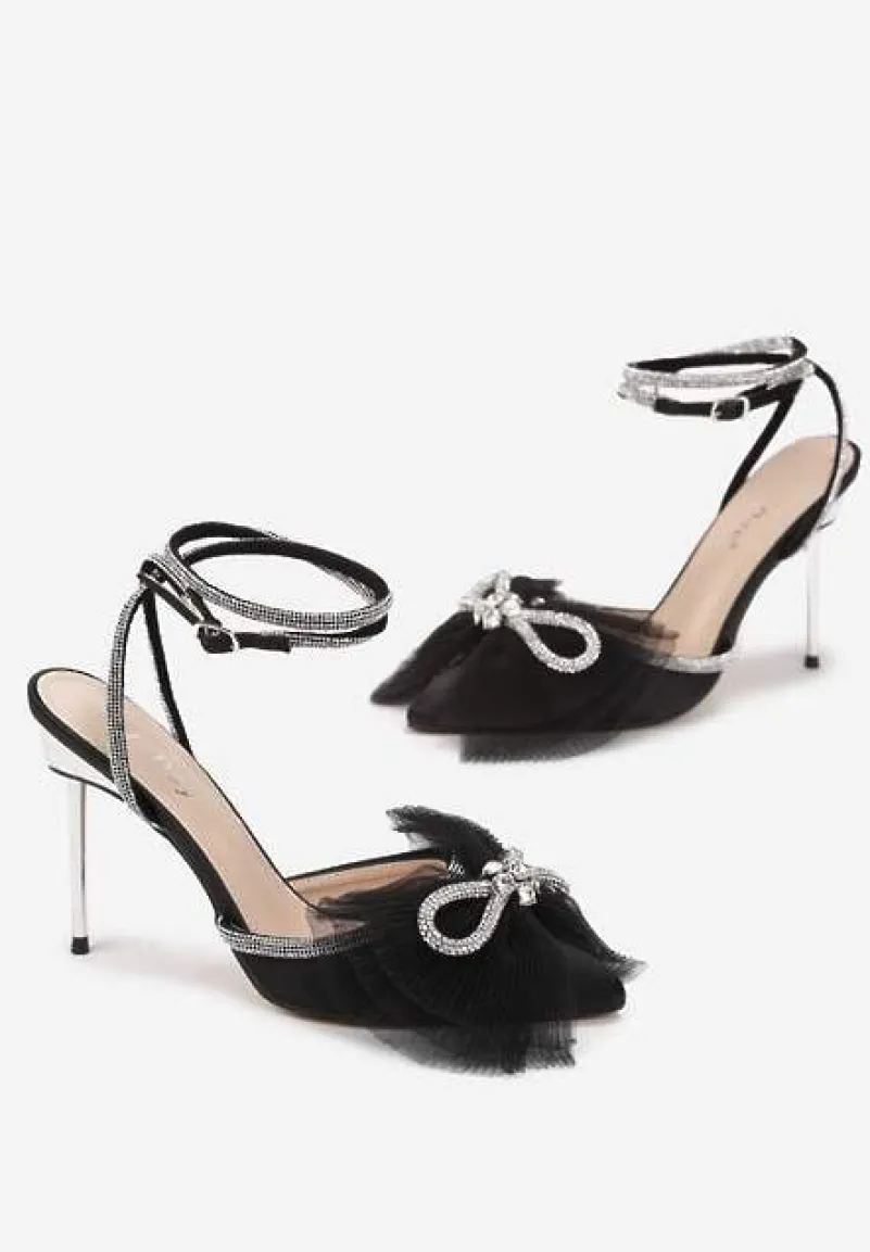 Sandały Alhan w eleganckim stylu, na metalicznej szpilce. Wykonane z satyny, wkładka z ekoskóry. Ze szpiczastym, zabudowanym noskiem. Przód ozdobiono tiulową kokardą i elementem biżuteryjnym z cyrkoniami. Na odkrytej pięcie krzyżują się dwa ozdobne paseczki. Model zapinany wokół kostki na pasek ze sprzączką. Sandały na wysokim obcasie to rewelacyjny dodatek dla każdej pewnej siebie fashionistki. Załóż je do eleganckiej sukienki lub spodni skinny i wyraź swój seksapil!