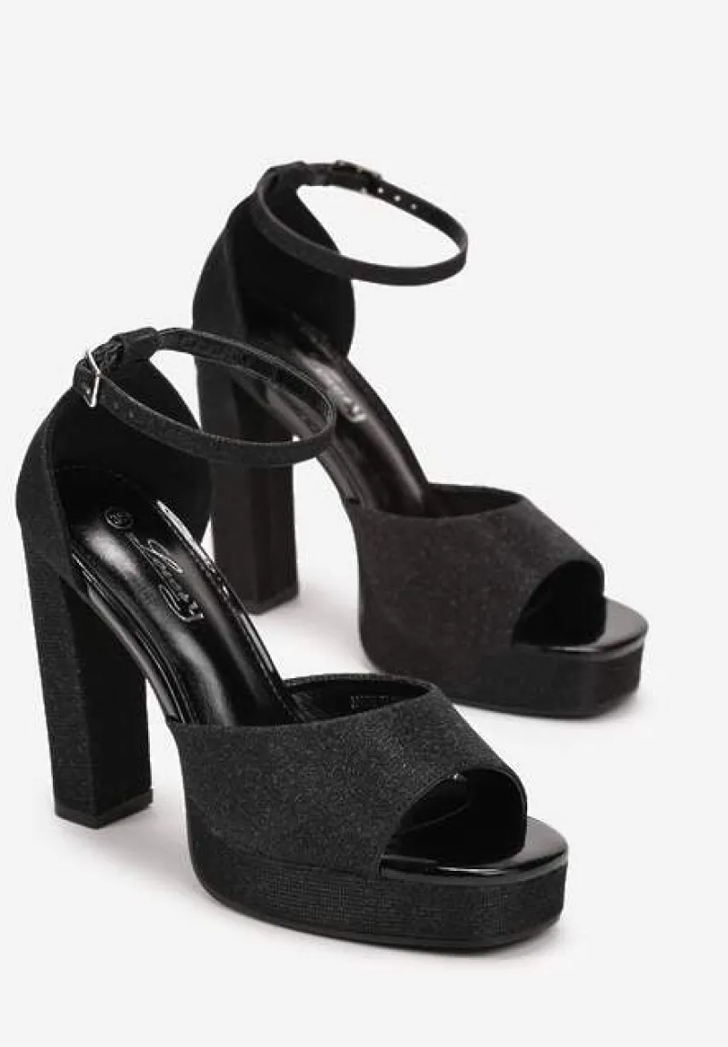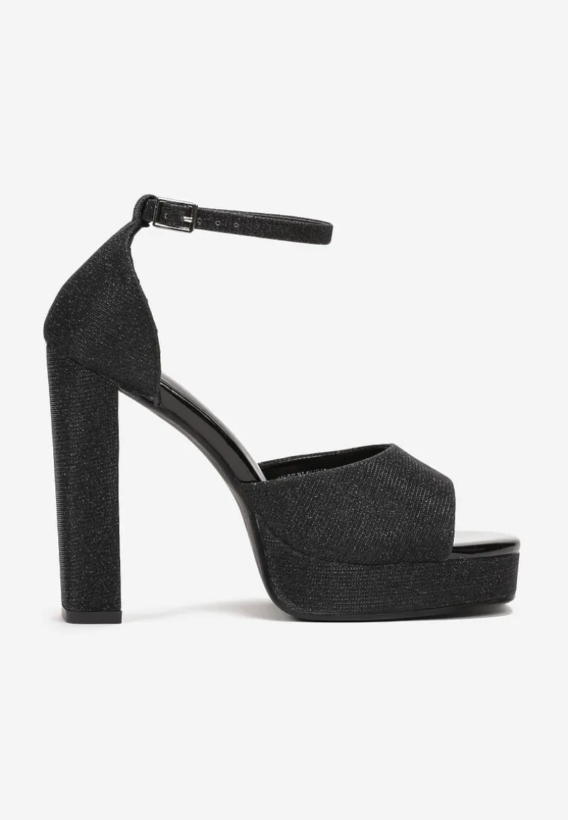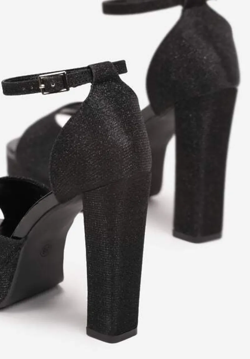 Czarne Sandały Brokatowe na Słupku i Platformie Mudis