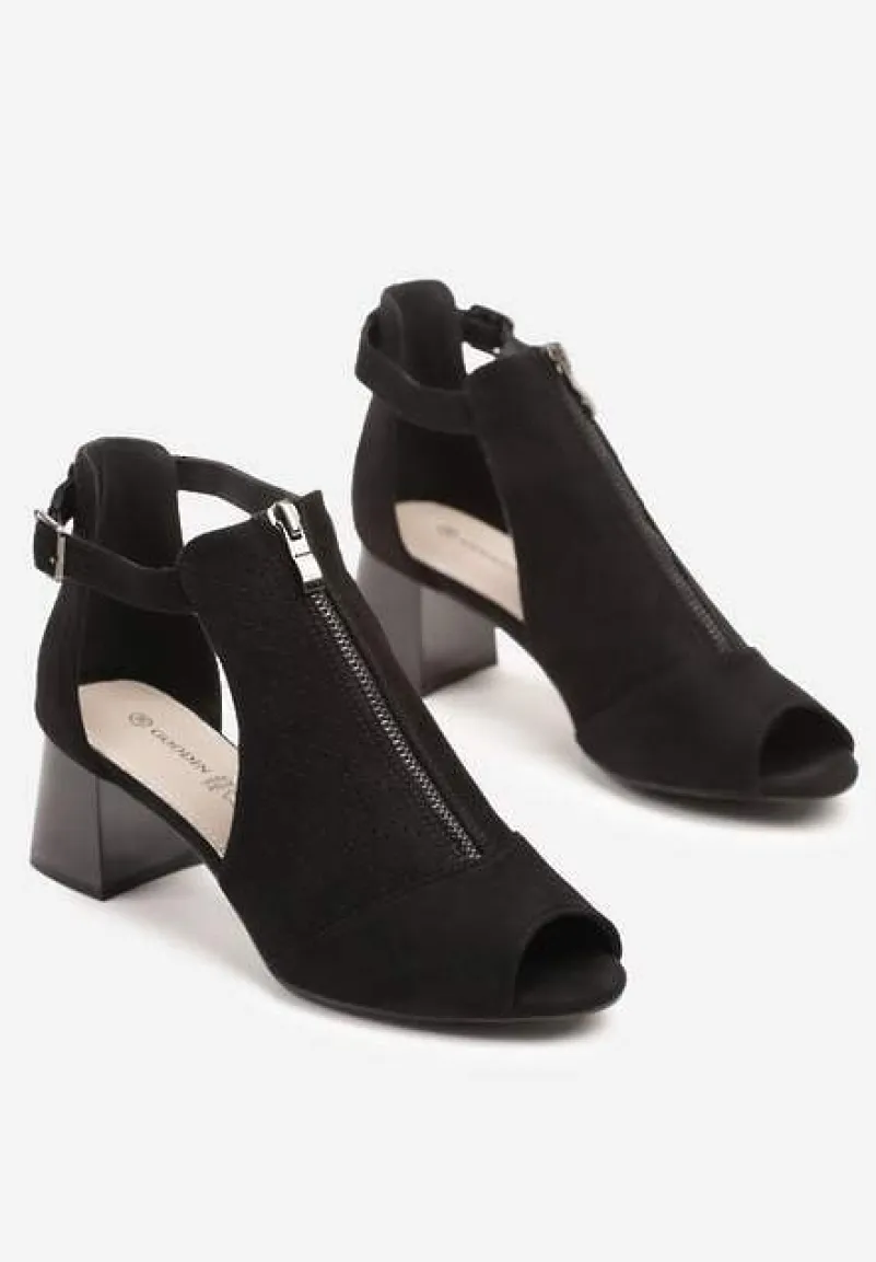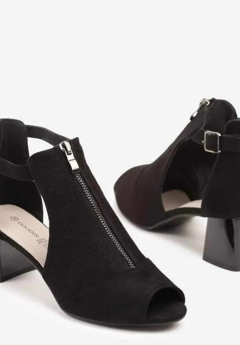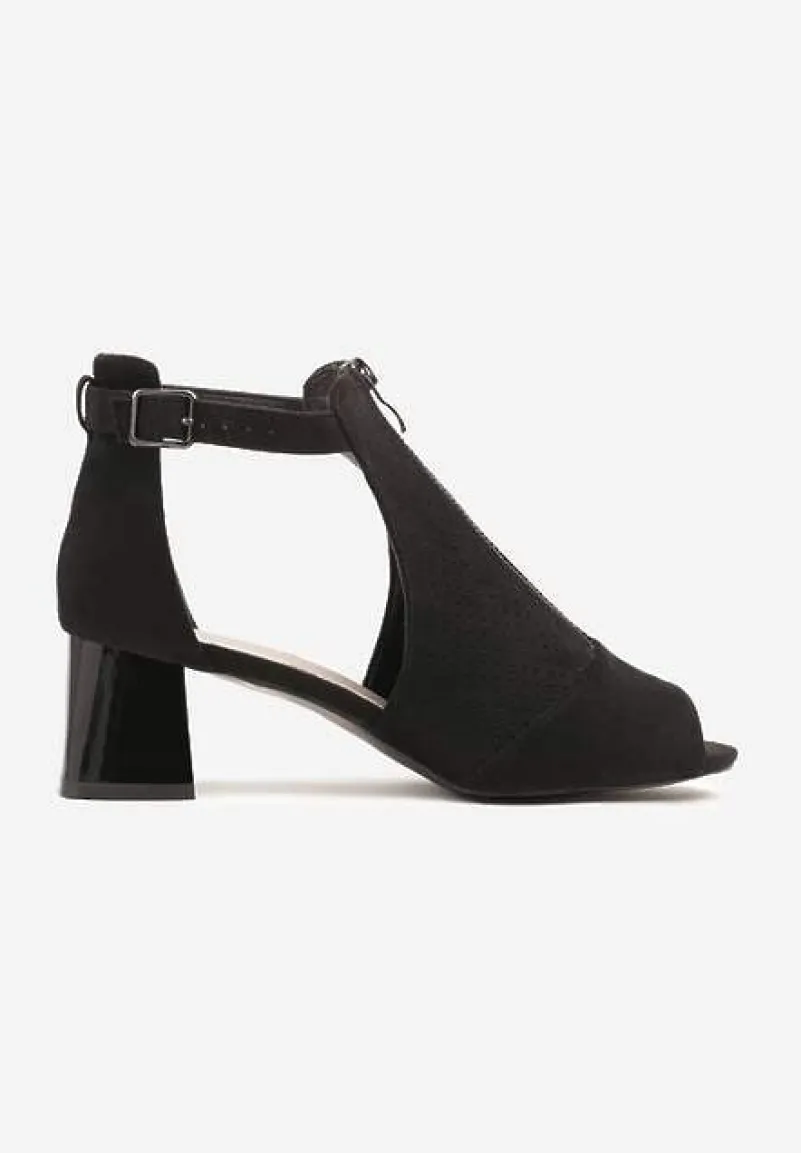 Czarne Sandały na Słupku ze Skórzaną Wkładką Ozdobione Suwakiem i Perforacją Ciaralira