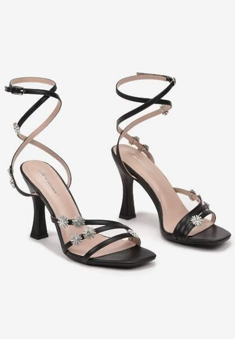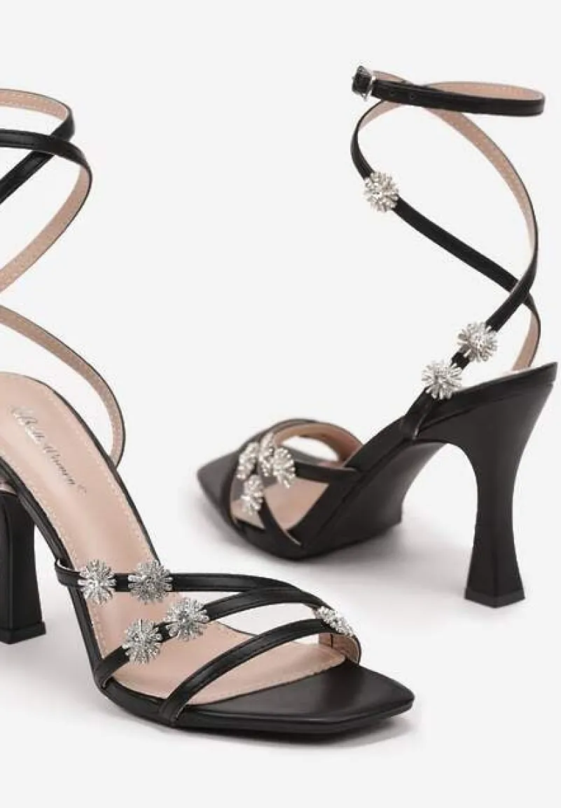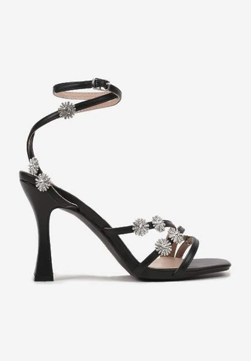Czarne Sandały na Szpilce Zdobione Paskami i Cyrkoniowymi Aplikacjami z Kwiatami Hanariel