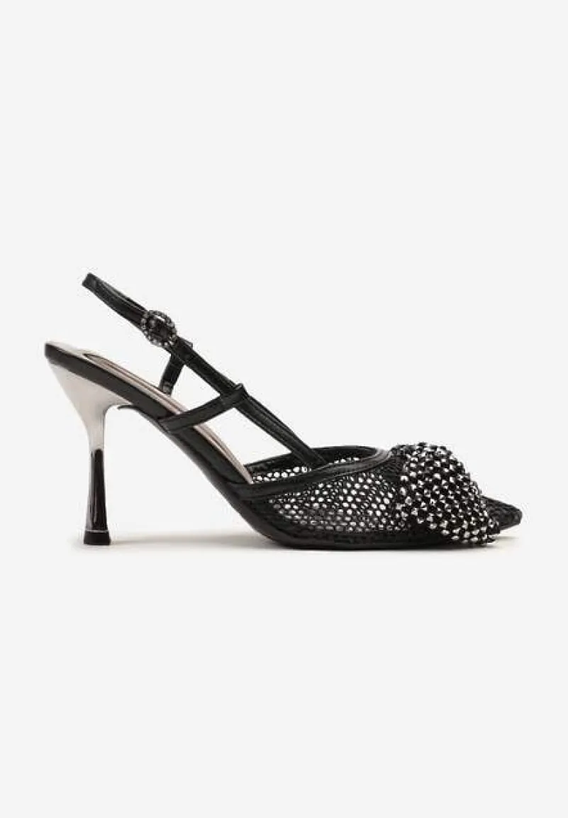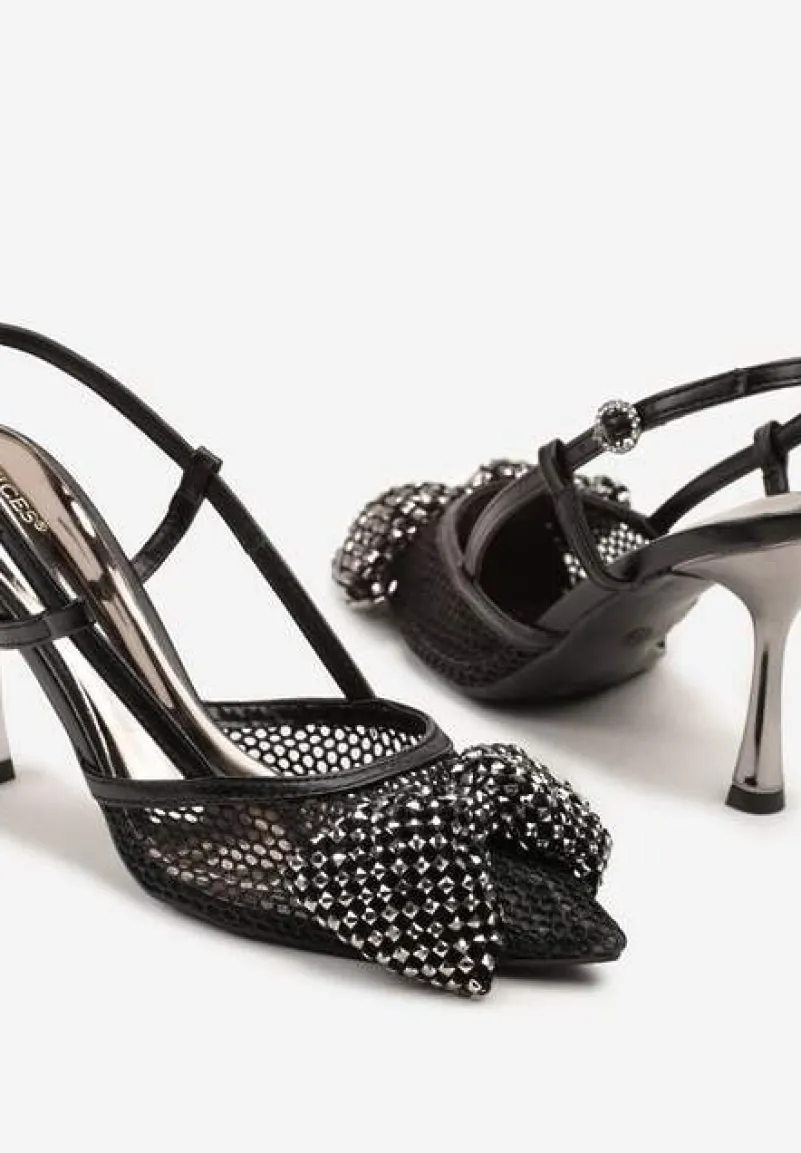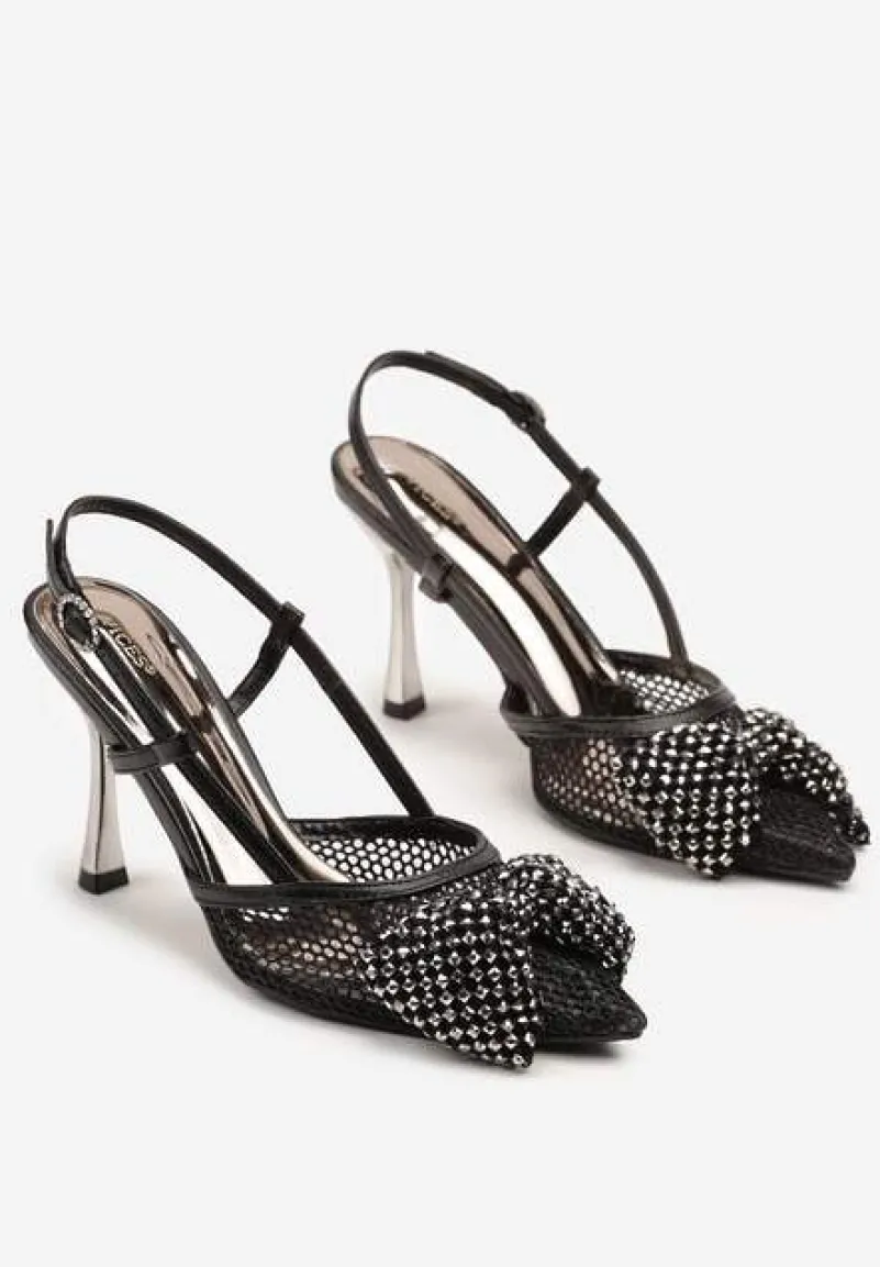 Czarne Sandały Siateczkowe Vices na Szpilce Zdobione Kokardą i Cekinami Reandra